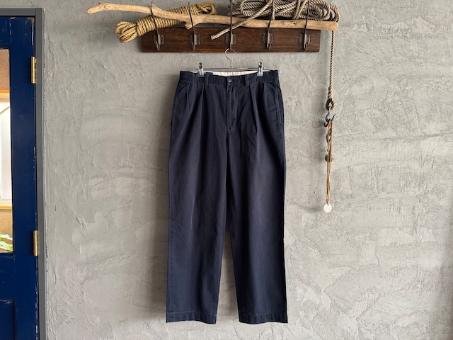 ブランド / ラルフローレン 年代 / 2000年代〜 生産国 / マカウ 素材 / コットン100% カラー / ネイビー 状態 / 裾に若干の汚れがございます。画像13 ポイント/ 2タックでゆとりがあり、とても履きやすいアンドリューシリーズ。 表記サイズ 32×30 実寸サイズ 総丈 105.5cm(アウトシームに沿って計測) ウエスト 84cm 股上 30.5cm 股下 75.5cm(インシームに沿って計測) わたり 33cm (股下約5cm位置) 裾幅 22cm しっかりと検品はしておりますが、他にも見落としてしまってるシミ、汚れなどもあるかもしれませんので、ヴィンテージにご理解のある方のみのご購入でお願いします。