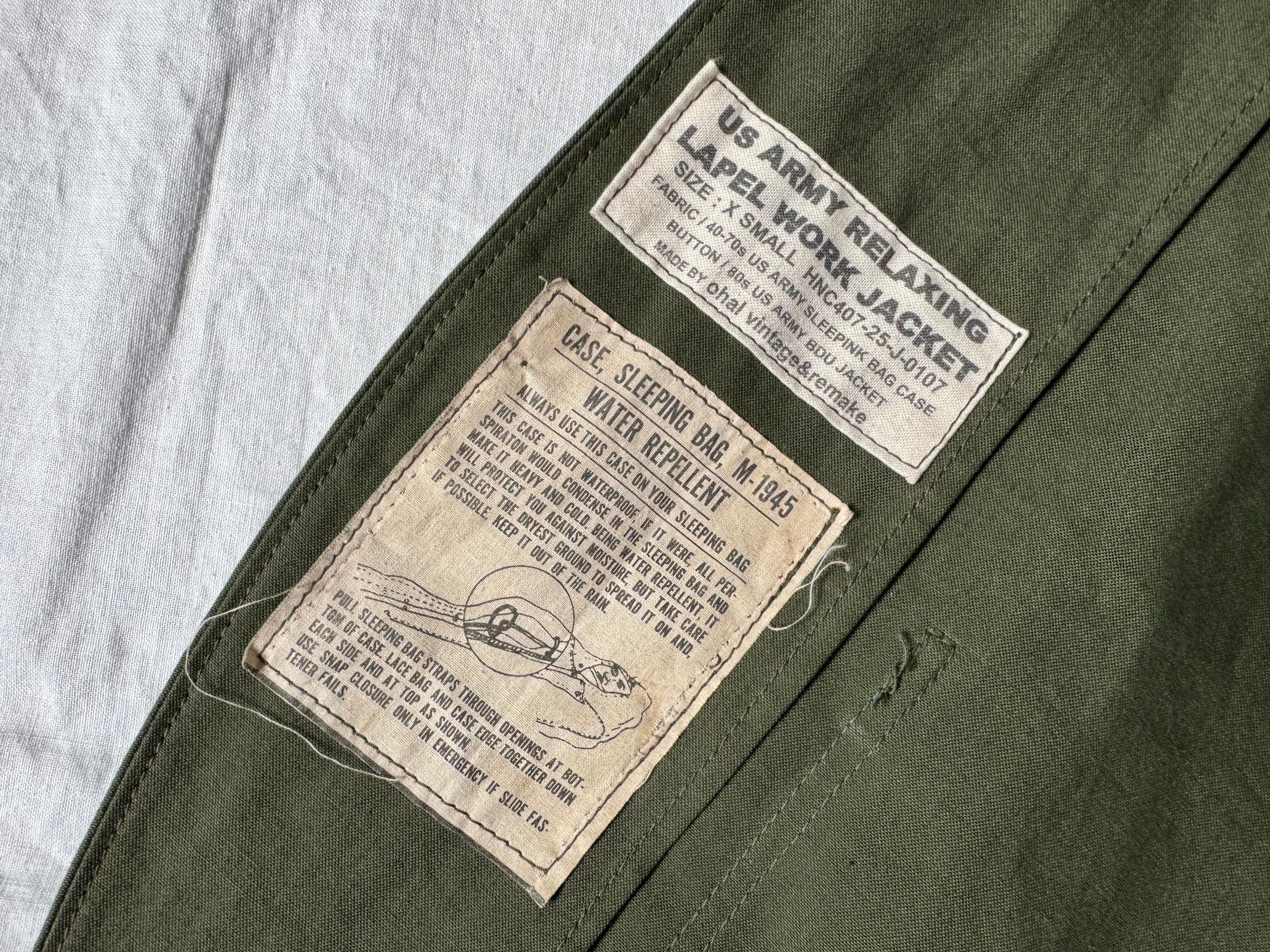 当店で販売している同じスリーピングバッグケースで作ったUS ARMY RELAXING TUCK TROUSERSとセットアップで着用してもグッドです。(全て違う個体で作成しているため、微妙に色が違います。完璧なセットアップをお求めの方は推奨いたしません。)