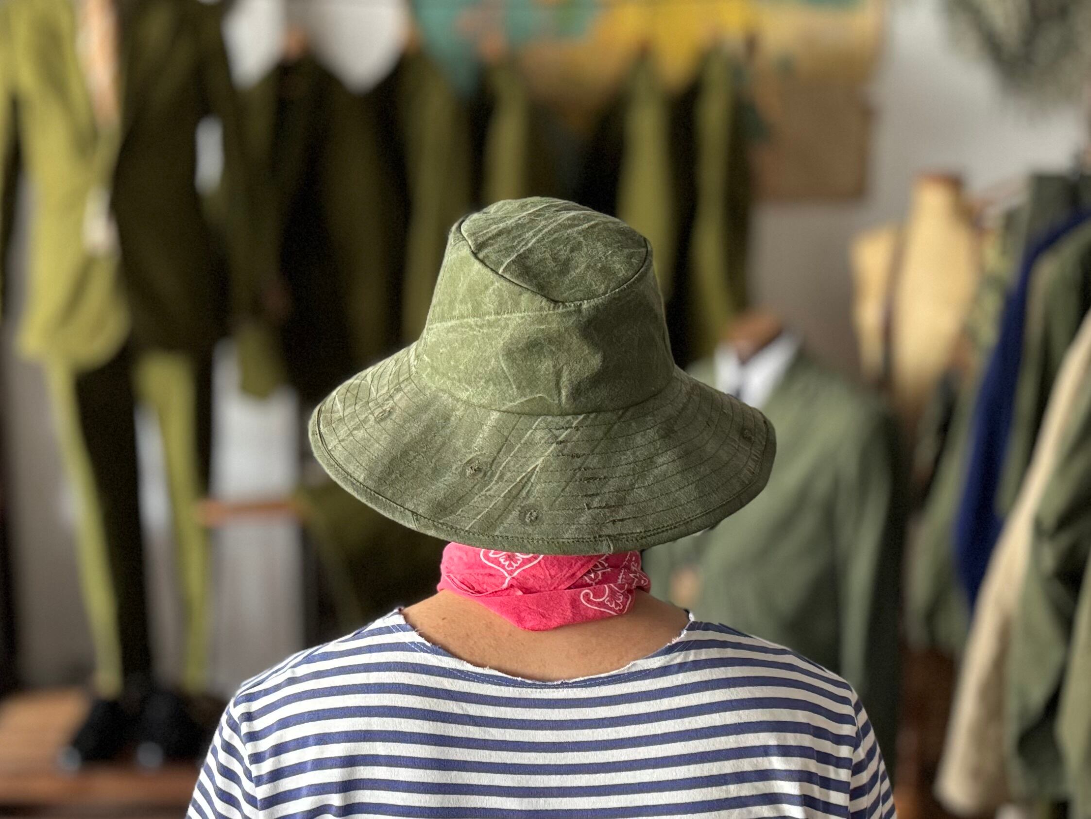 デザインは、広めのブリム(つば)にやや下向きの角度をつけ、トップクラウンは楕円形に仕立てました。長めに取ったブリム(ツバ)が特徴で、日差しの強い夏でも首元までしっかりカバーしてくれる頼れる形。