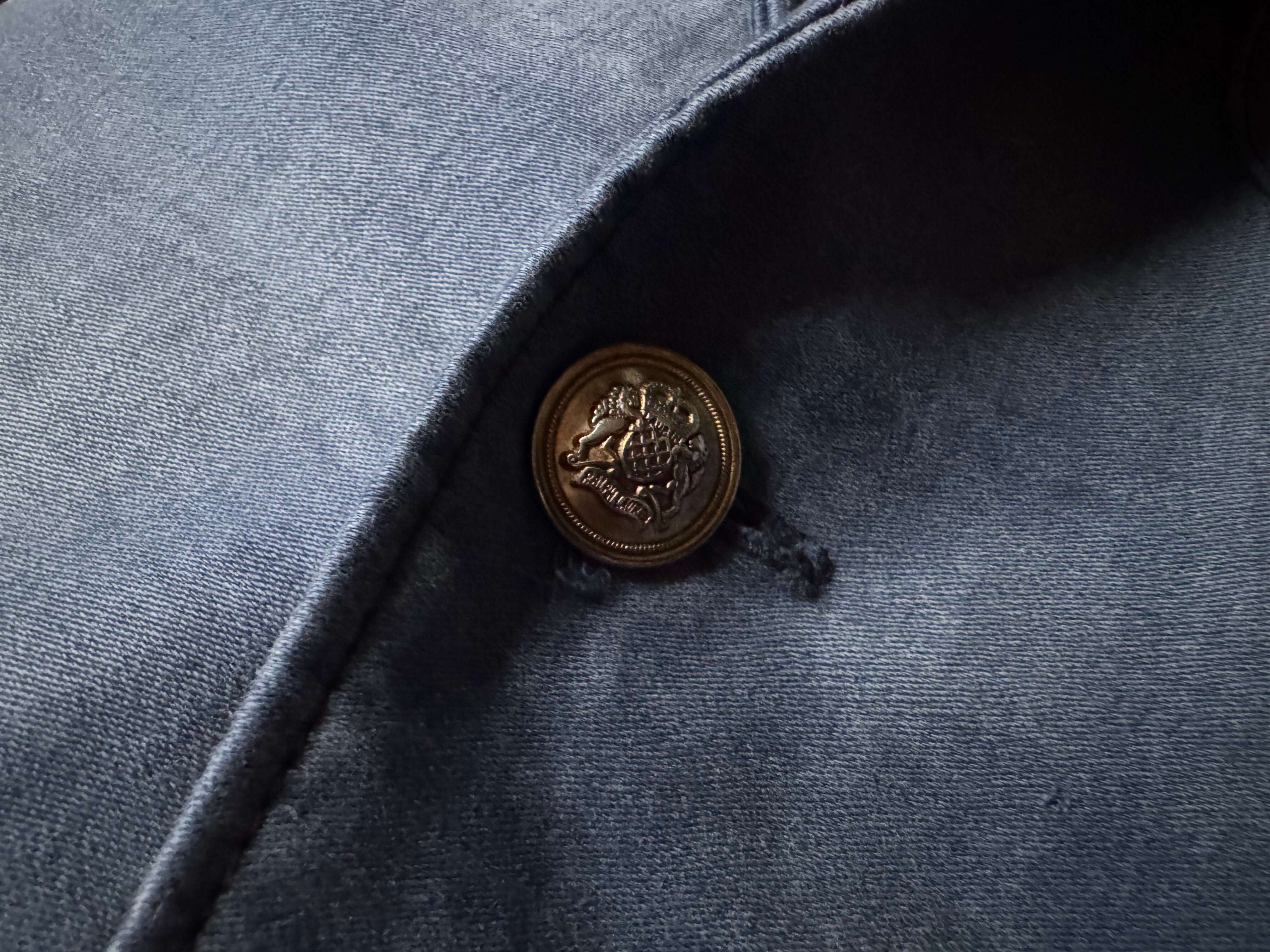 ボタンには、90年代のラルフローレンのジャケットから外した、主張しすぎない上品な金ボタンを使用。アップで見ると、さりげなく『Ralph Lauren』の刻印入りです。
