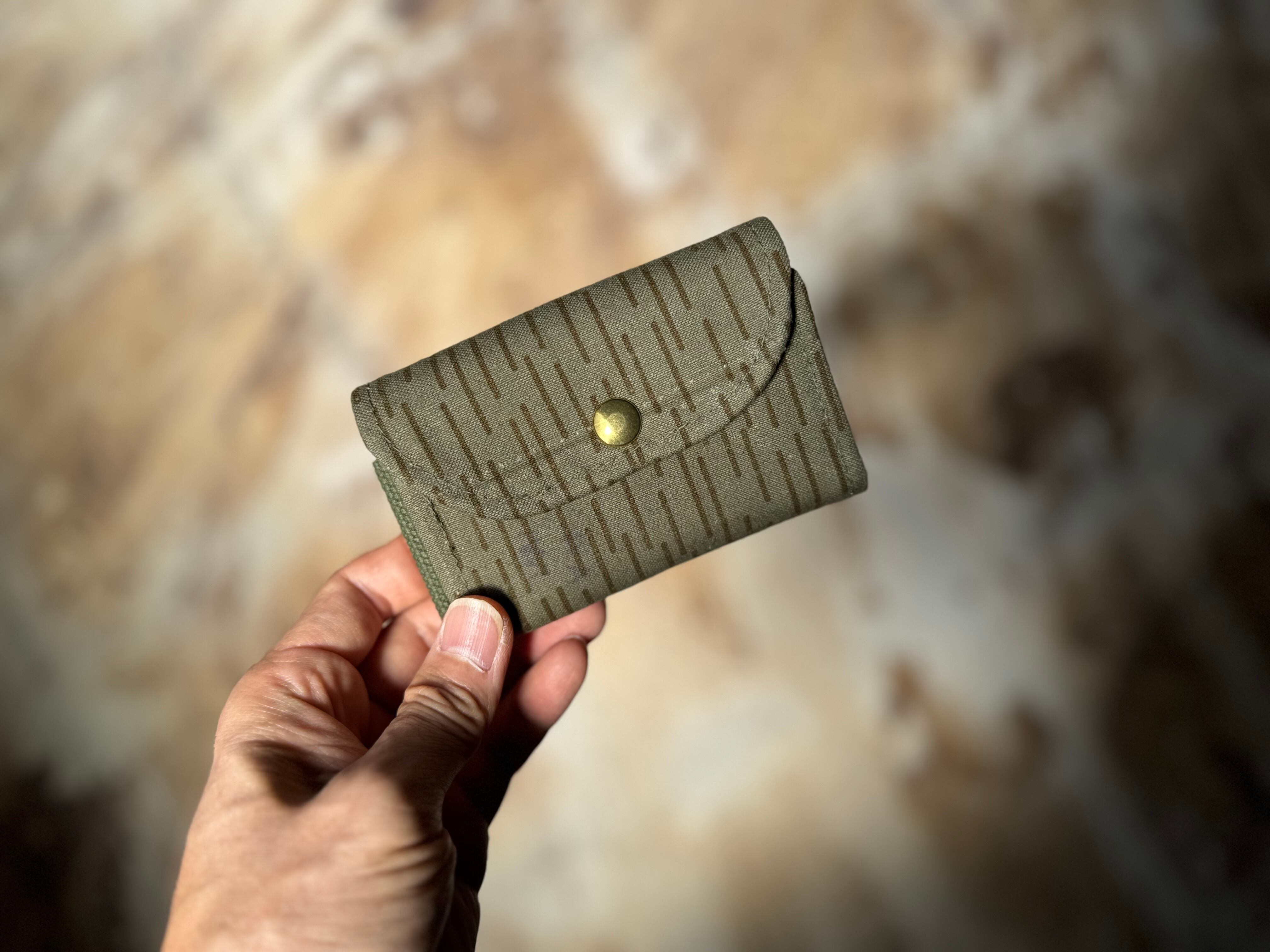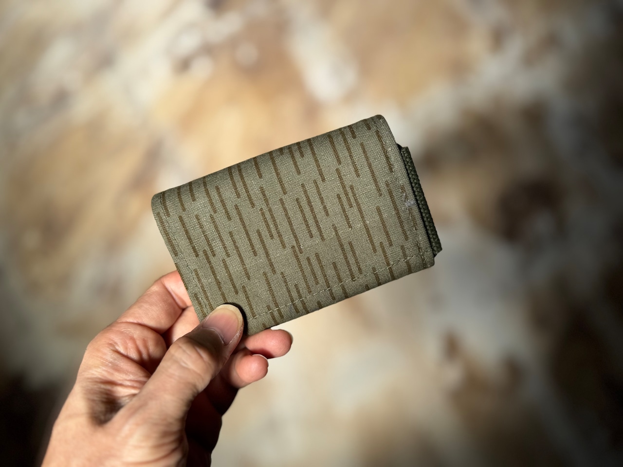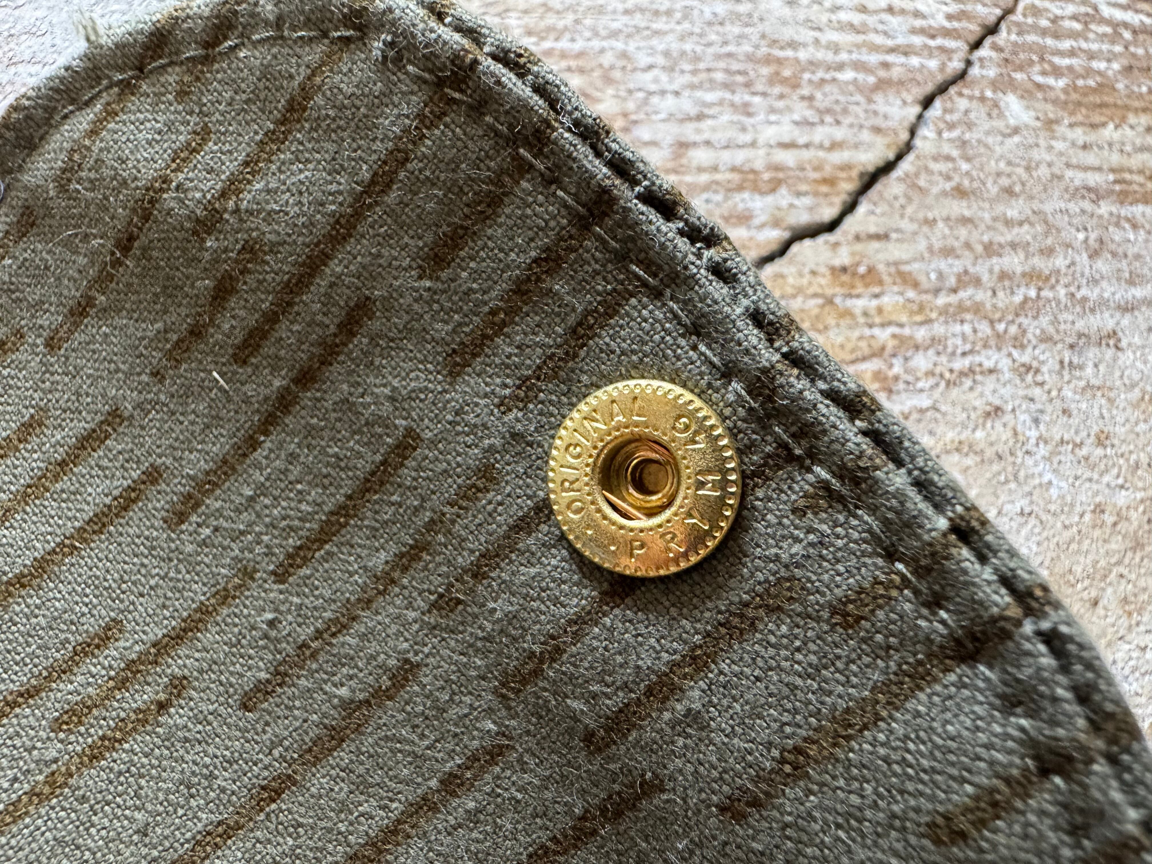 使用している生地は、旧東ドイツ軍(NVA)で使用されていた、レインドロップカモ(通称しずく迷彩)柄のテント生地。レインドロップカモの無機質な縦線模様がモダンな雰囲気を漂わせています。裏面にうっすらとステンシルが残っています。
