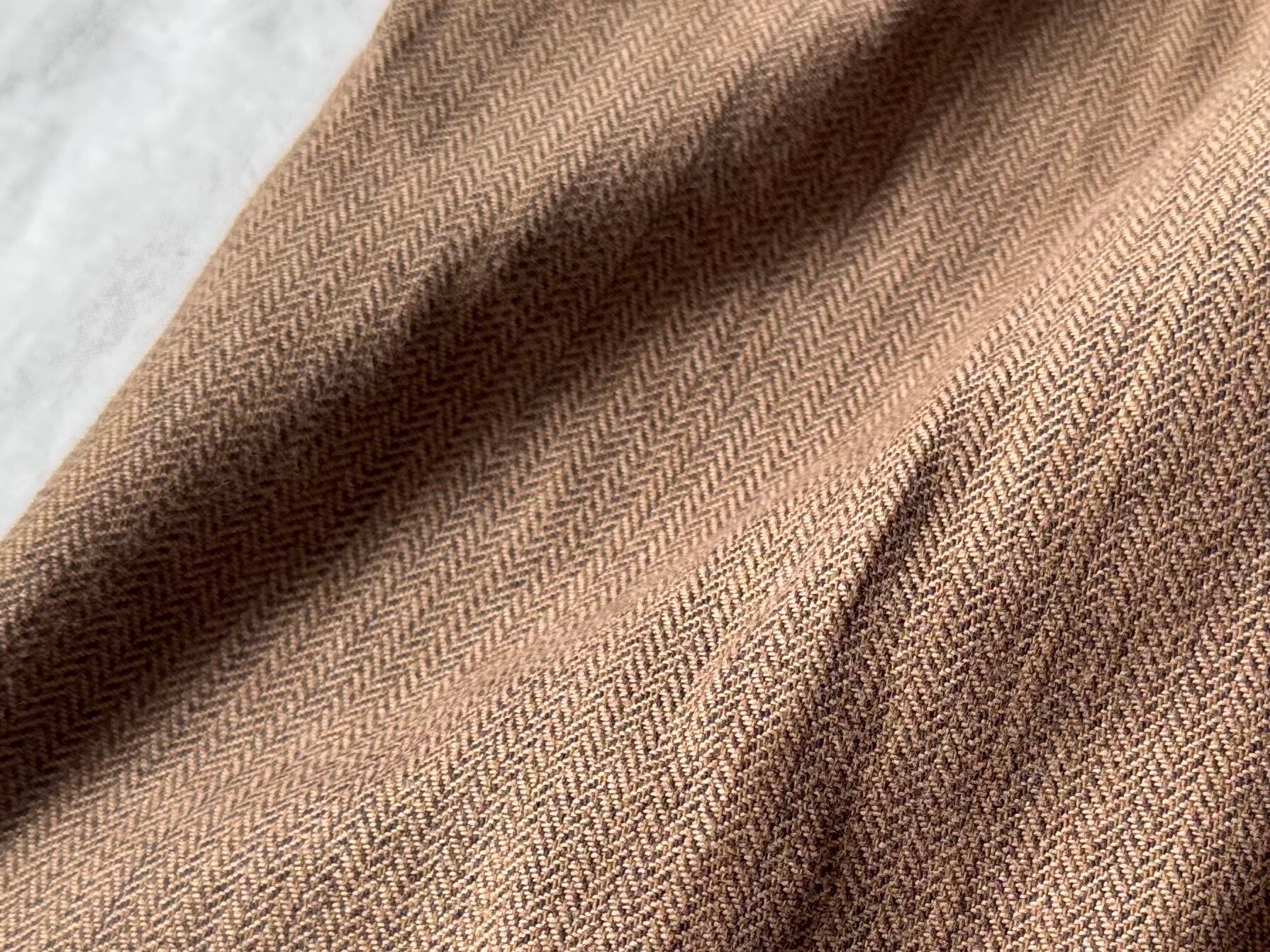 深みのある秋らしいカラーで、晩夏から冬まで幅広いシーズンに対応。2タックによる程よいゆとりが、快適な穿き心地とクラシックなシルエットを演出します。しっかりとしたヘリンボーン生地は、上品さとカジュアルさを兼ね備え、幅広いスタイリングにマッチします。