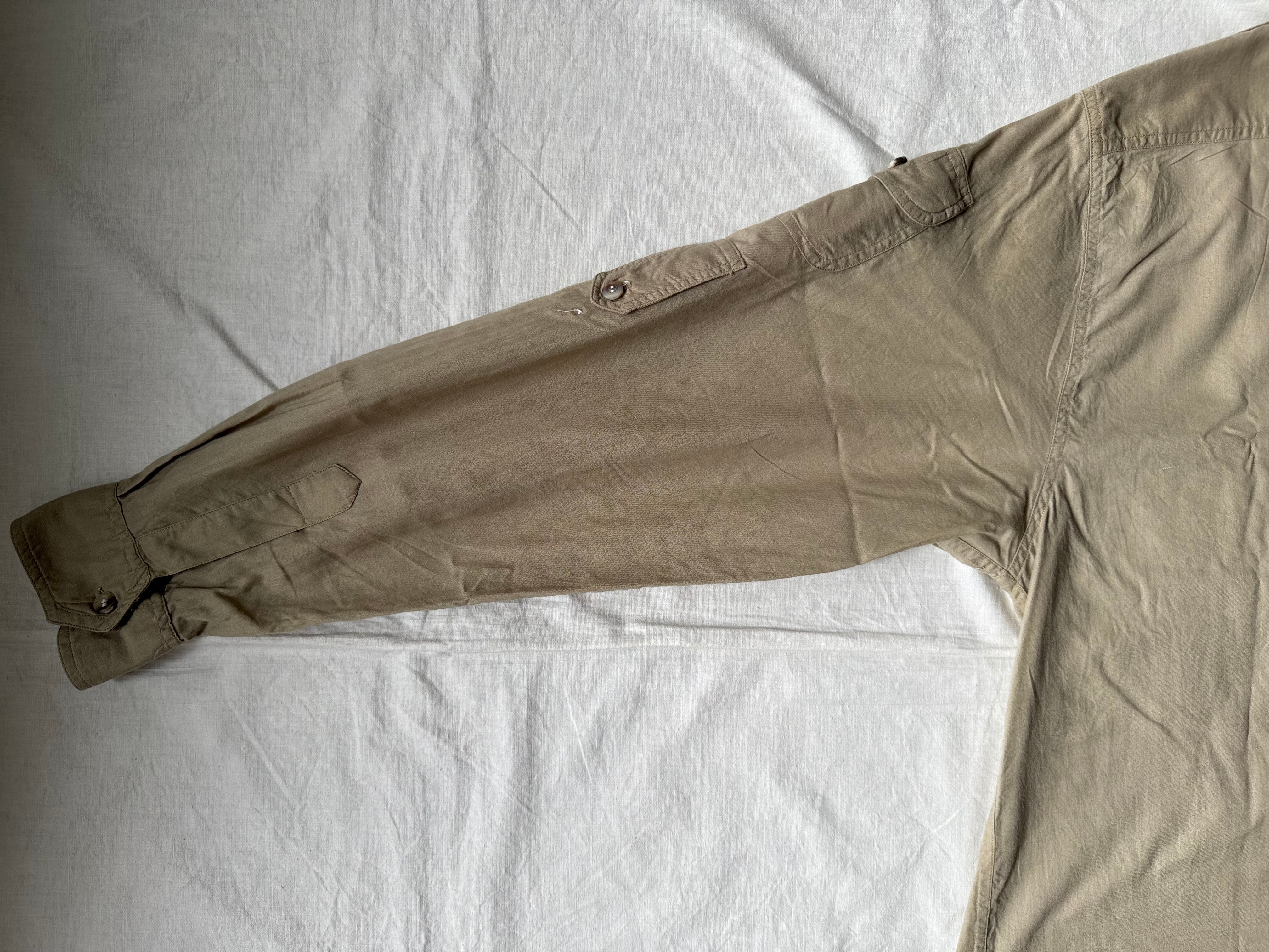 薄手のコットン100%生地を使用し、軽やかで通気性の良い着心地が魅力です。両袖の二の腕部分には小さなフラップポケットを配置し、フロントには右胸に1つ、左胸に縦に2つ並んだ計3つのポケットを備えたユニークなデザイン。80年代バナナリパブリックらしい、機能性と遊び心を兼ね備えたサファリスタイルを楽しめる一枚です。