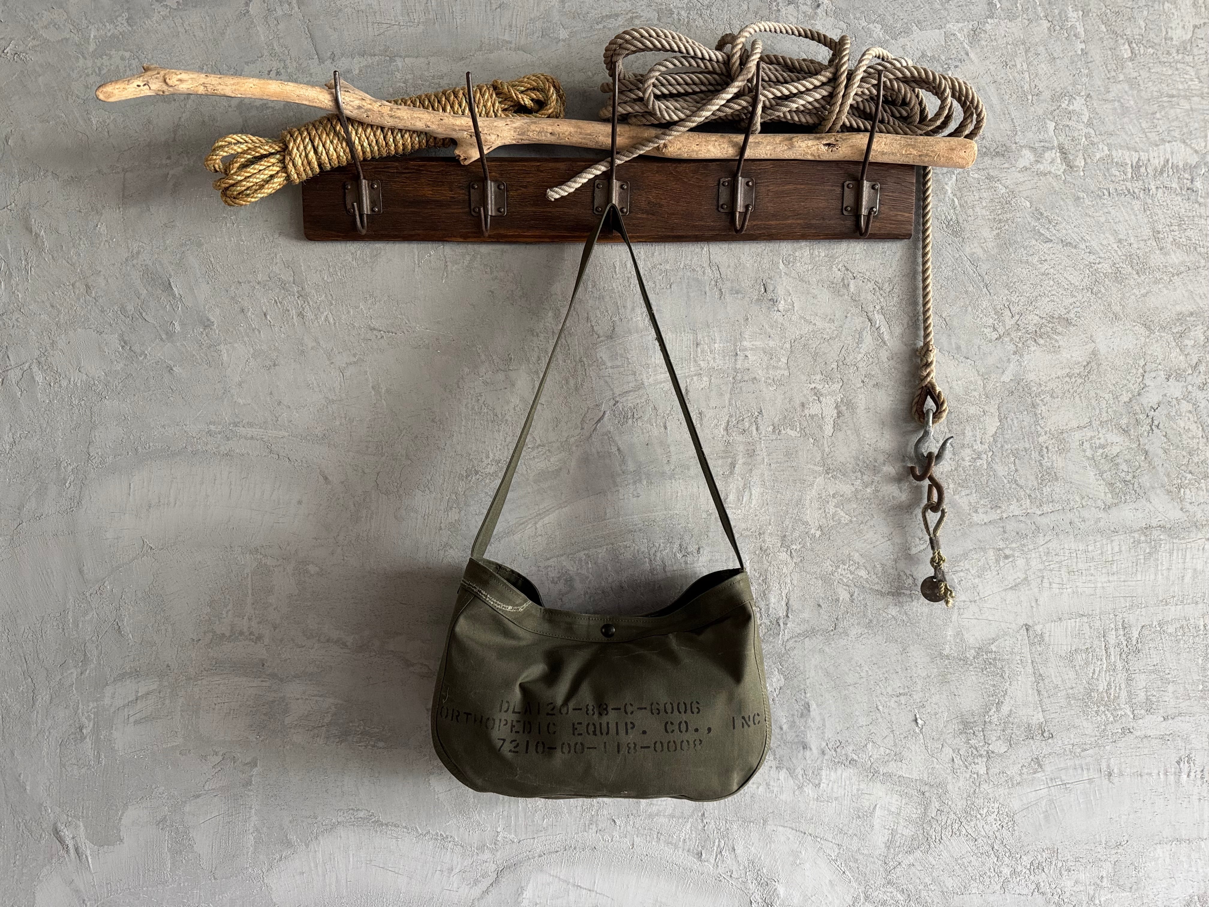 ボディには、1980年代にアメリカ軍のフォールディングベッド用コットカバーとして納入されたデッドストック生地を採用。しっかりとしたコットン素材で、カーハートなどのカバーオールに使われるダック地に近いタフな風合いです。前面には当時のステンシルが残り、83年納入品であることが確認できます。ステンシル跡や縫製跡、傷などが一点ごとの個性となり、ヴィンテージらしい魅力を引き立てています。