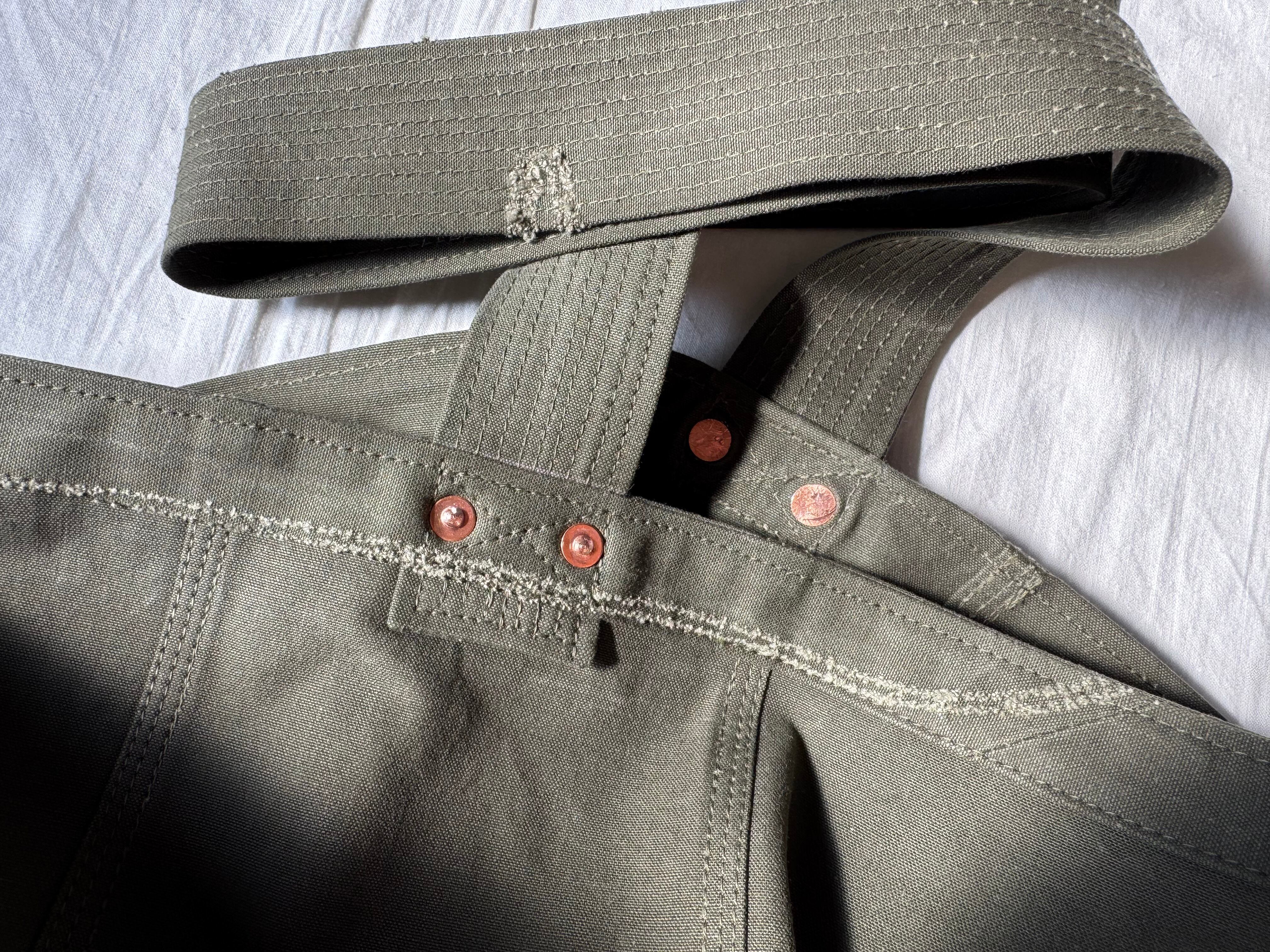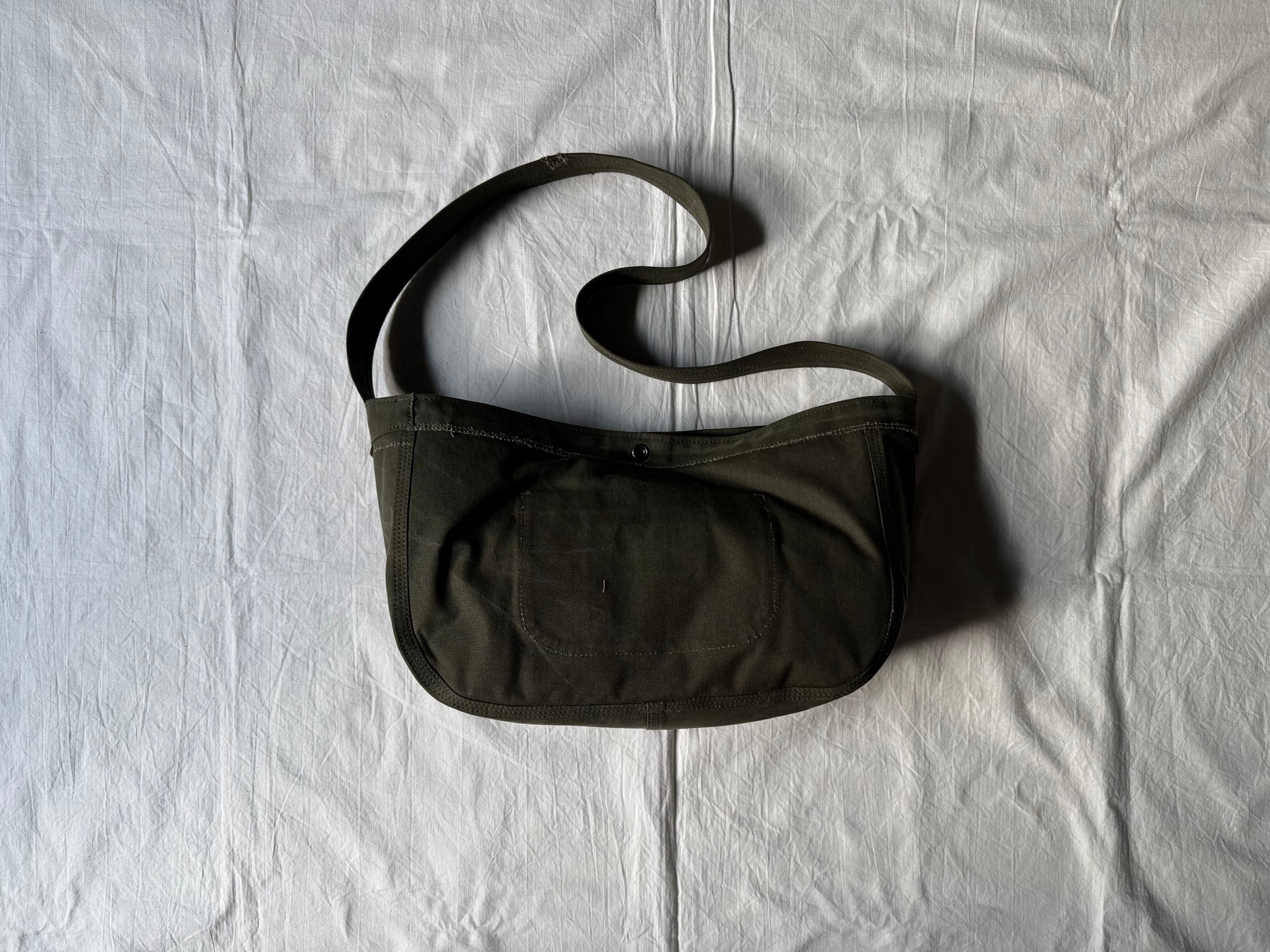 ショルダーベルトはボディと同じ個体の生地で製作。開口部のスナップボタンには、70年代にスコービル社が米軍に納入したデッドストック「DOT」刻印入りボタンを使用し、細部までこだわった仕上がりに。内側には使い勝手の良い大きめのポケットを1室備えています。