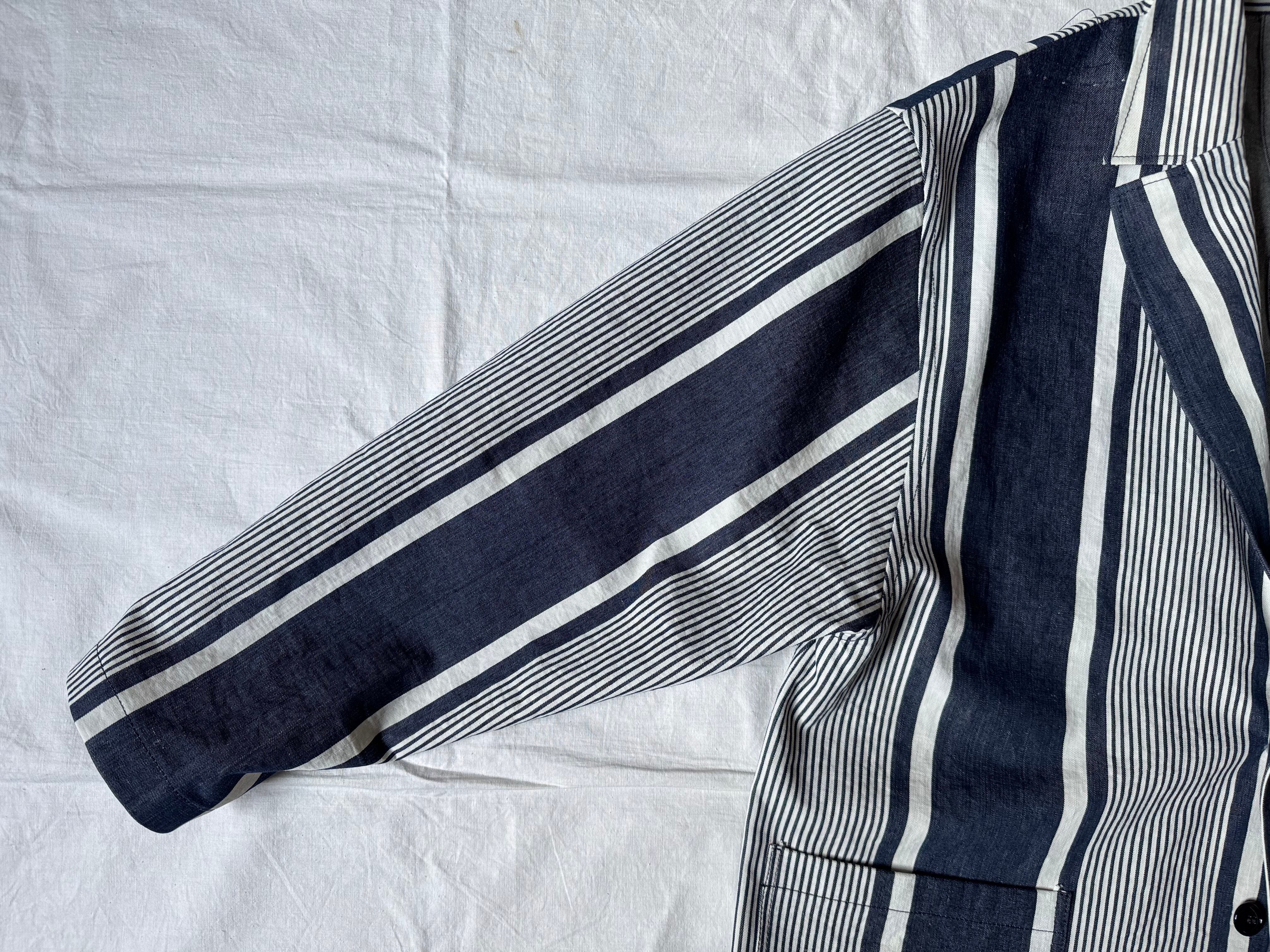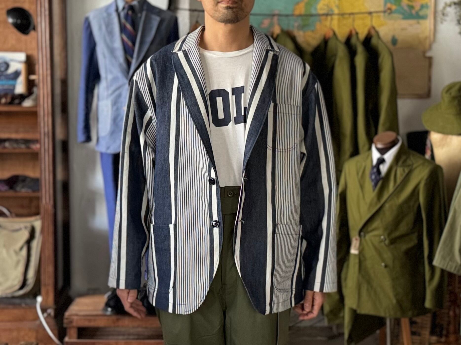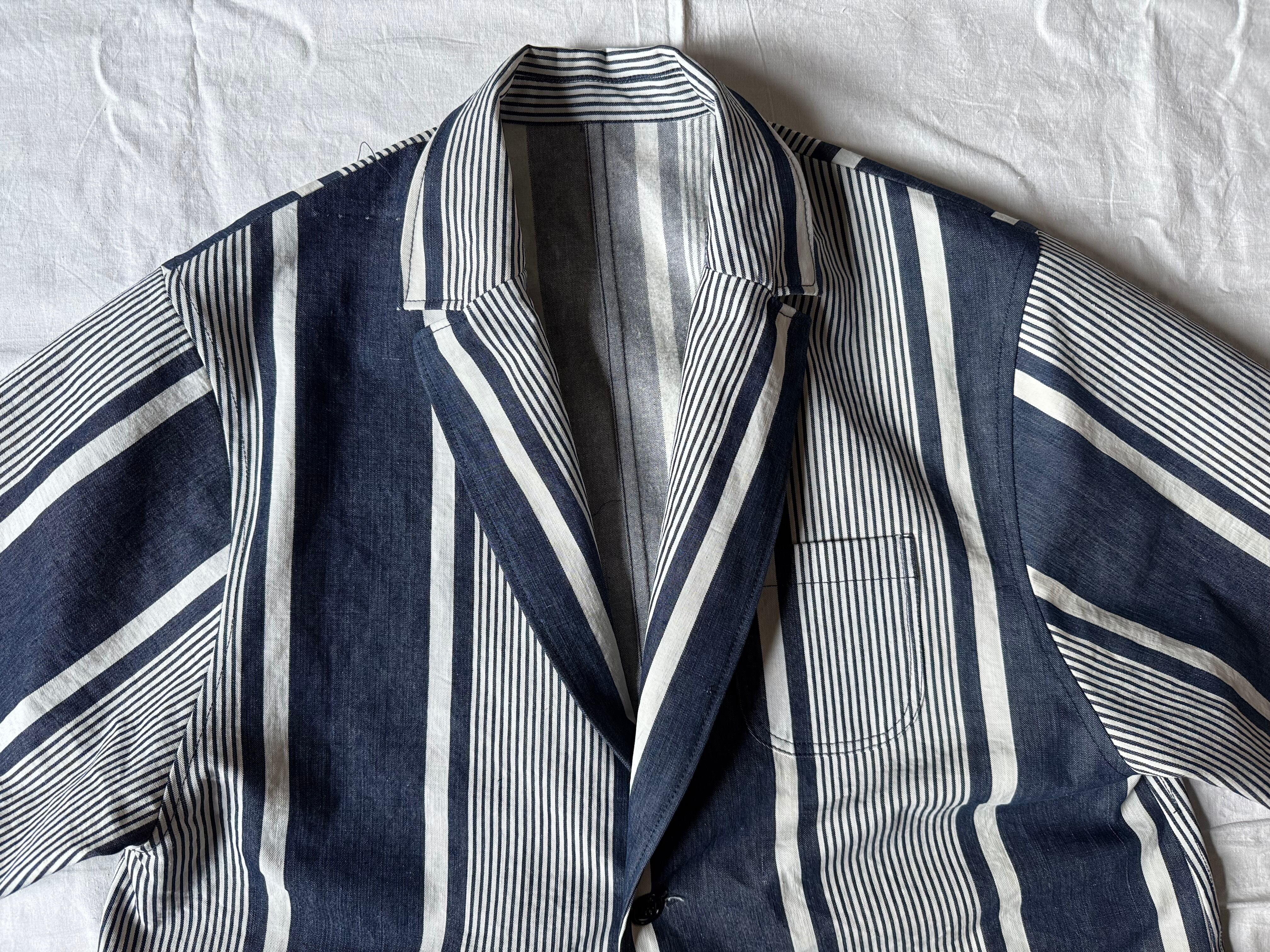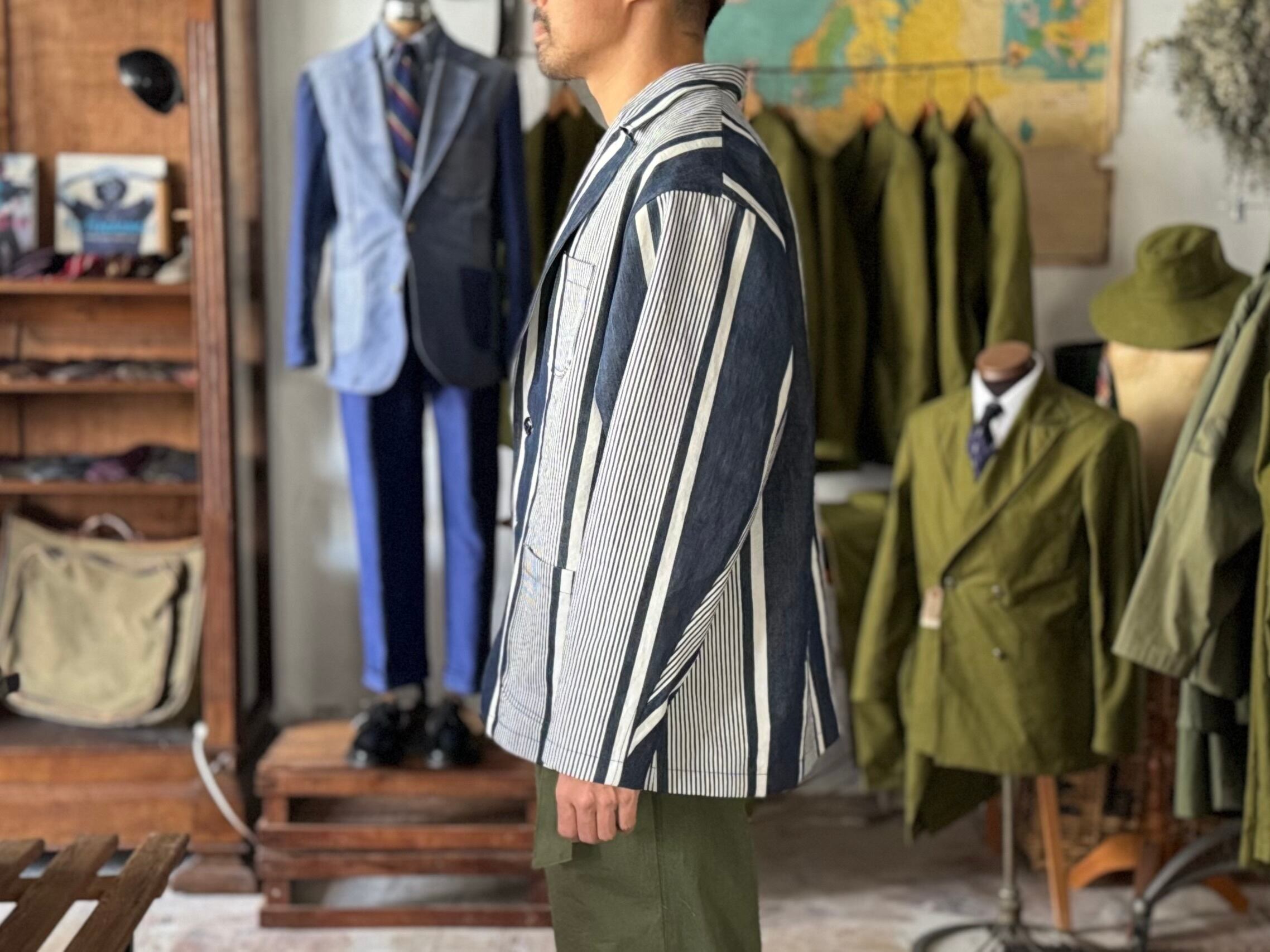 20枚目の画像のように当店で販売している同じティッキングファブリックで作ったANTIQUE FRENCH TICKING TUCK WIDE TROUSERSとセットアップで着用してもグッドです。