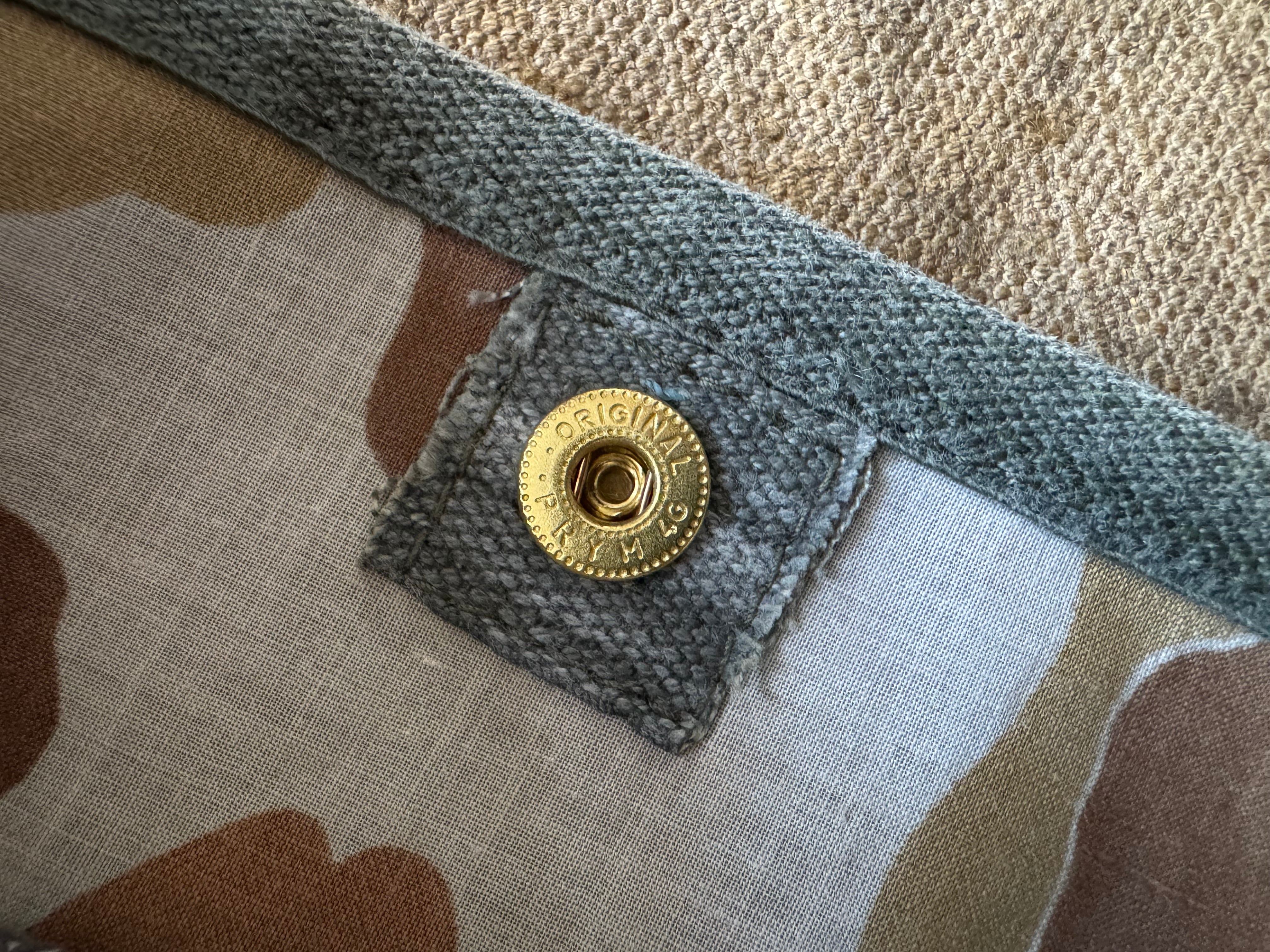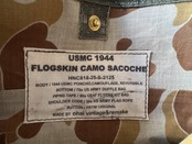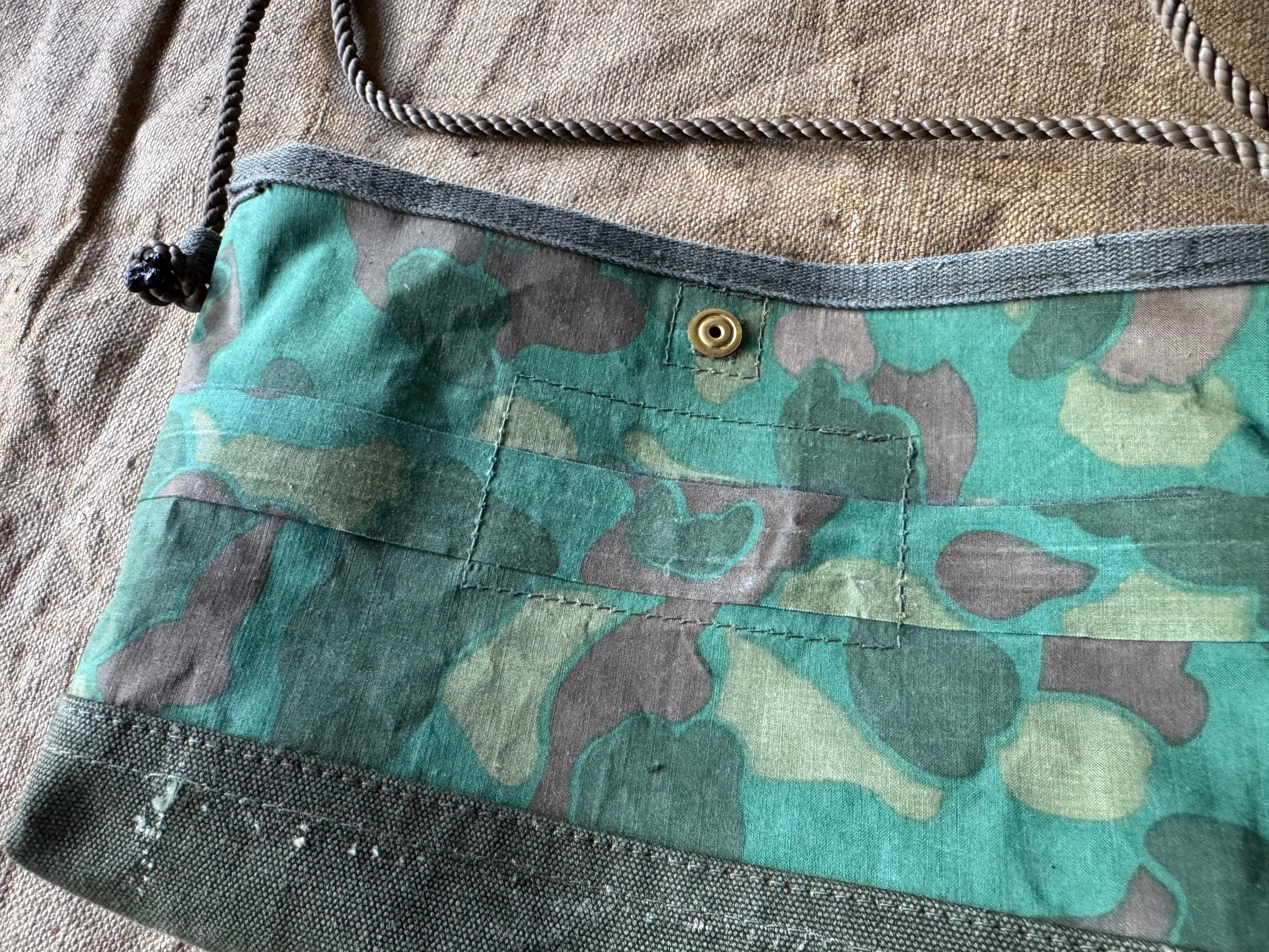 ボディーは1944年、USMC(アメリカ海兵隊)のフロッグスキンカモ柄のポンチョを使用。裏側は砂漠地帯の茶系のカモがプリントされてます。表面には、撥水加工のラバーコーティングがされ、ゴワゴワした硬めの生地で、多少の雨は弾きます。