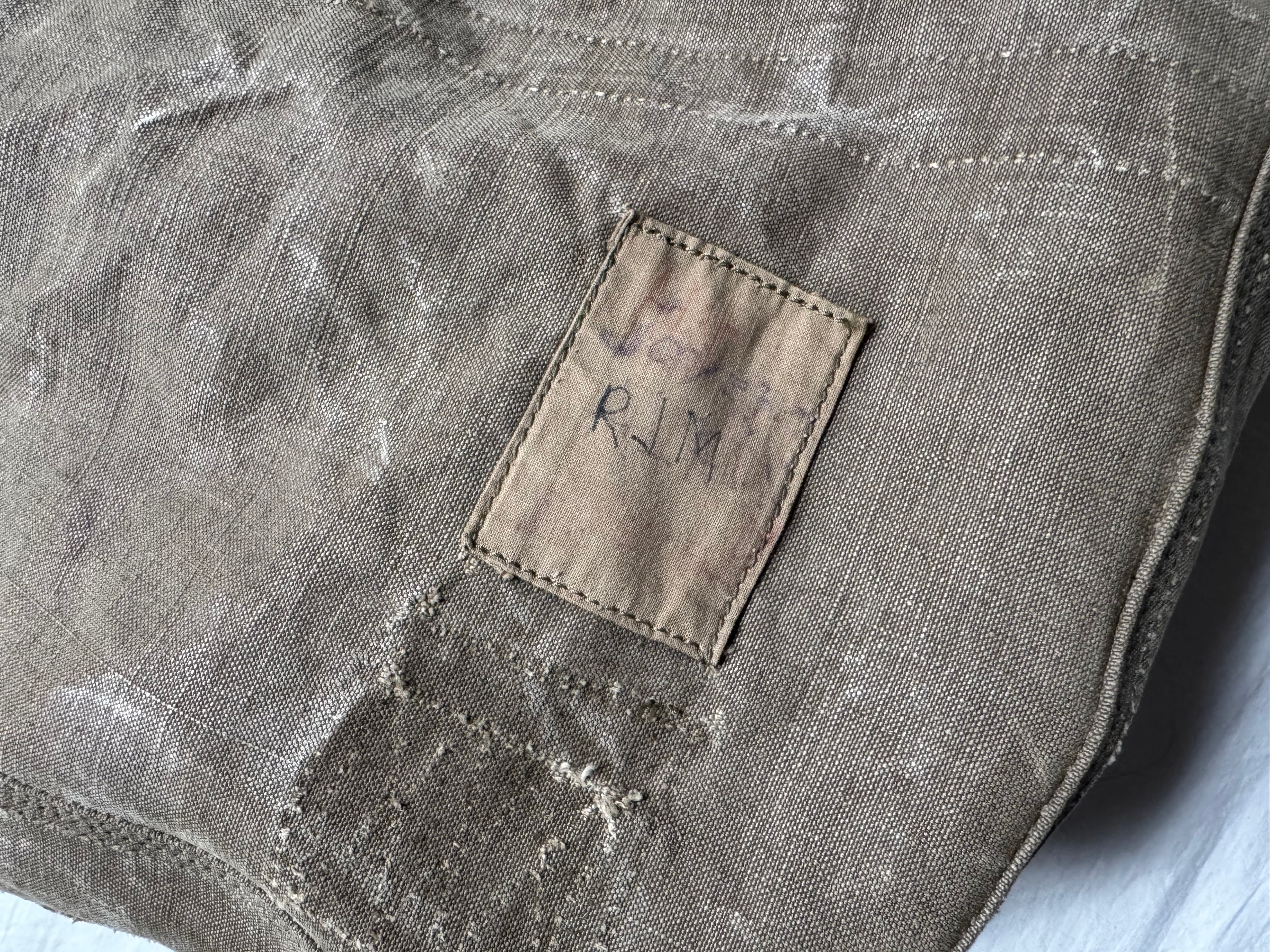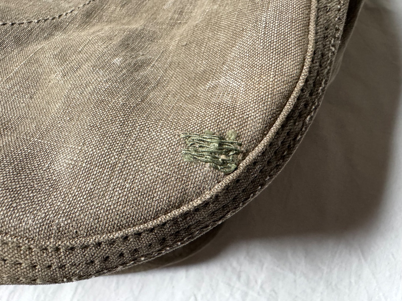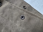 ボディーの生地は50年代頃、フランス軍のダッフルバッグ。ベージュ系のリネン素材で、独特のクタッとした素材感、そして開口部についている楕円形のハトメなど、ヴィンテージを感じさせるディテールが盛り込まれています。