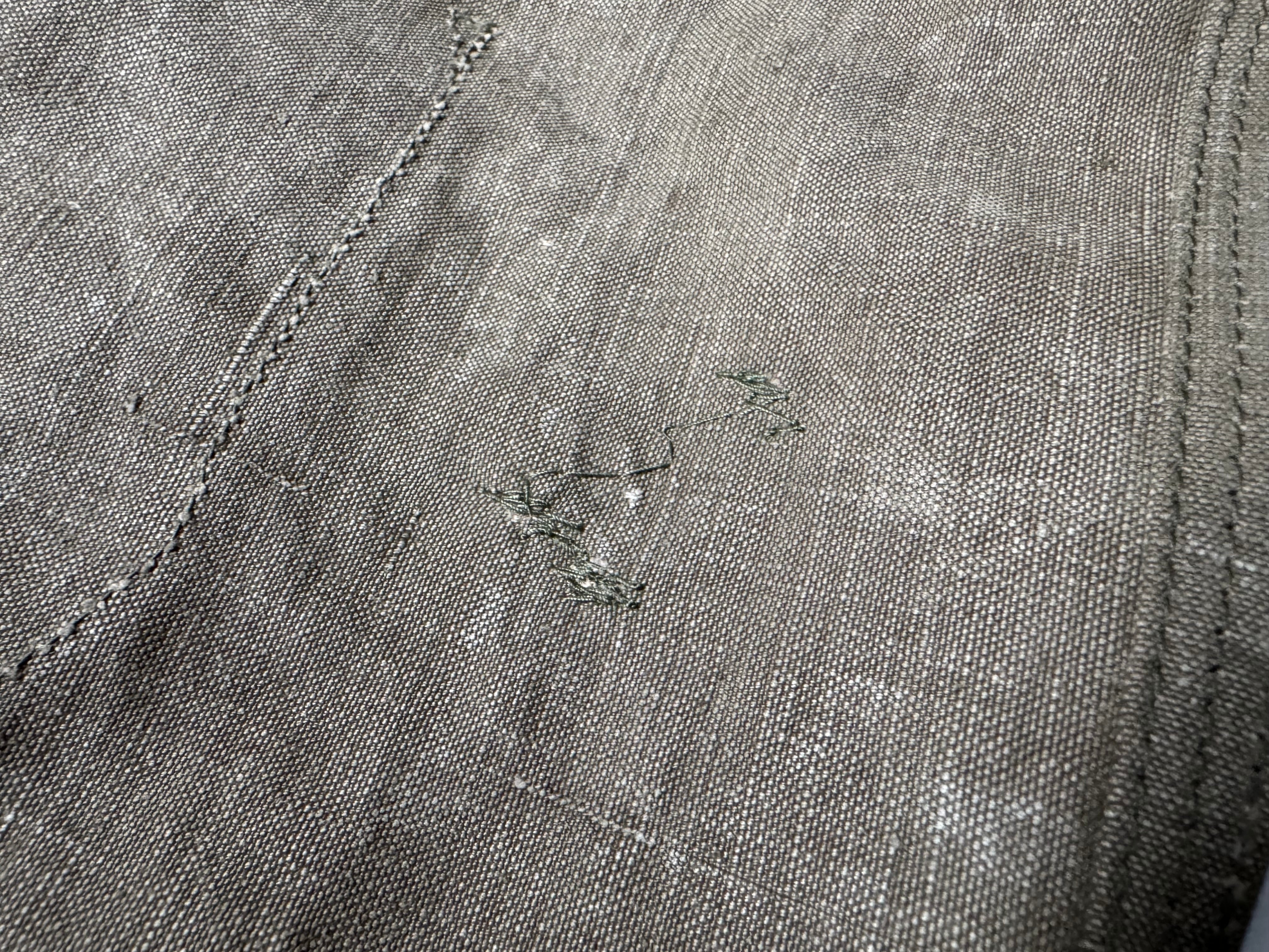 穴があいた、破れた、糸がほつれた、などのトラブルは、ヴィンテージ生地でのパッチワークや、ミシンでたたいて補修をします。ボタンやスナップボタンなどの付属品が取れてしまった、カバンのストラップがちぎれたなどの場合は、似寄りの物で対応させていただきます。