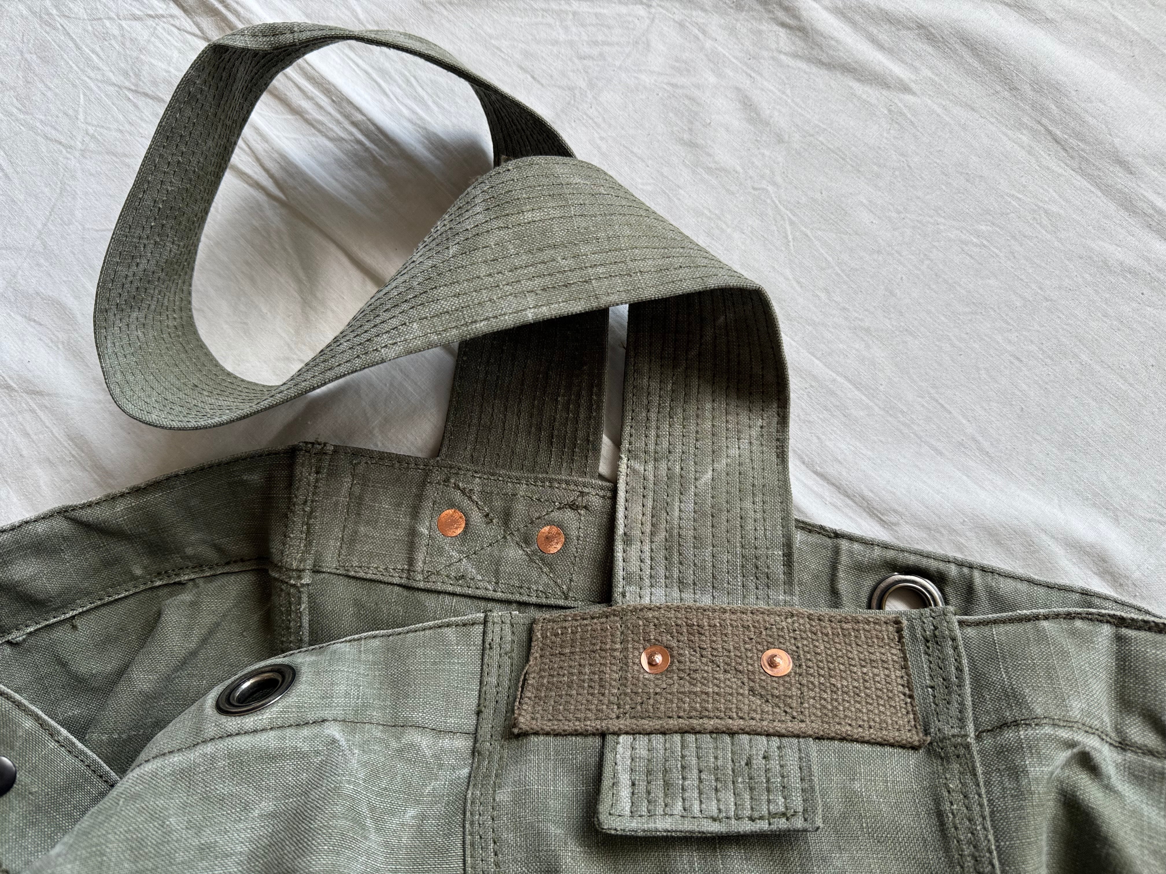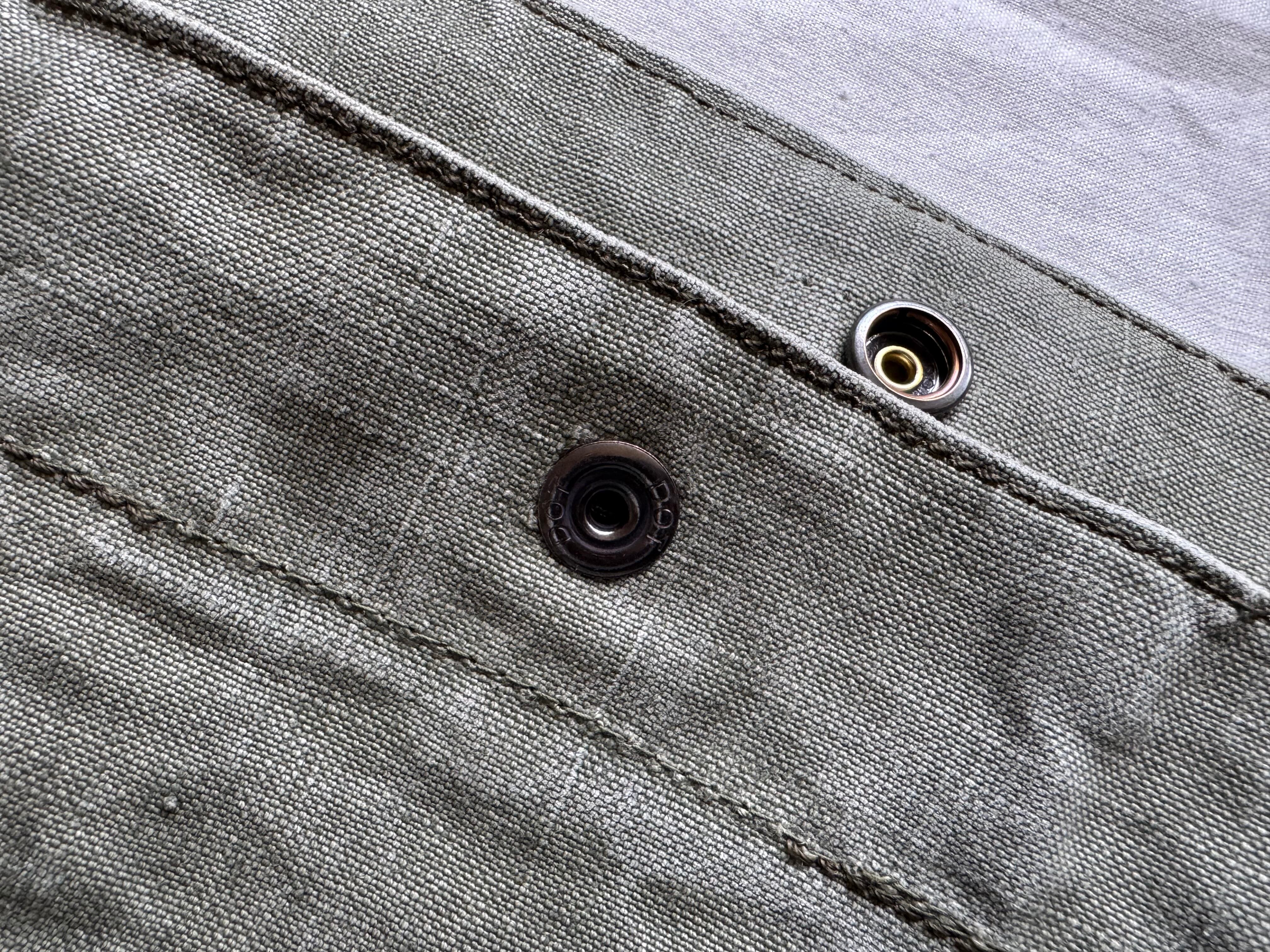ボディーの生地は80年代頃、フランス軍のダッフルバッグ。グリーン系のリネン素材で、独特のクタッとした素材感、そして開口部についているハトメなど、ヴィンテージを感じさせるディテールが盛り込まれています。