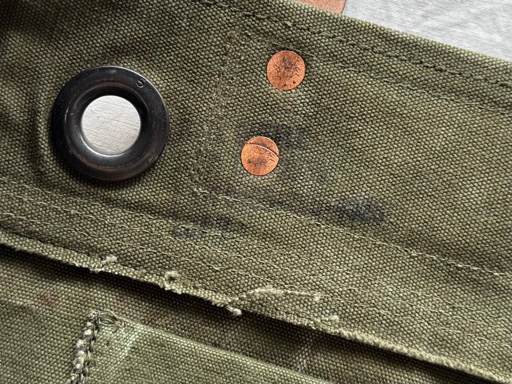 ボディーは50年代のアメリカ軍で使用されていたダッフルバッグ。ダッフルバッグの名残りを残した武骨なハトメ、前面に入った『US』ステンシル、背面には前所有者の名前らしきステンシル、開口部裏側に印字されたミルスペックなど、ヴィンテージ感満載です。
