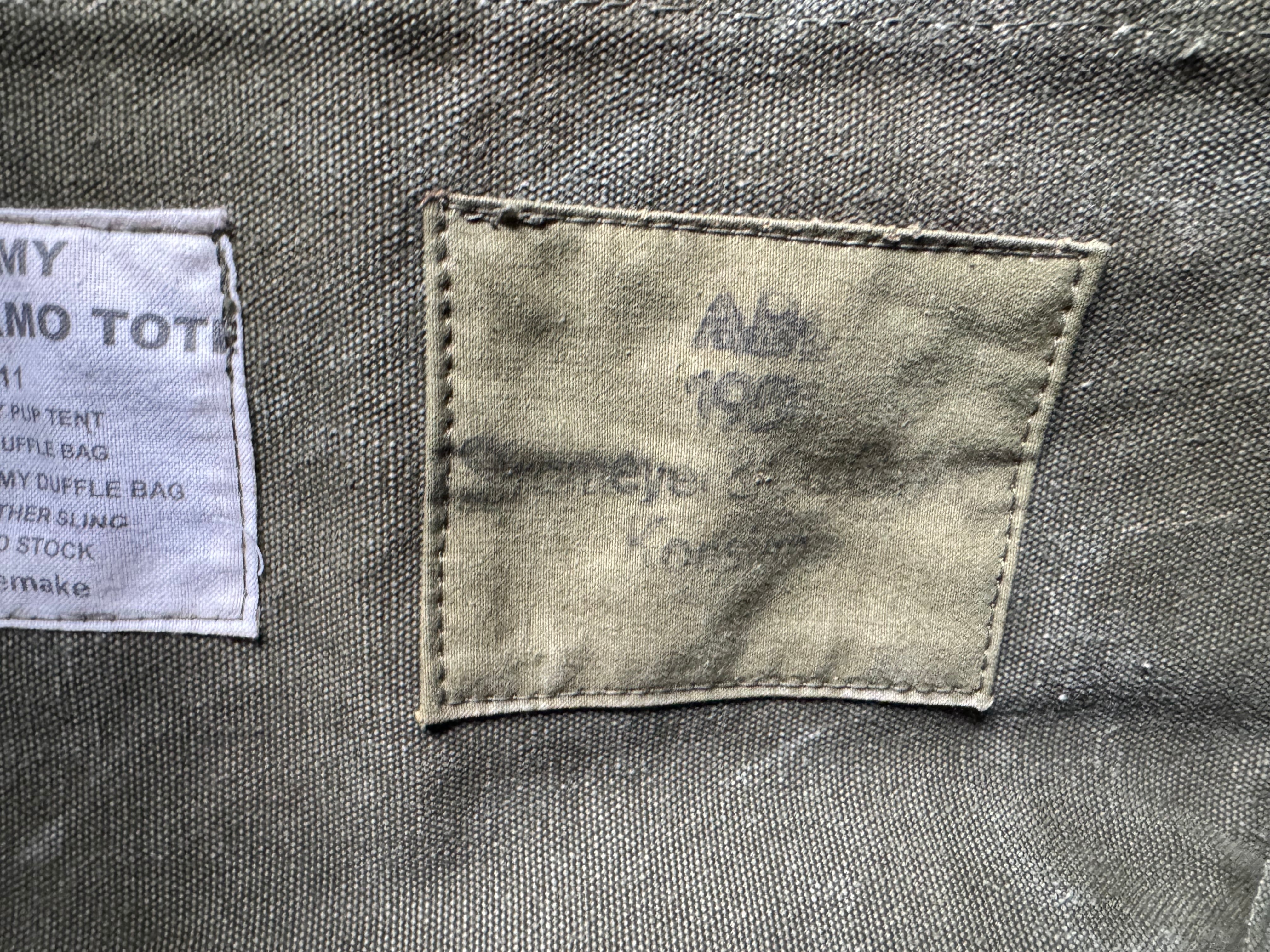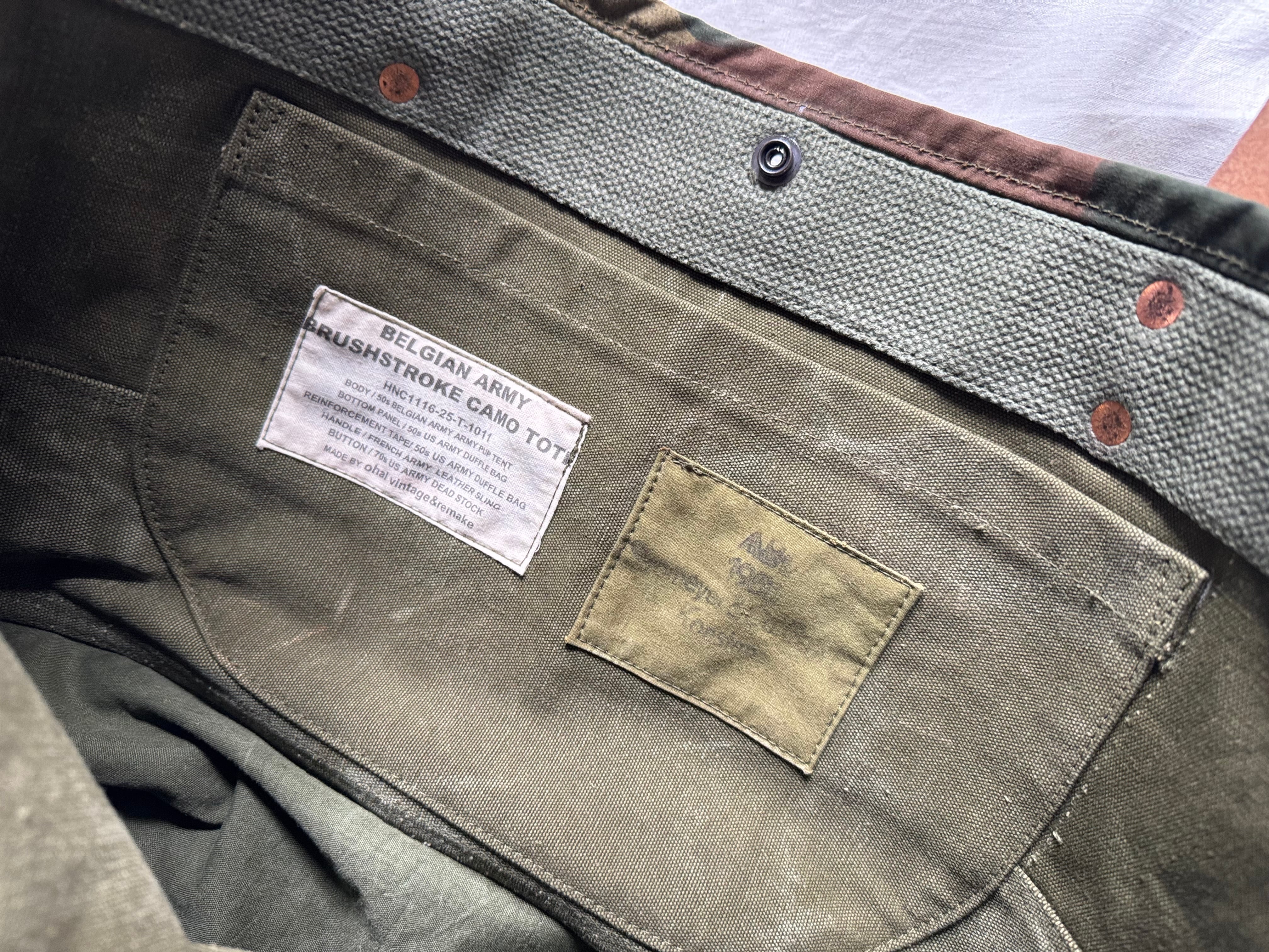 素材は1956年、ベルギー軍のブラッシュストロークカモ柄のテント生地を使用しております。この生地一枚ではトートバッグとして強度が不安なため、内側、ボトムには50年代アメリカ軍のダッフルバッグの生地を使用して補強し、
