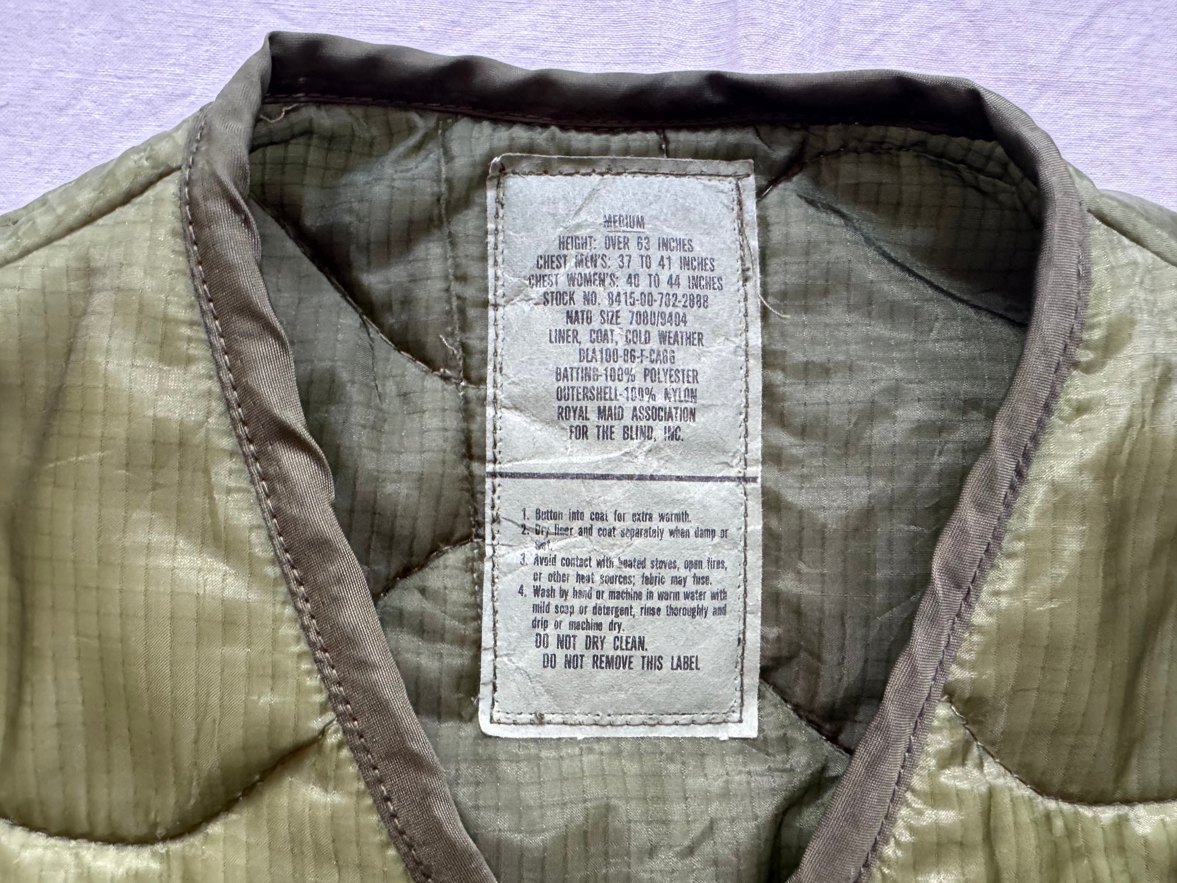 本体には、1986年に米軍へ納入された実物のジャケット用キルティングライナーを使用。