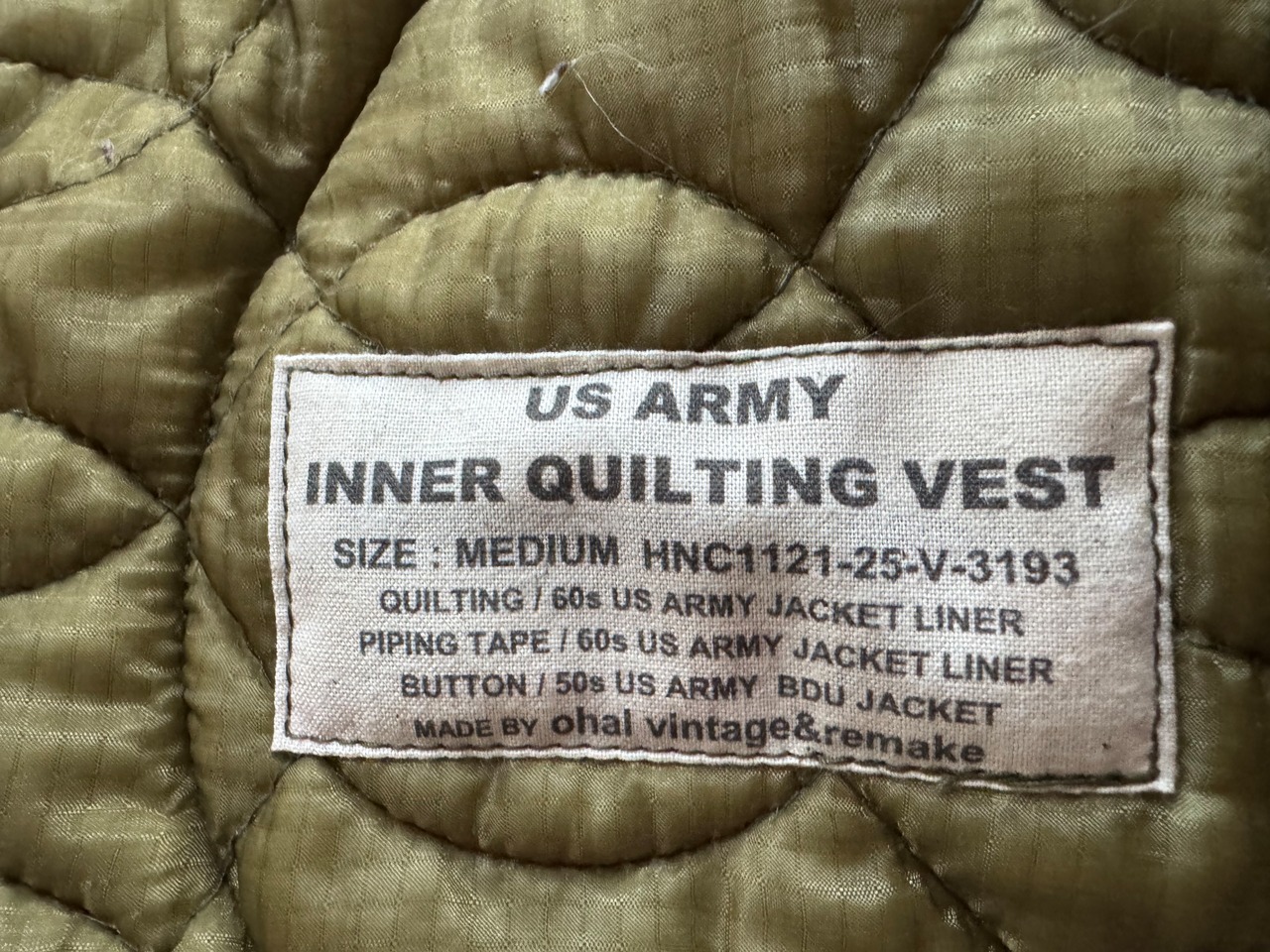 ohal / US ARMY Inner Early Pattern Quilted Vest MEDIUM