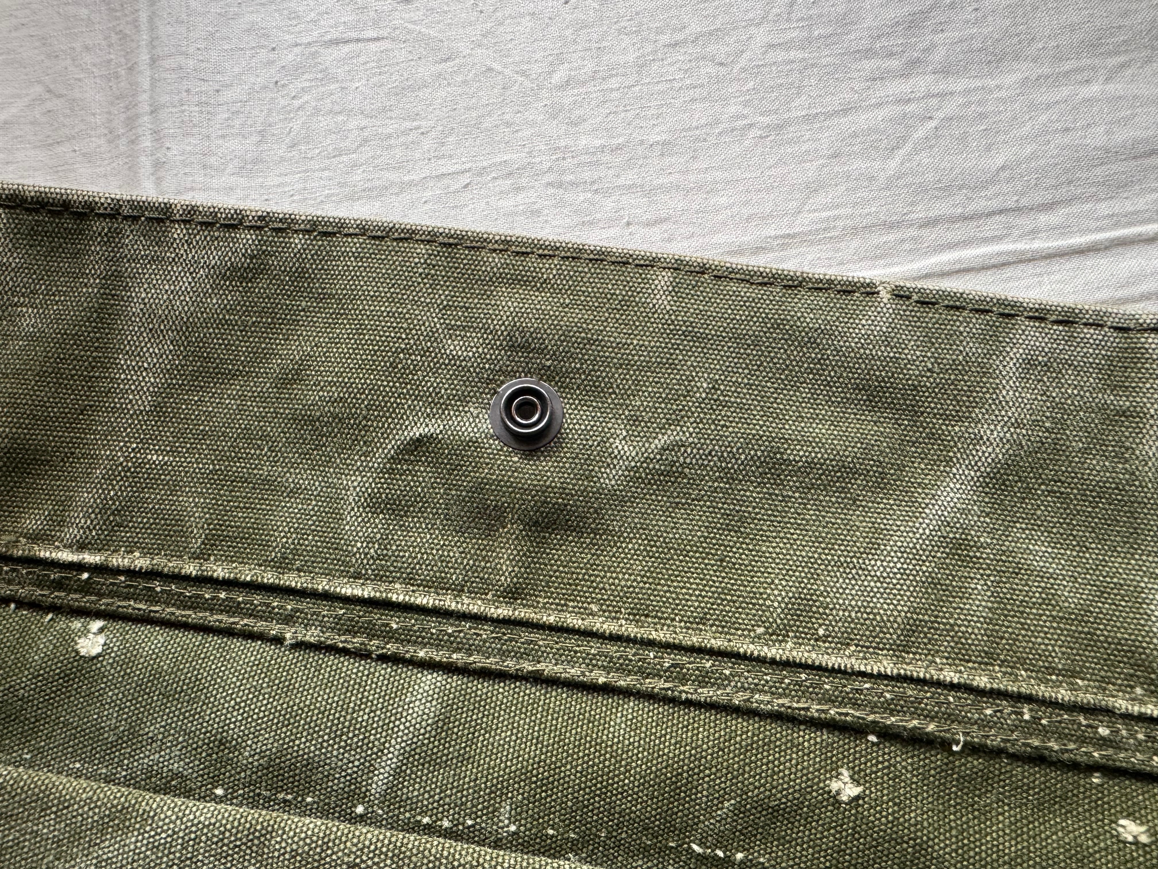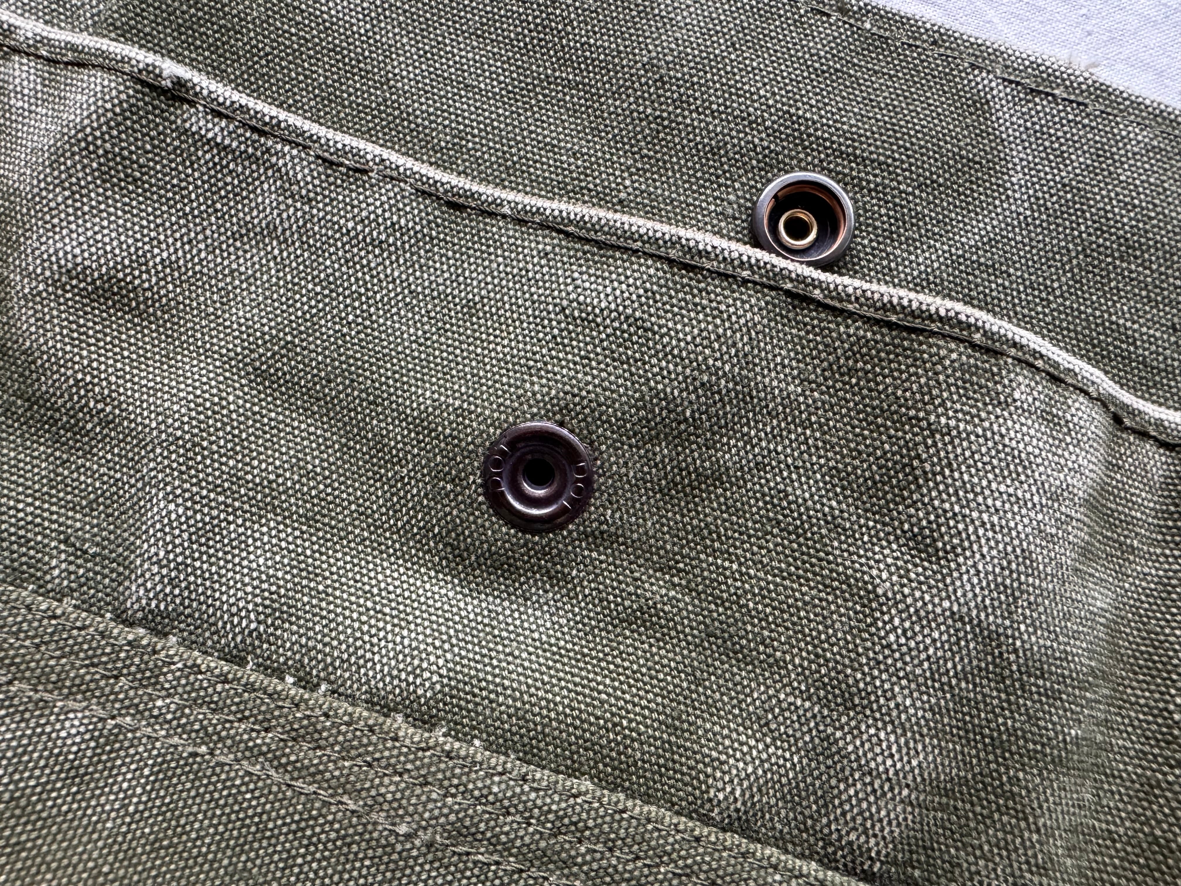 当時使用されていたタフなキャンバス素材は、長年の使用による味わい深いエイジングが魅力。前面にステンシルと、 開口部裏にうっすらとミルスペックの印字があり、ミリタリーアイテムならではの雰囲気をより一層引き立てています。