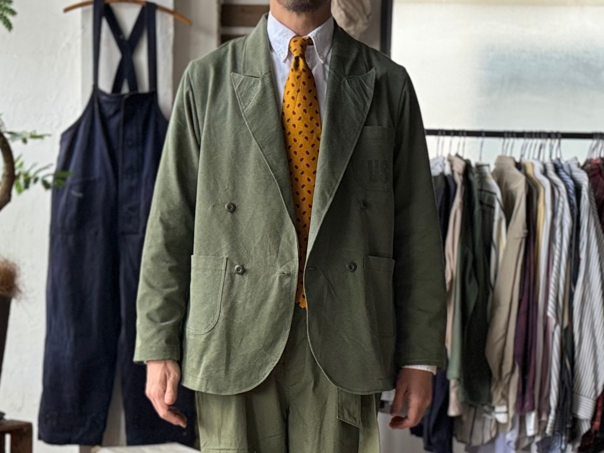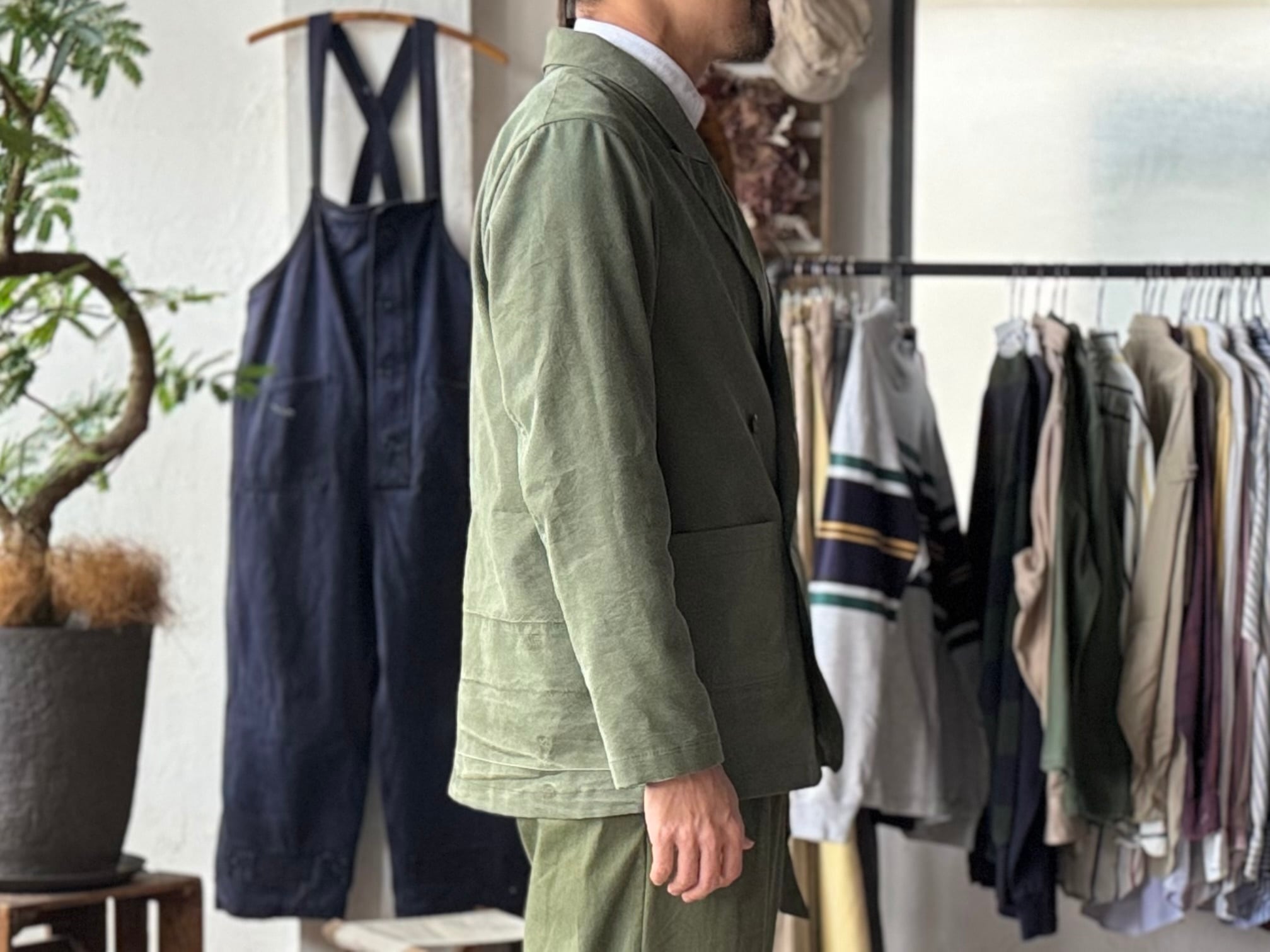 そこに程よく広がるAラインと、腕周りの絶妙なゆとりを加え、ダブル特有の重厚さを残しつつも、テーラードの上品さとワークジャケットのラフさが心地よく同居した、“大人のためのカジュアルジャケット” に仕上げました。