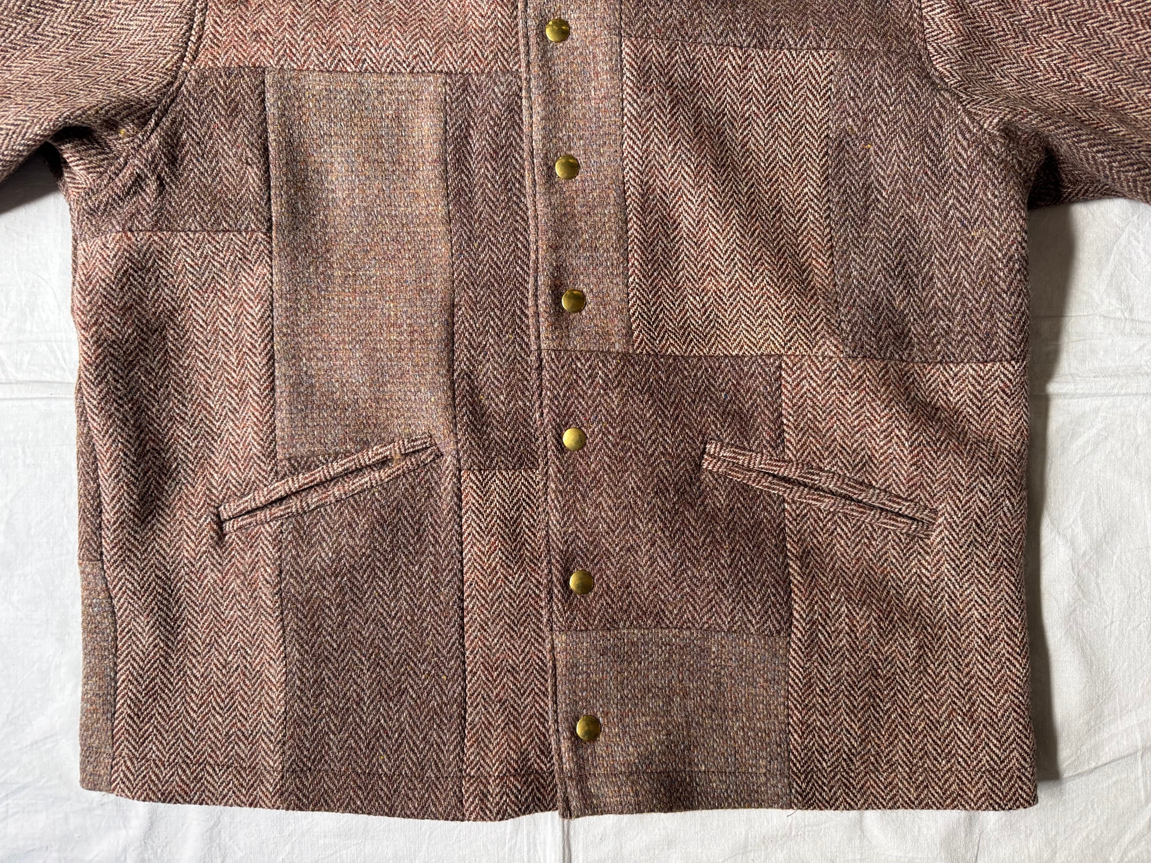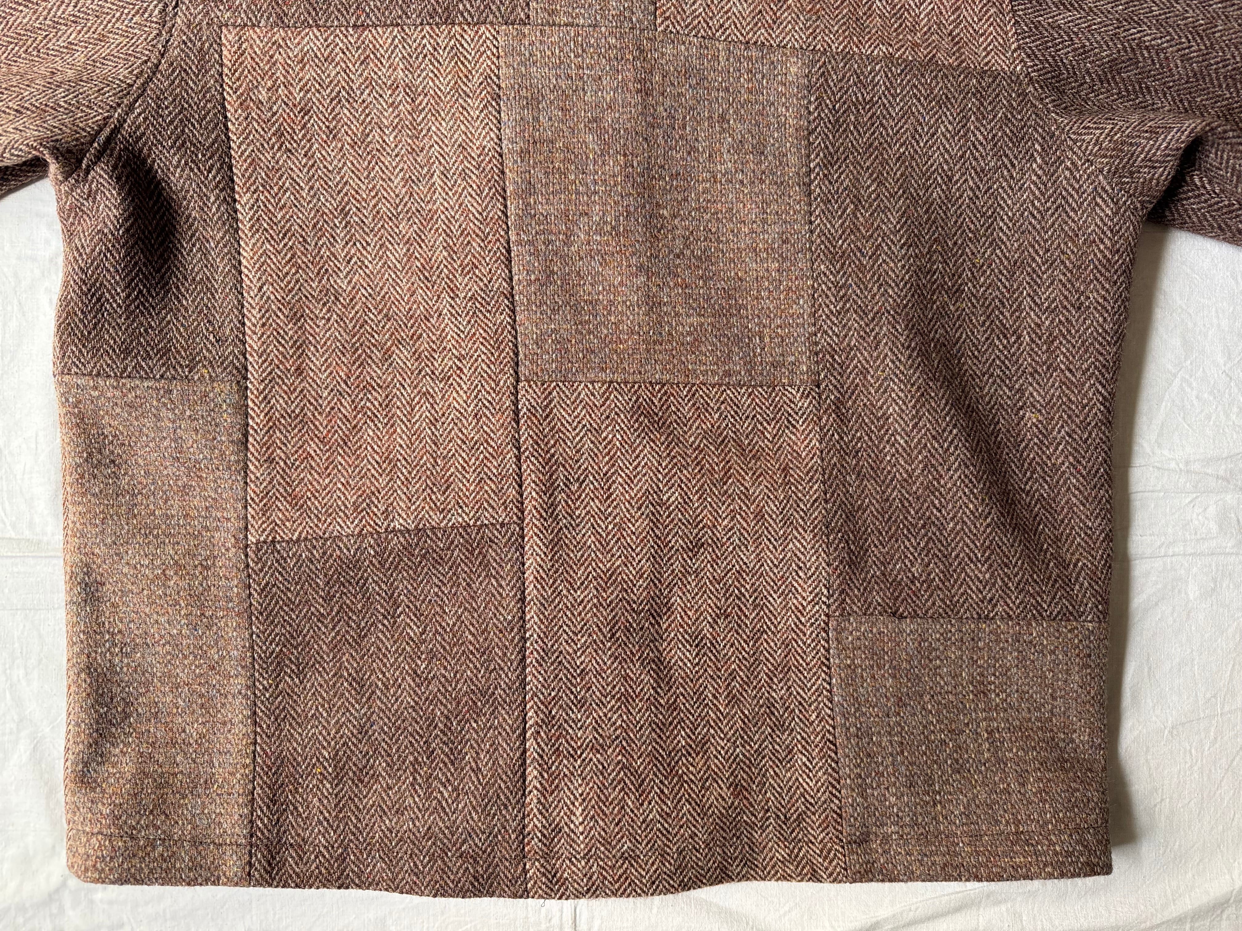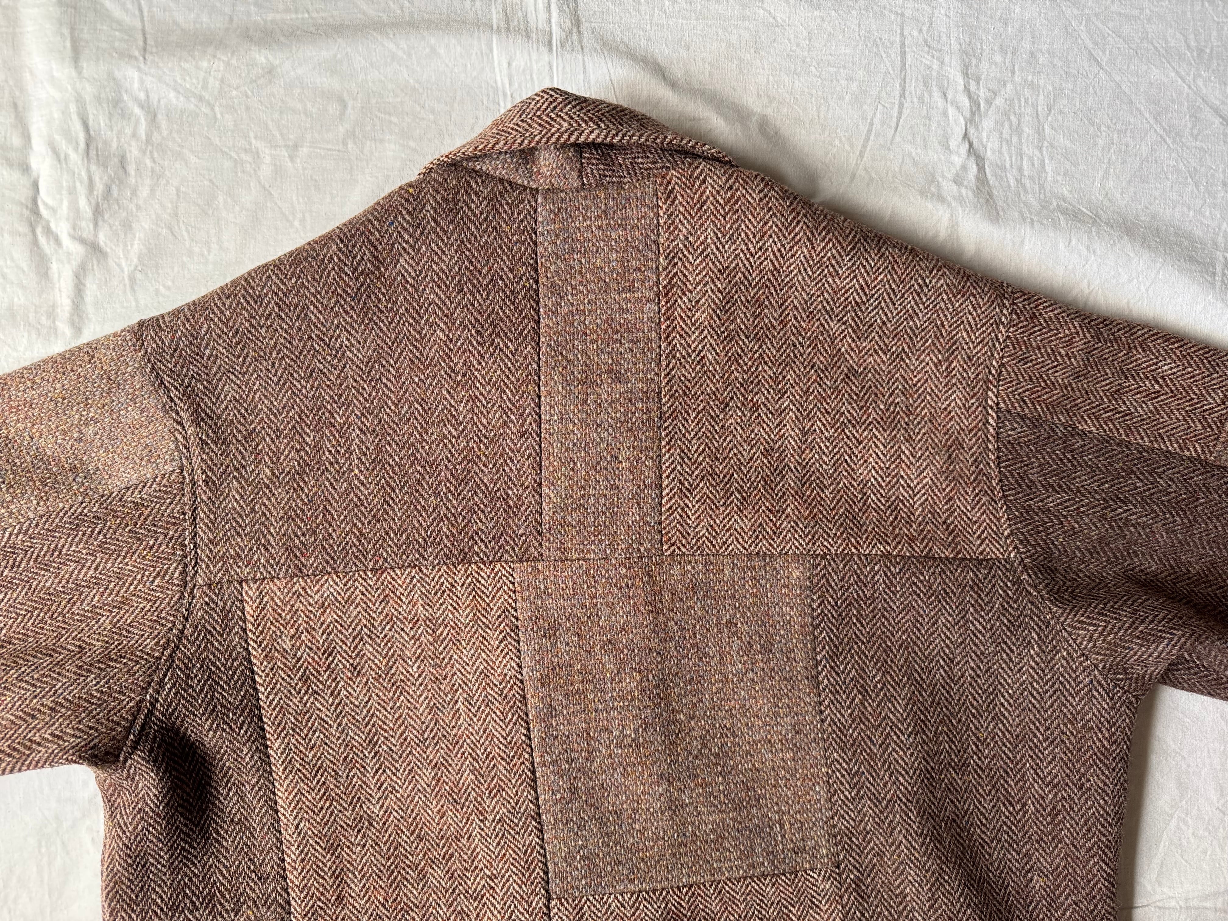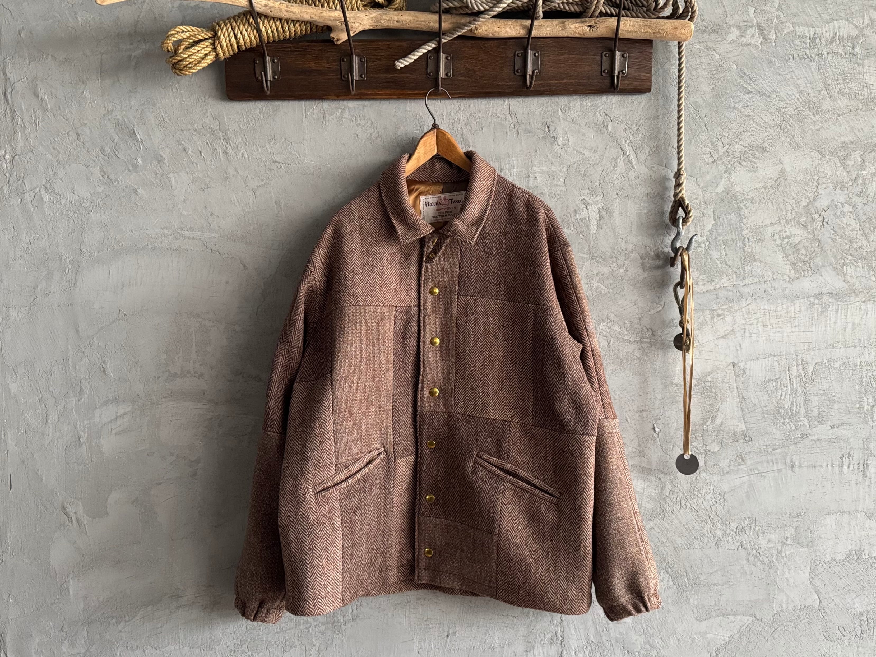 70〜80年代のハリスツイードのテーラードジャケットを3着解体し、それぞれの生地を厳選してつなぎ合わせた、一点物のコーチジャケット。