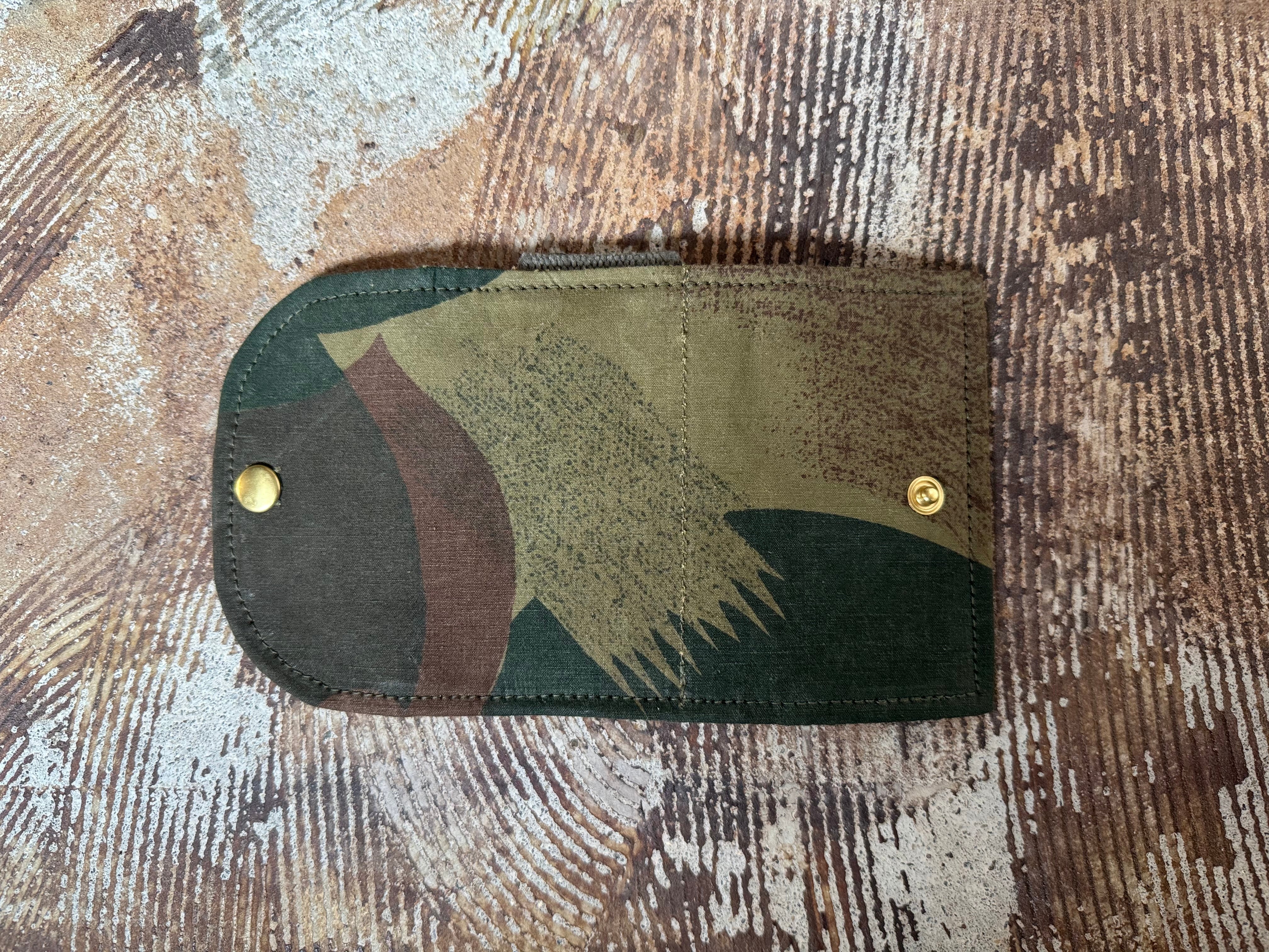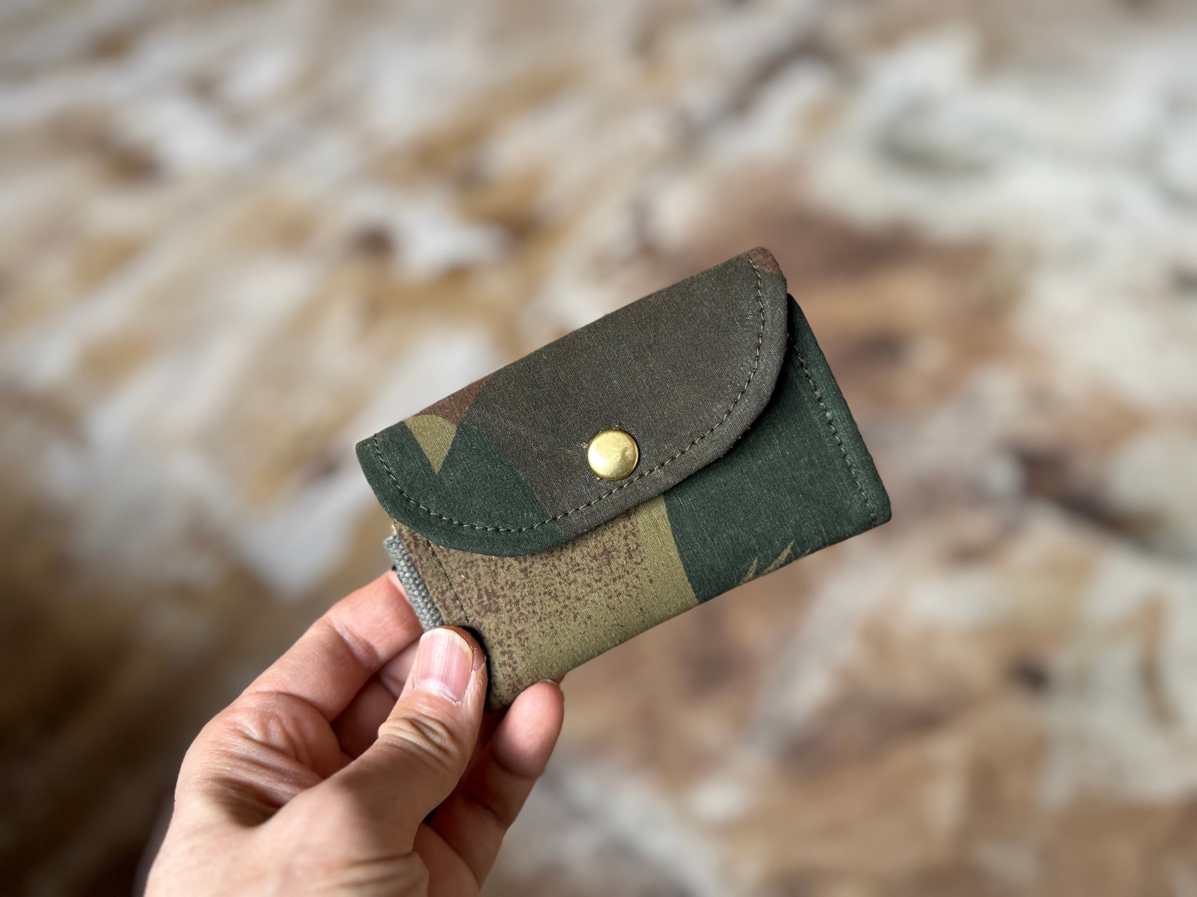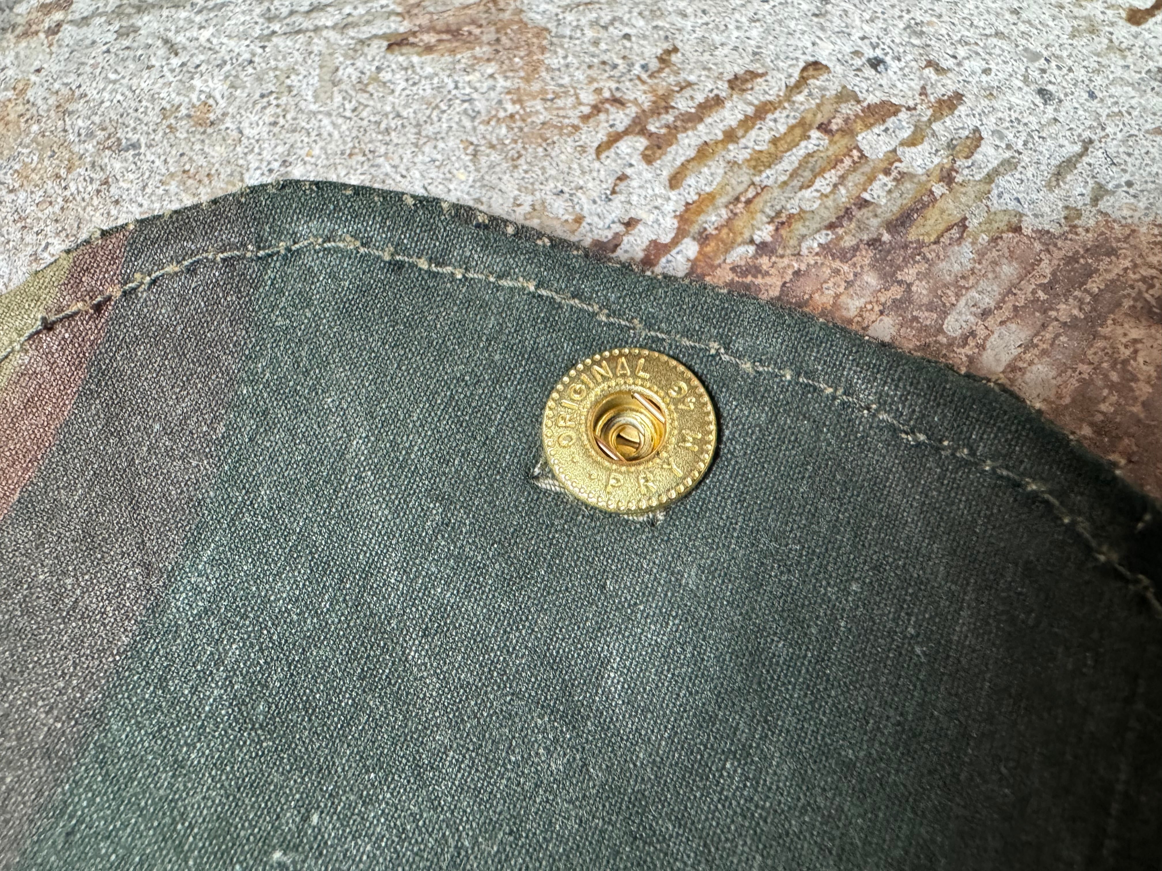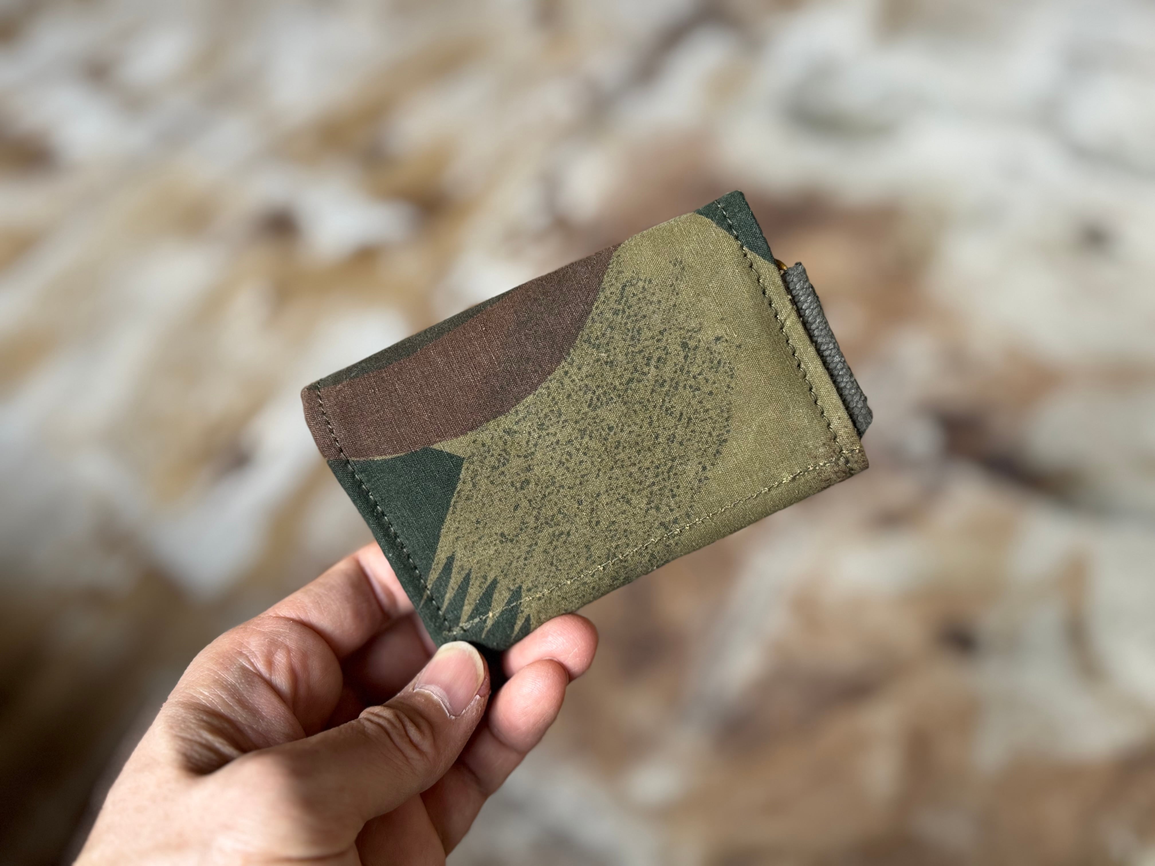 使用している生地は、50年代ベルギー軍で使用されていた、ブラッシュストロークカモ柄のテント生地。筆の刷毛跡(ブラッシュストローク)のような迷彩柄が目を惹く逸品です。