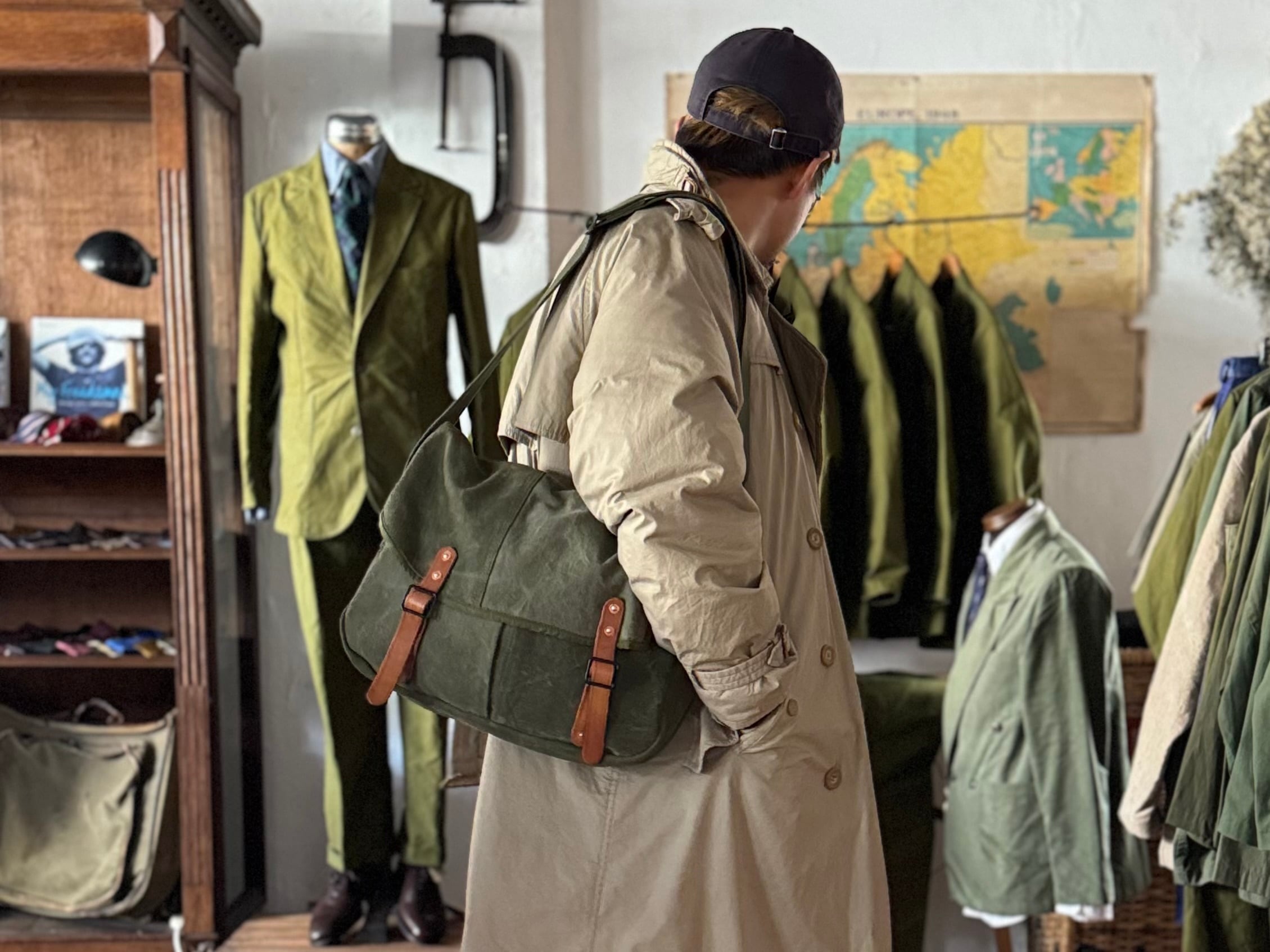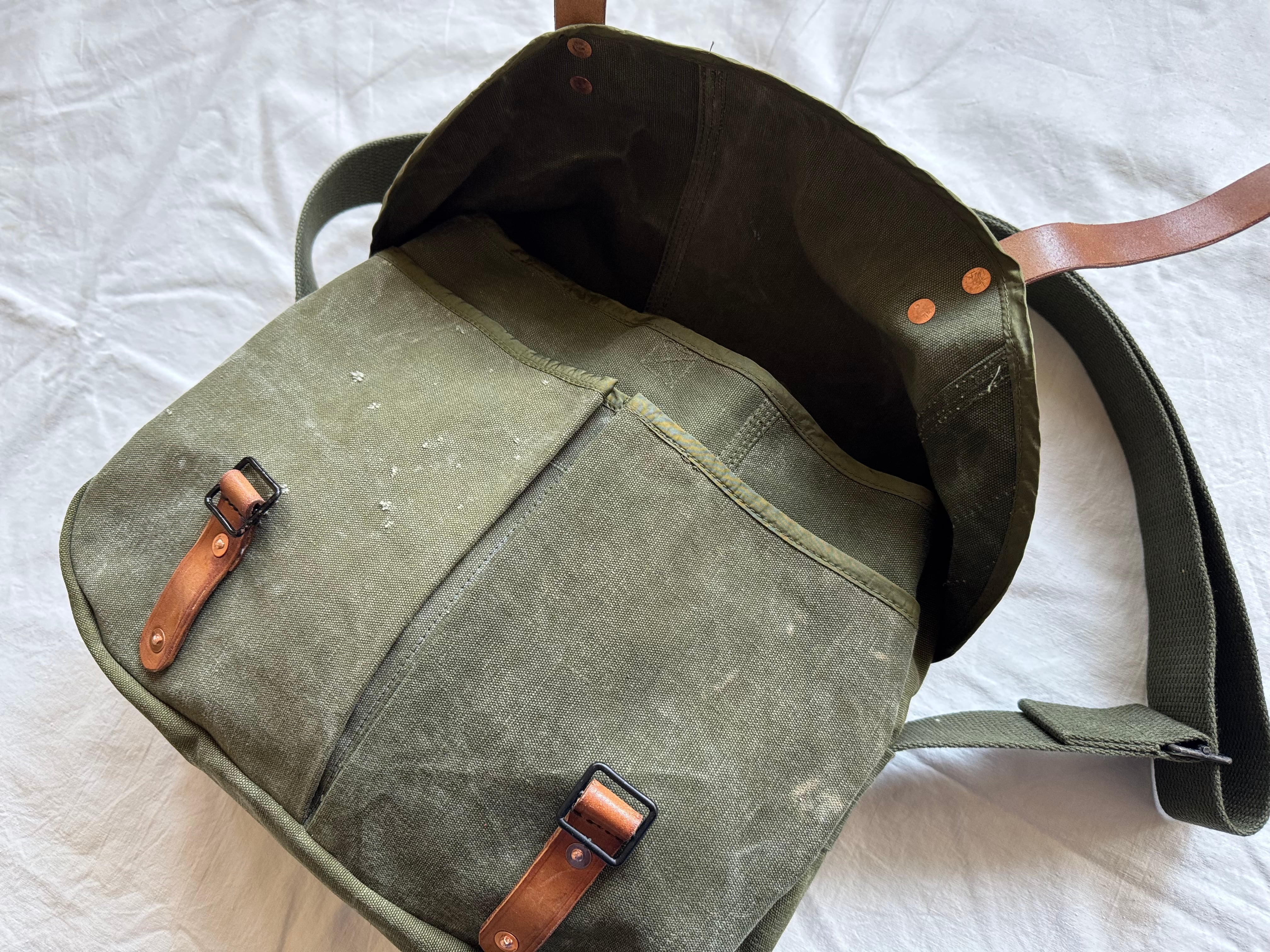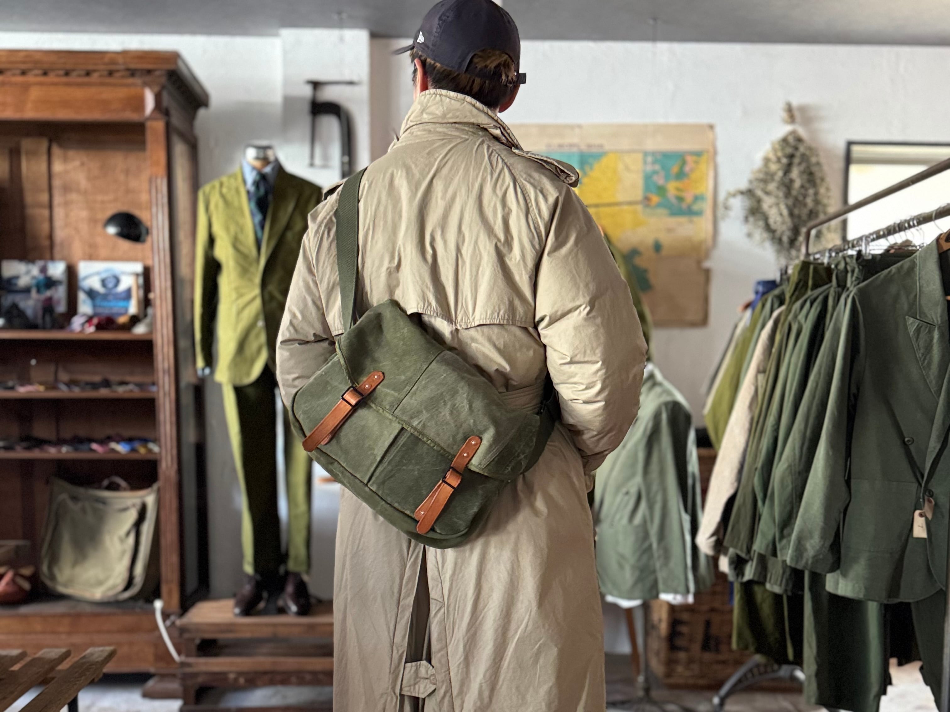 ショルダーベルトのアジャスターはフランス軍のダッフルバッグから、フラップに付くレザーストラップも同じくフランス軍のヴィンテージパーツです。