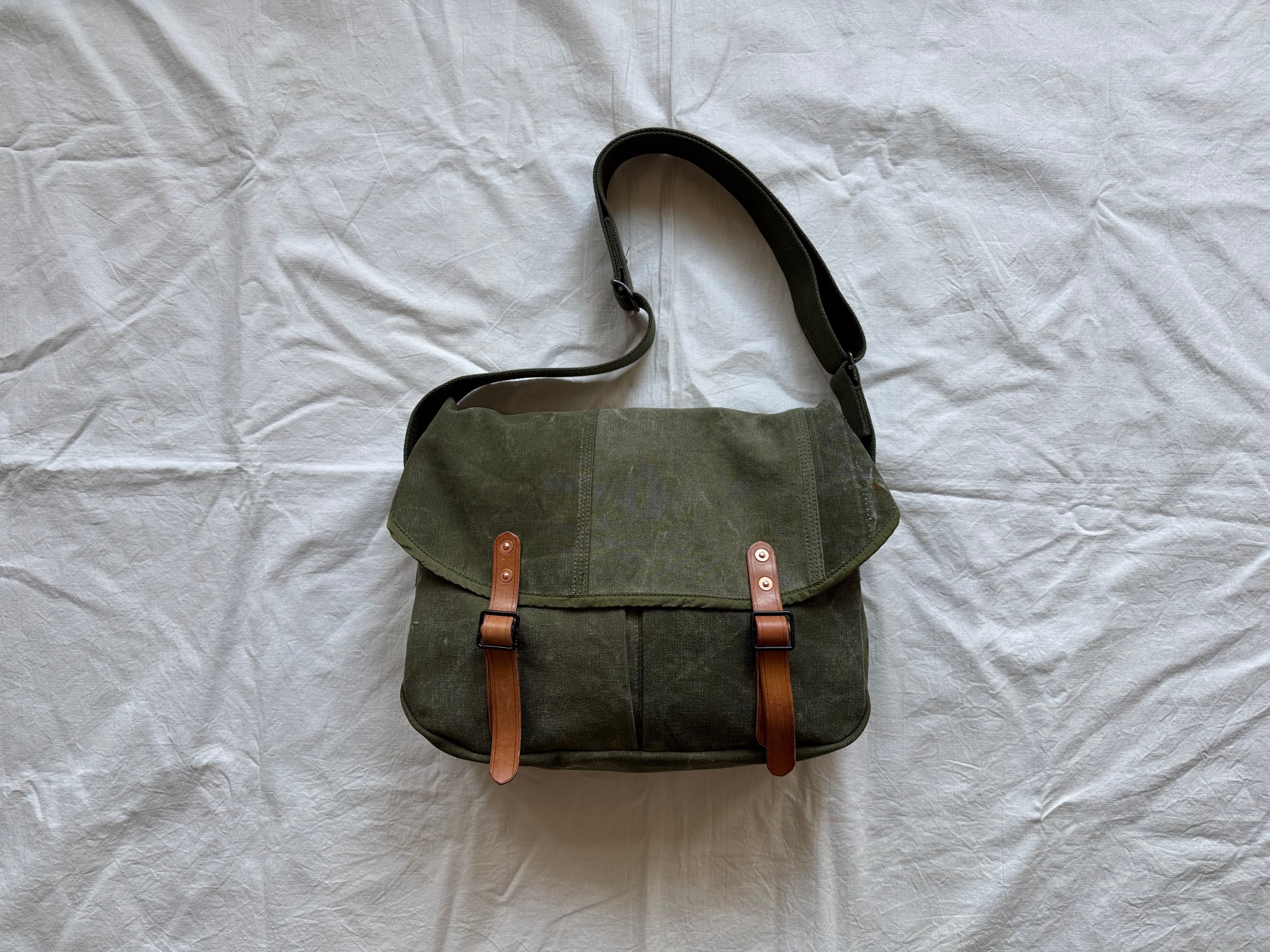 1950〜70年代にかけてアメリカ軍で使用されていた、ヴィンテージのキャンバスダッフルバッグ。その端切れを丁寧につなぎ合わせ、ハンティングバッグとして再構築しました。
