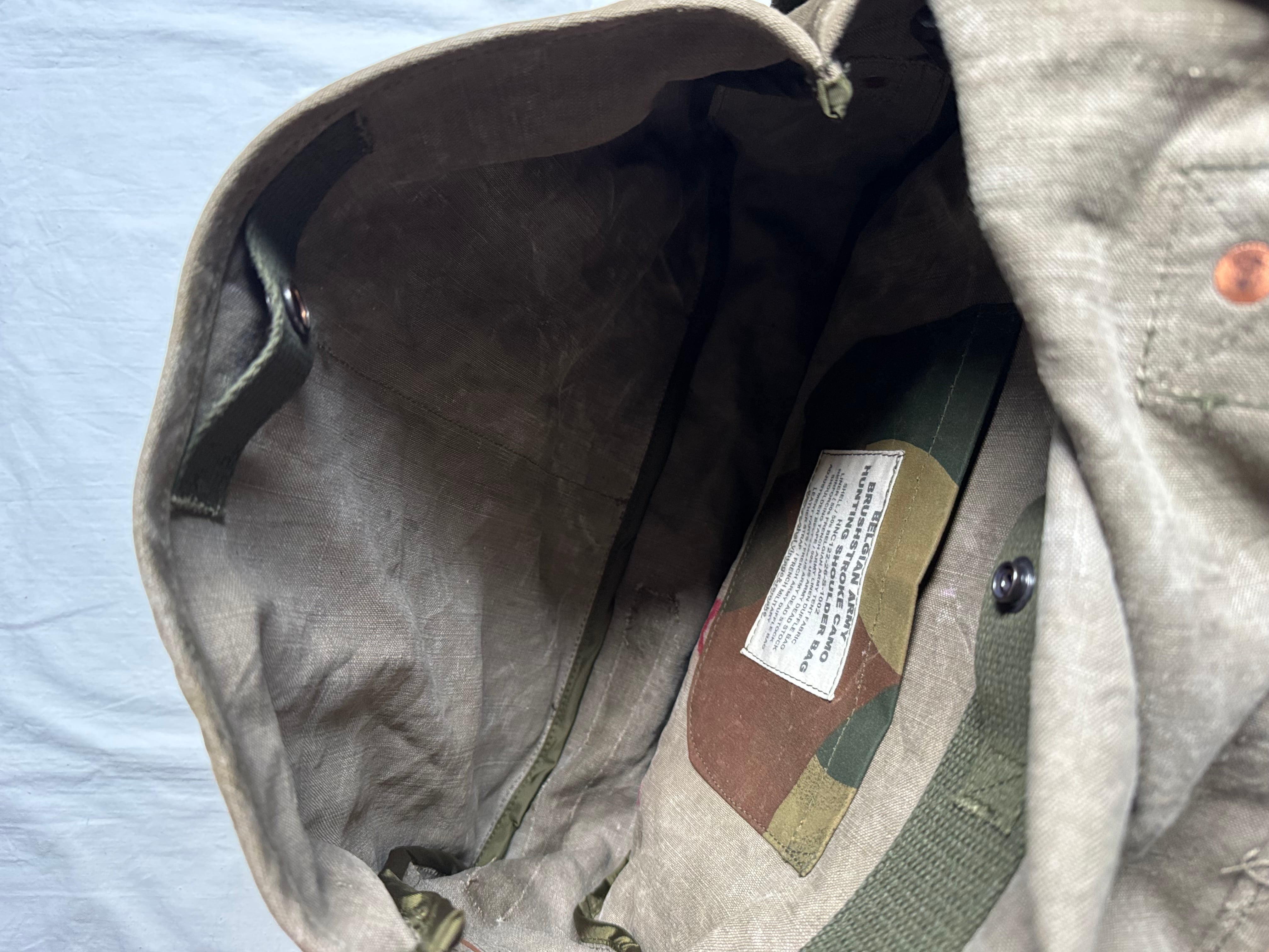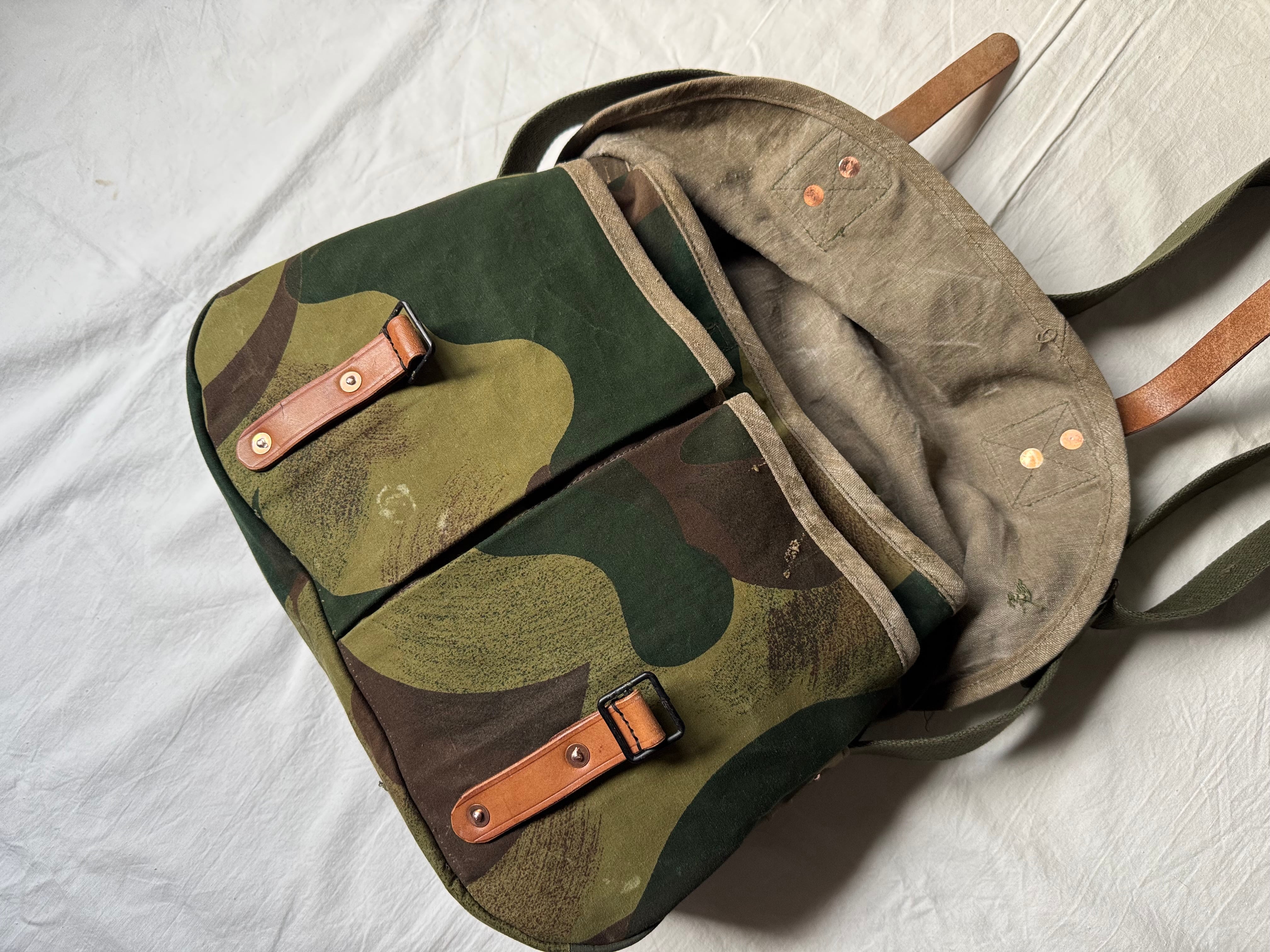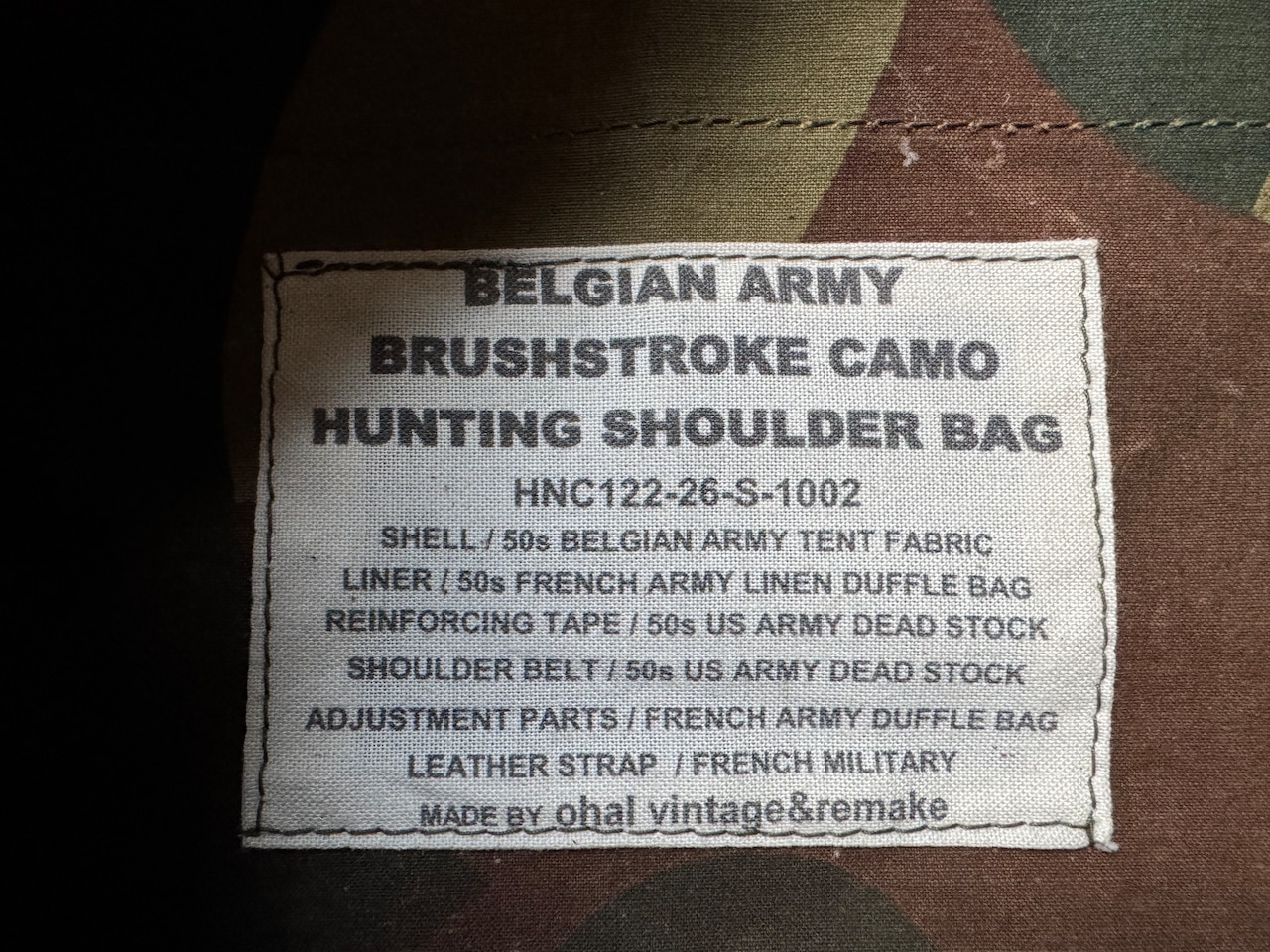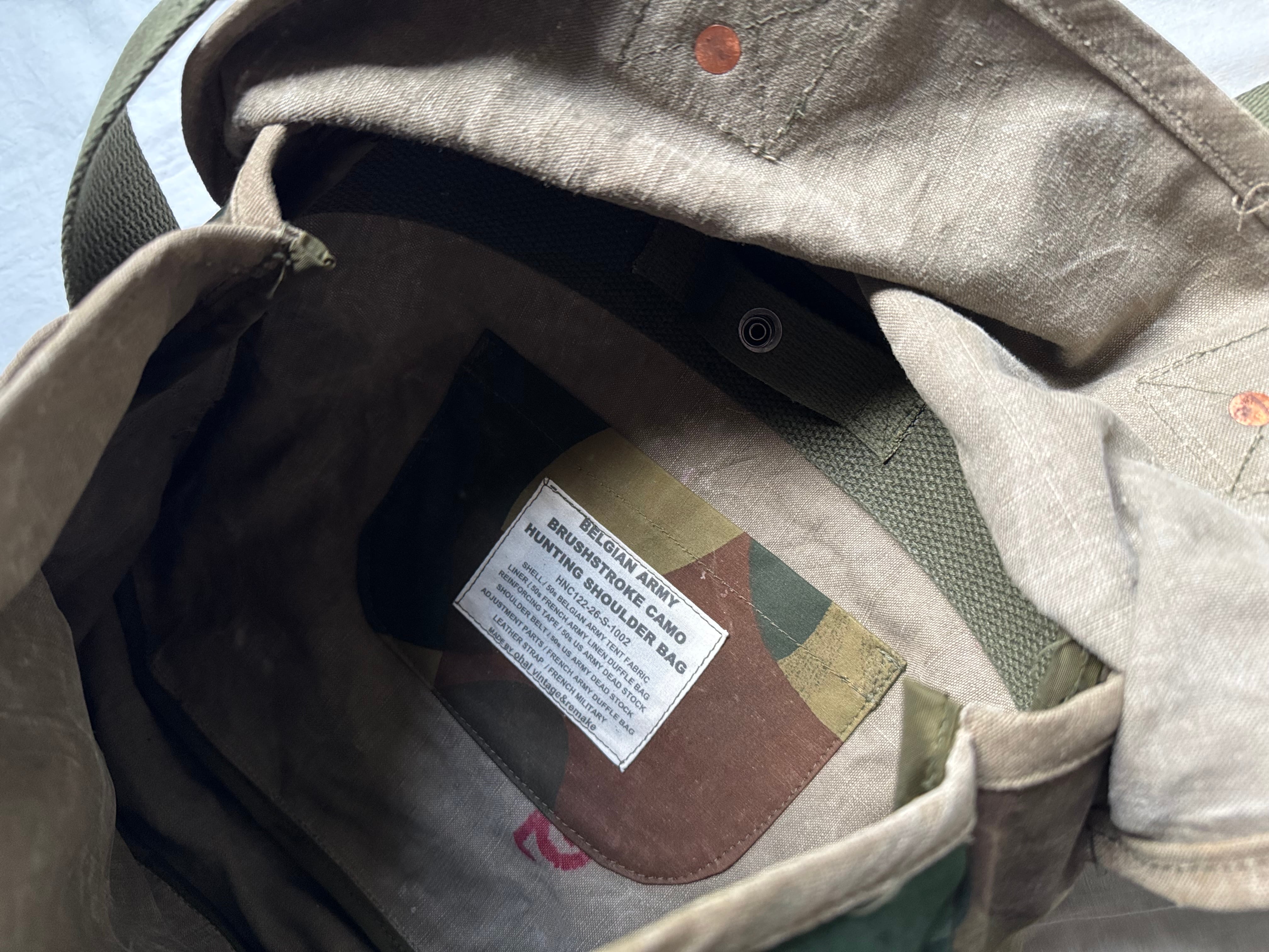 1950年代にベルギー軍で使用されていた、ブラッシュストロークカモ柄のテント生地。筆の刷毛跡(ブラッシュストローク)のような迷彩柄が目を惹く生地をハンティングバッグとして再構築しました。