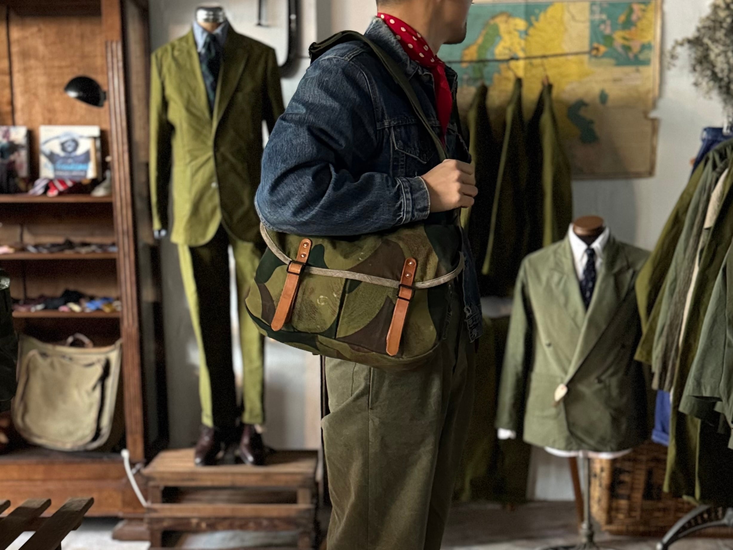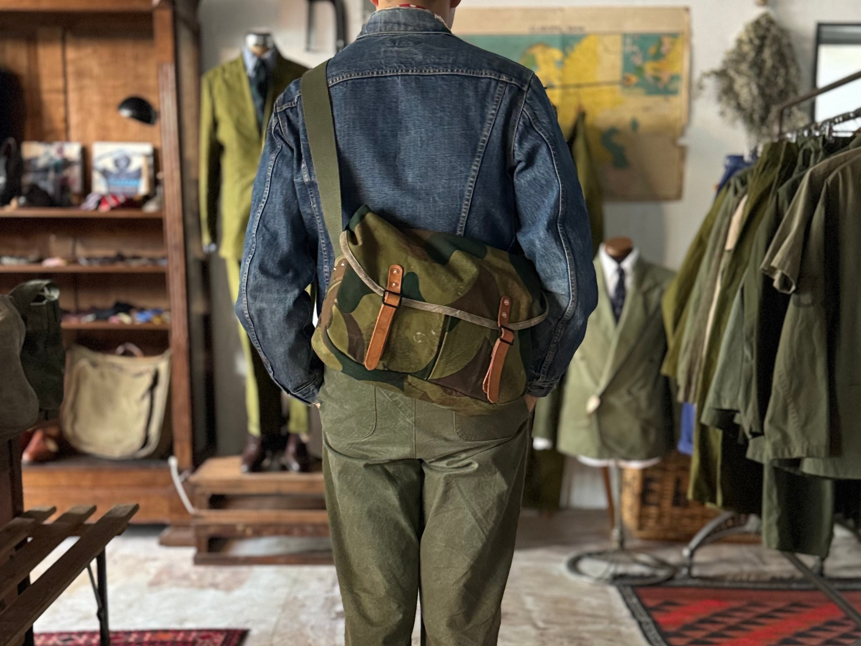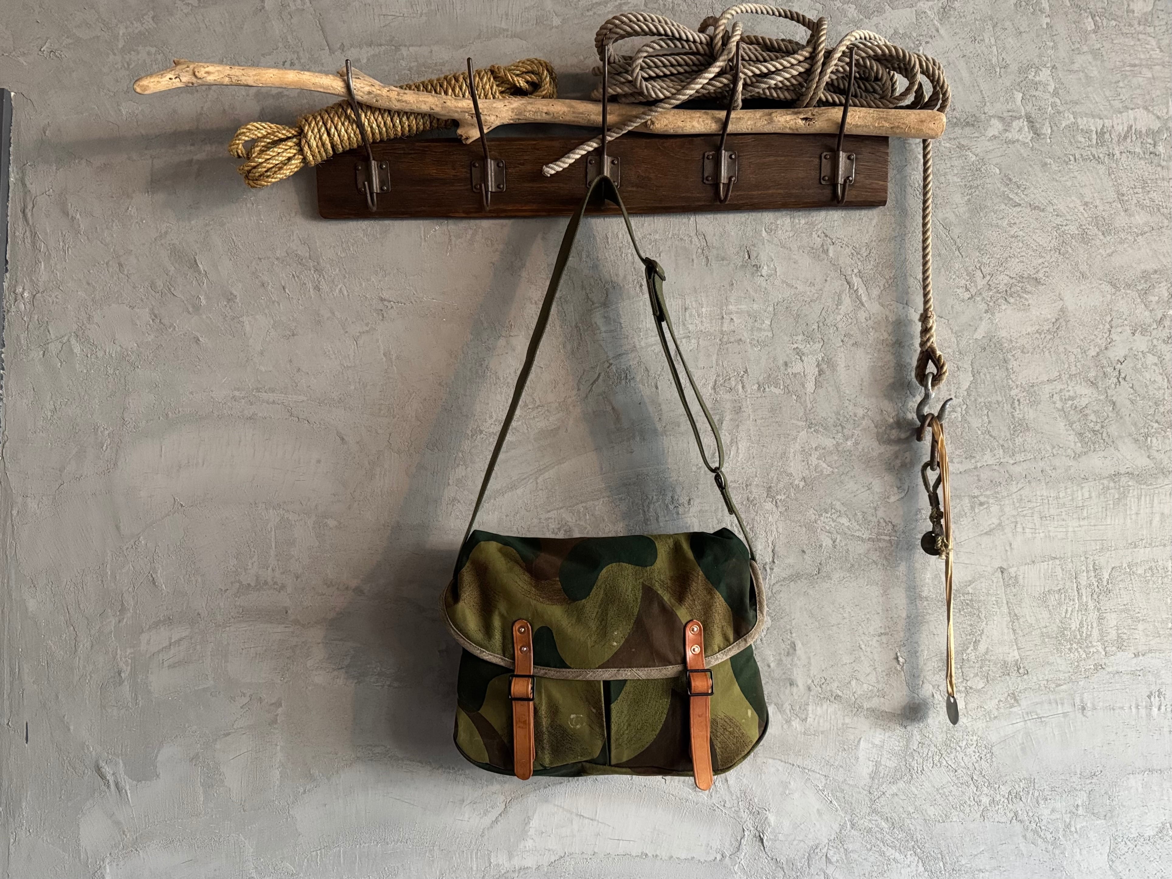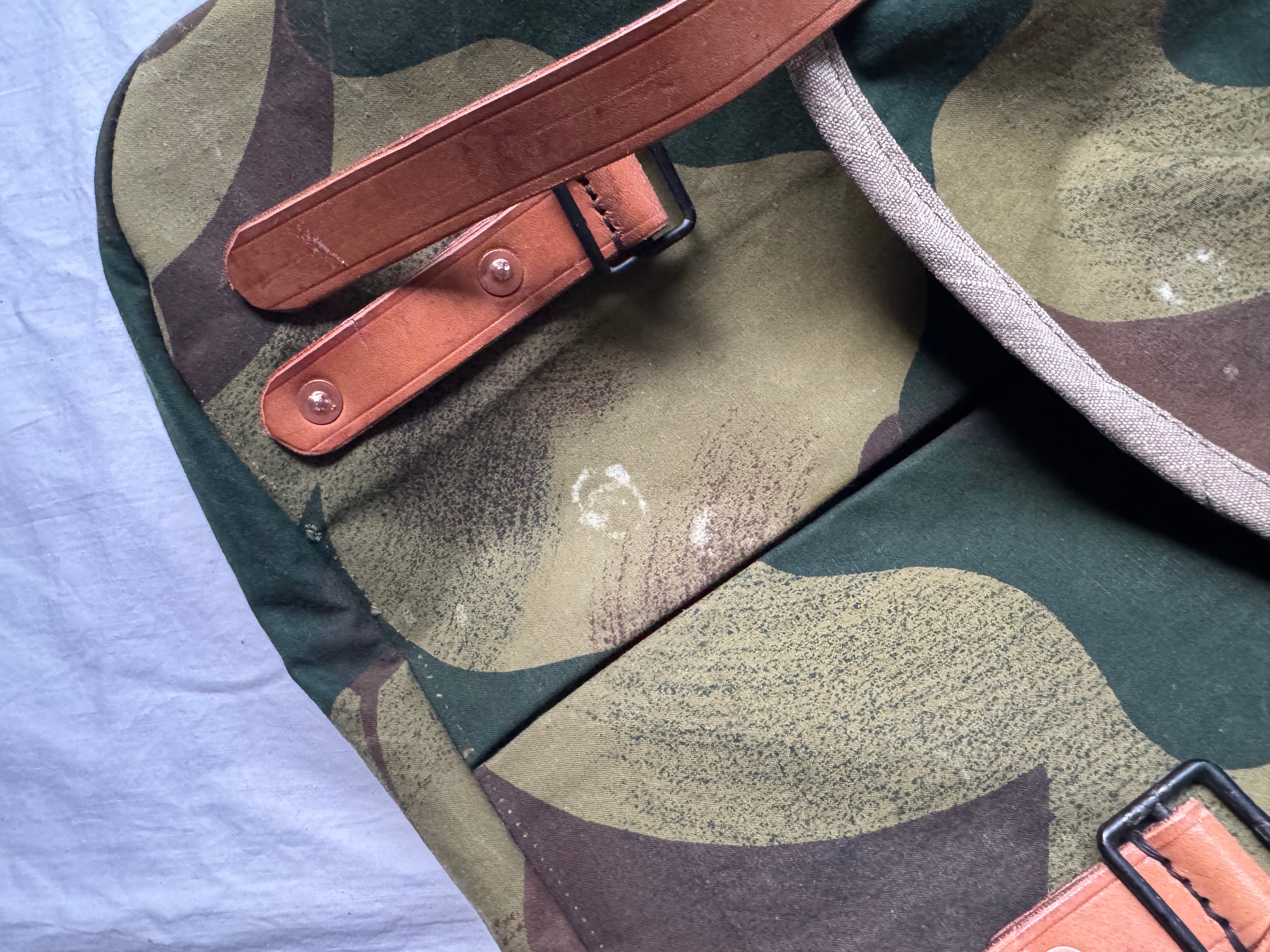 1950年代にベルギー軍で使用されていた、ブラッシュストロークカモ柄のテント生地。筆の刷毛跡(ブラッシュストローク)のような迷彩柄が目を惹く生地をハンティングバッグとして再構築しました。