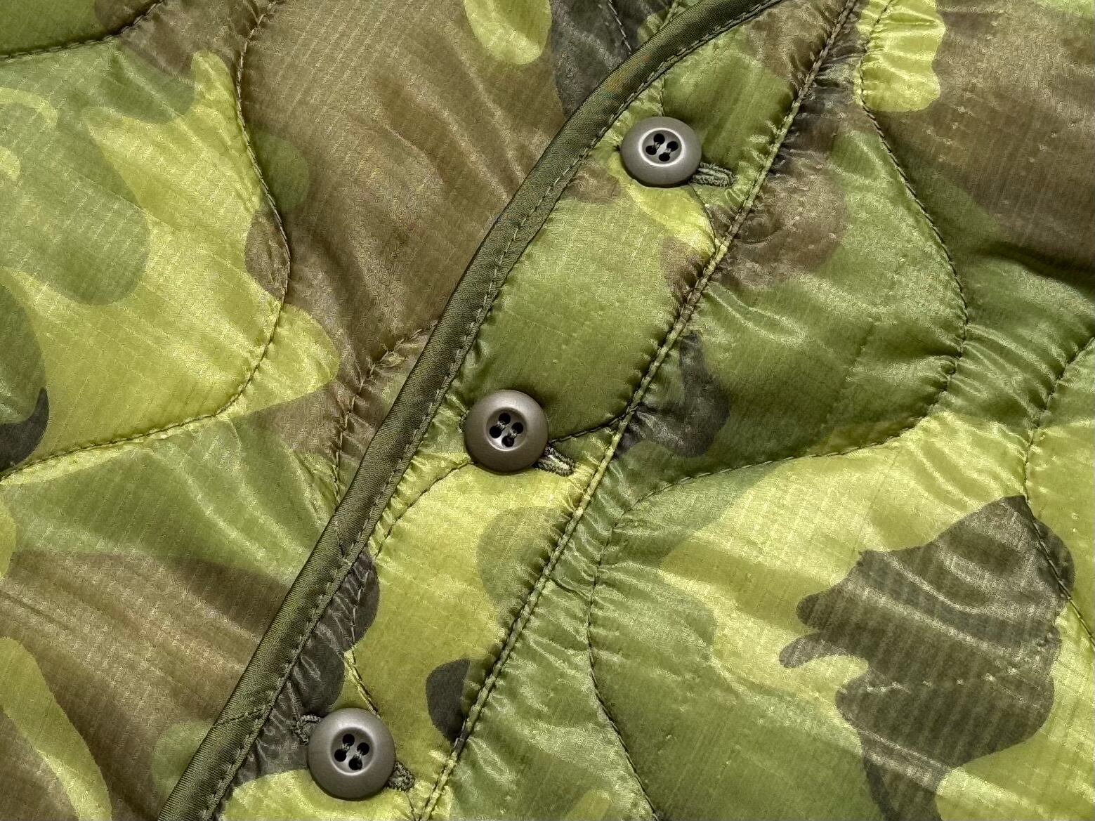 本体には、1970年代に米軍へ納入されていた実物のウッドランドカモ柄ポンチョライナーを使用。パイピングやボタンに至るまで、ミルスペックに準拠した実物パーツで仕上げています。