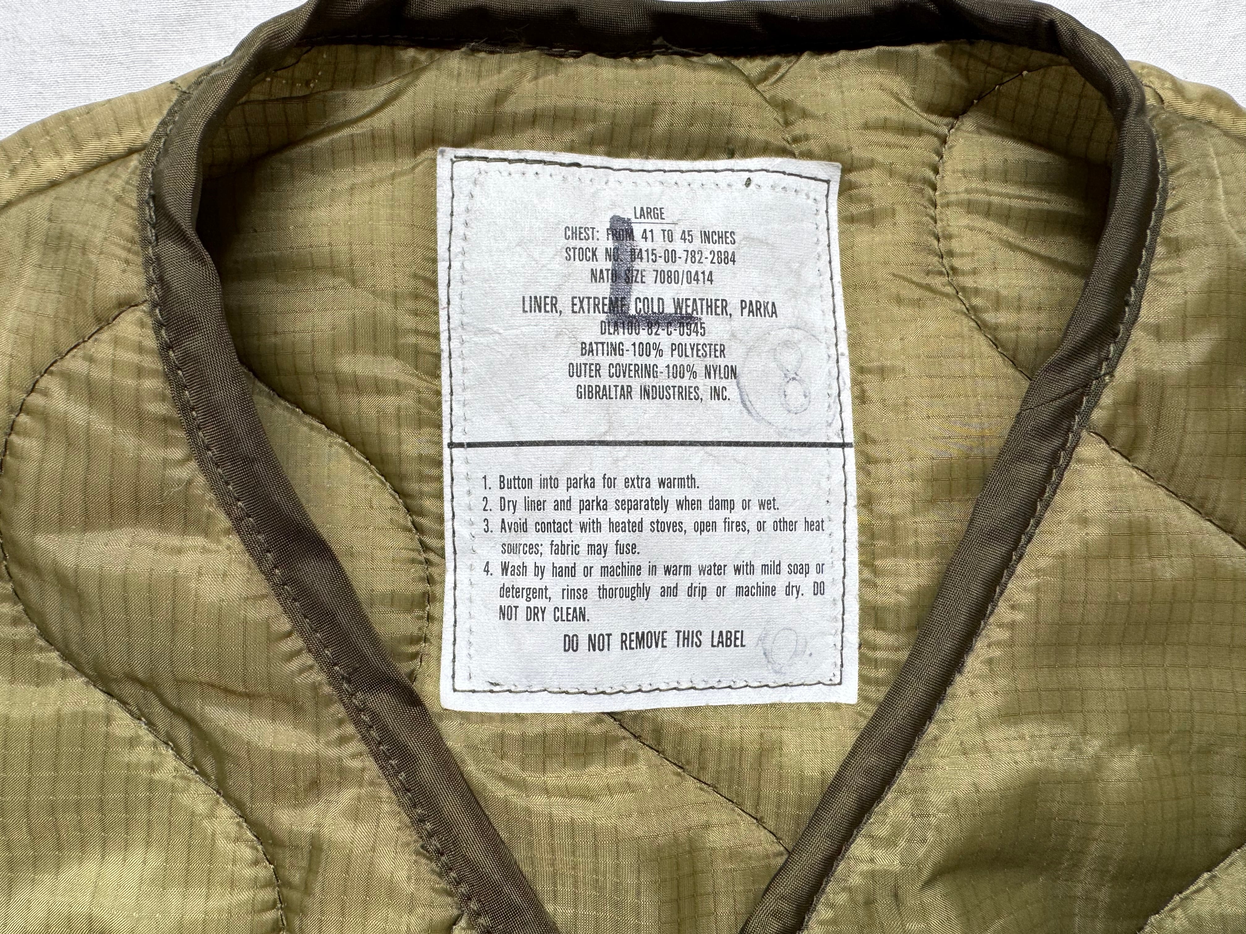本体には、1982年に米軍へ納入された実物のM-65パーカー用キルティングライナーを使用。