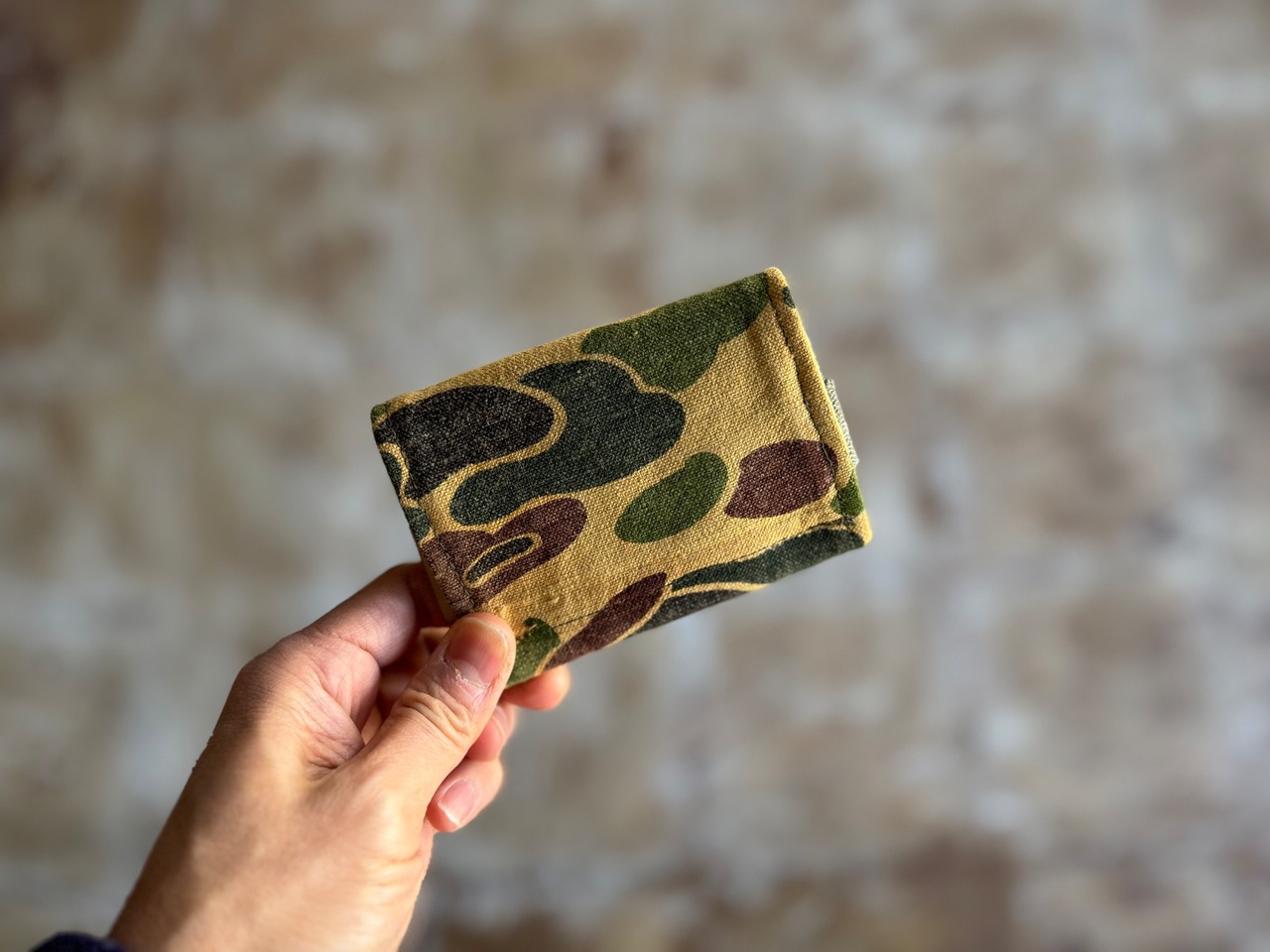 表地は70年代、ハンターカモ柄のハンティングジャケットを解体した生地そして裏地は50年代、アメリカ軍のダッフルバッグの生地。