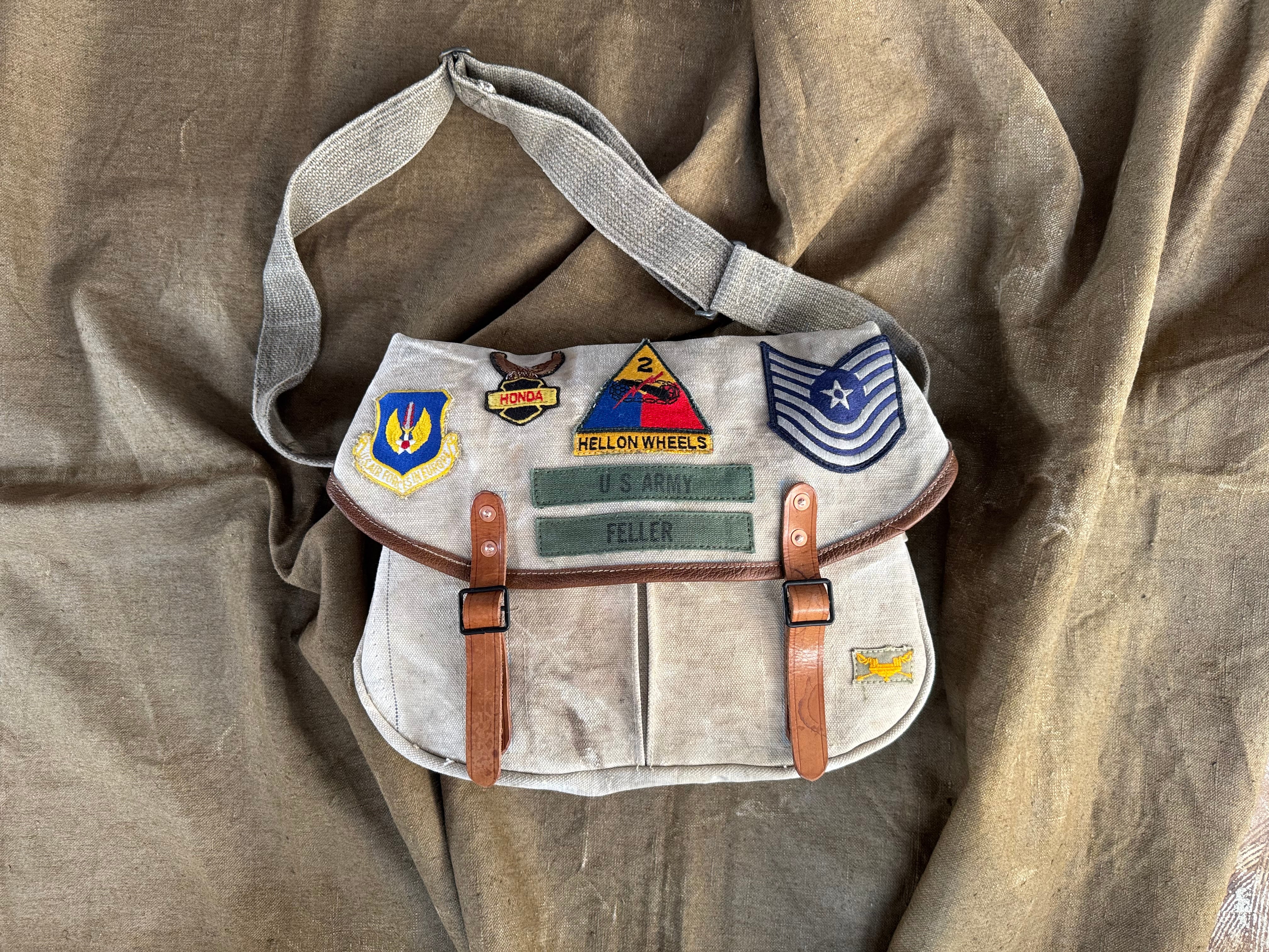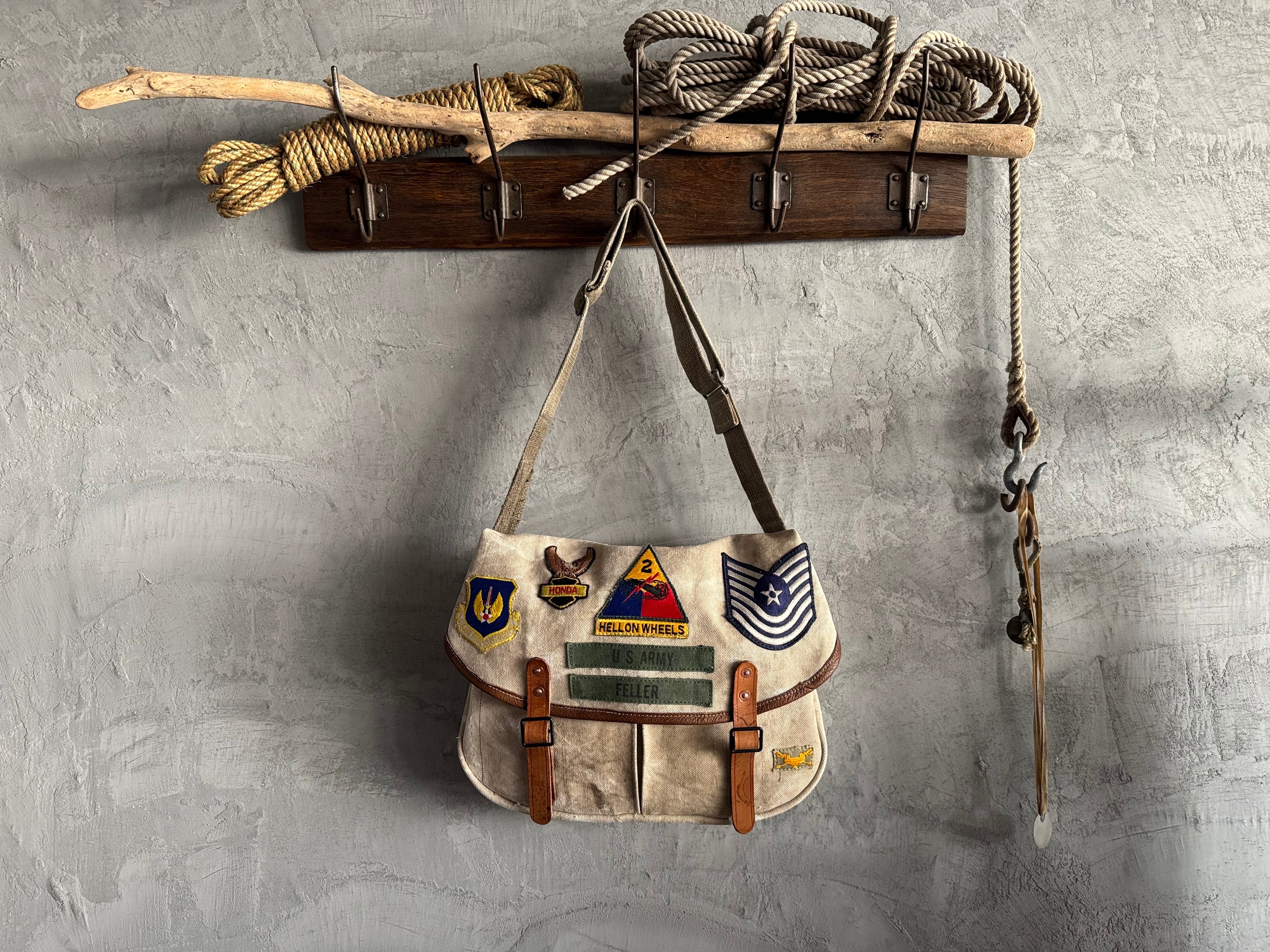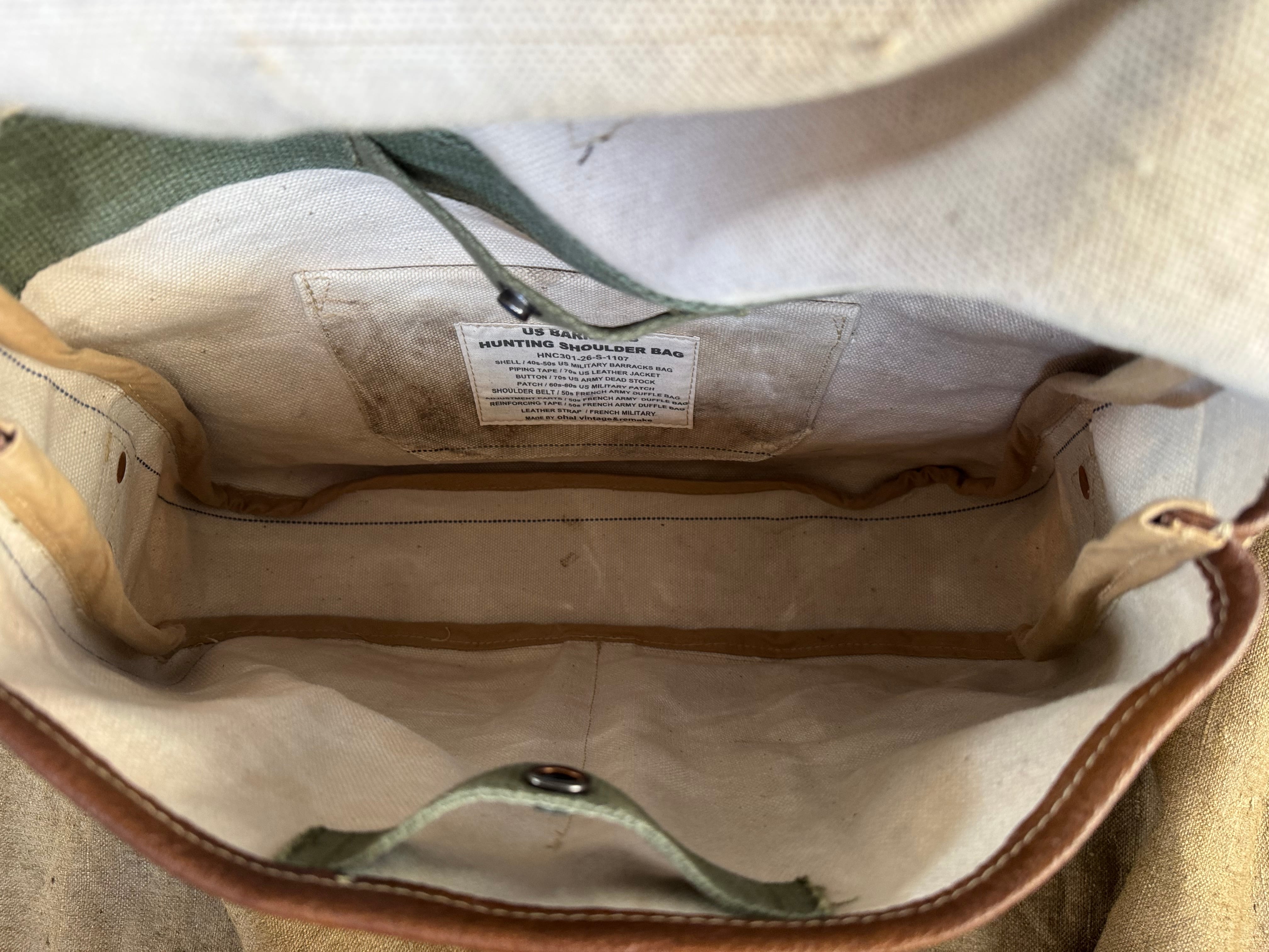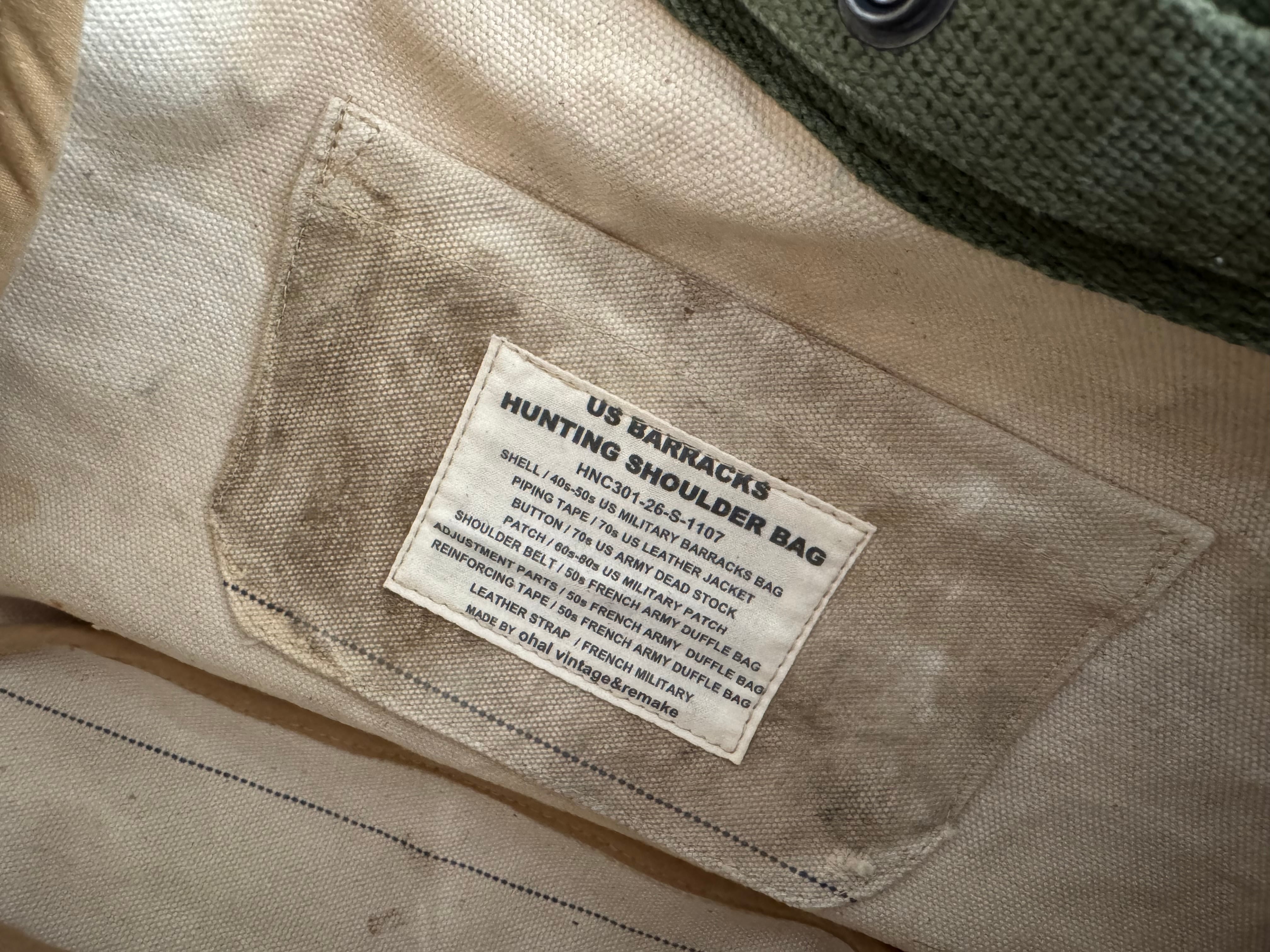 1940〜50年代にかけてアメリカ軍で使用されていた、ヴィンテージのキャンバスバラックバッグ。その生地を使用し、ハンティングバッグとして再構築しました。