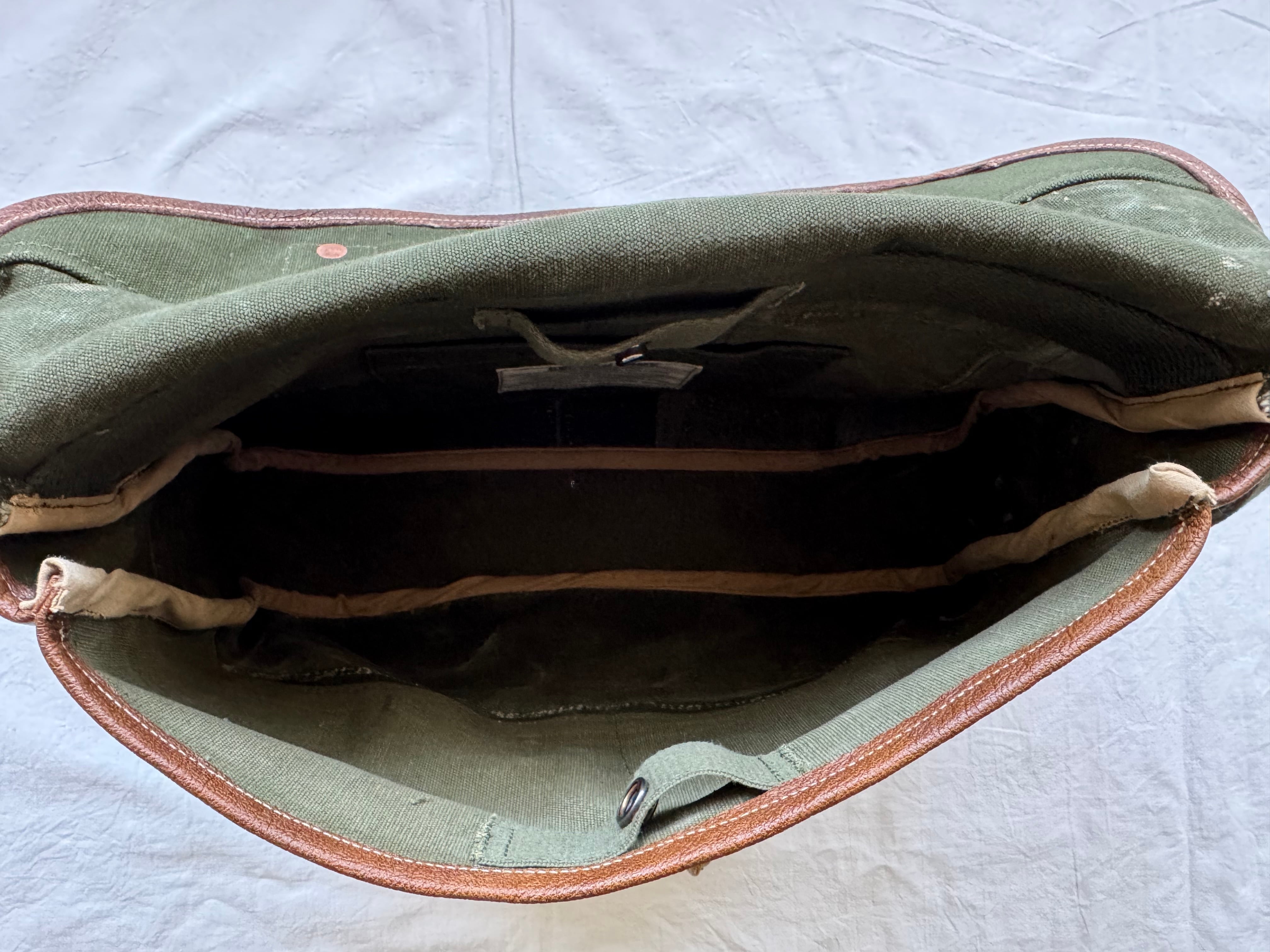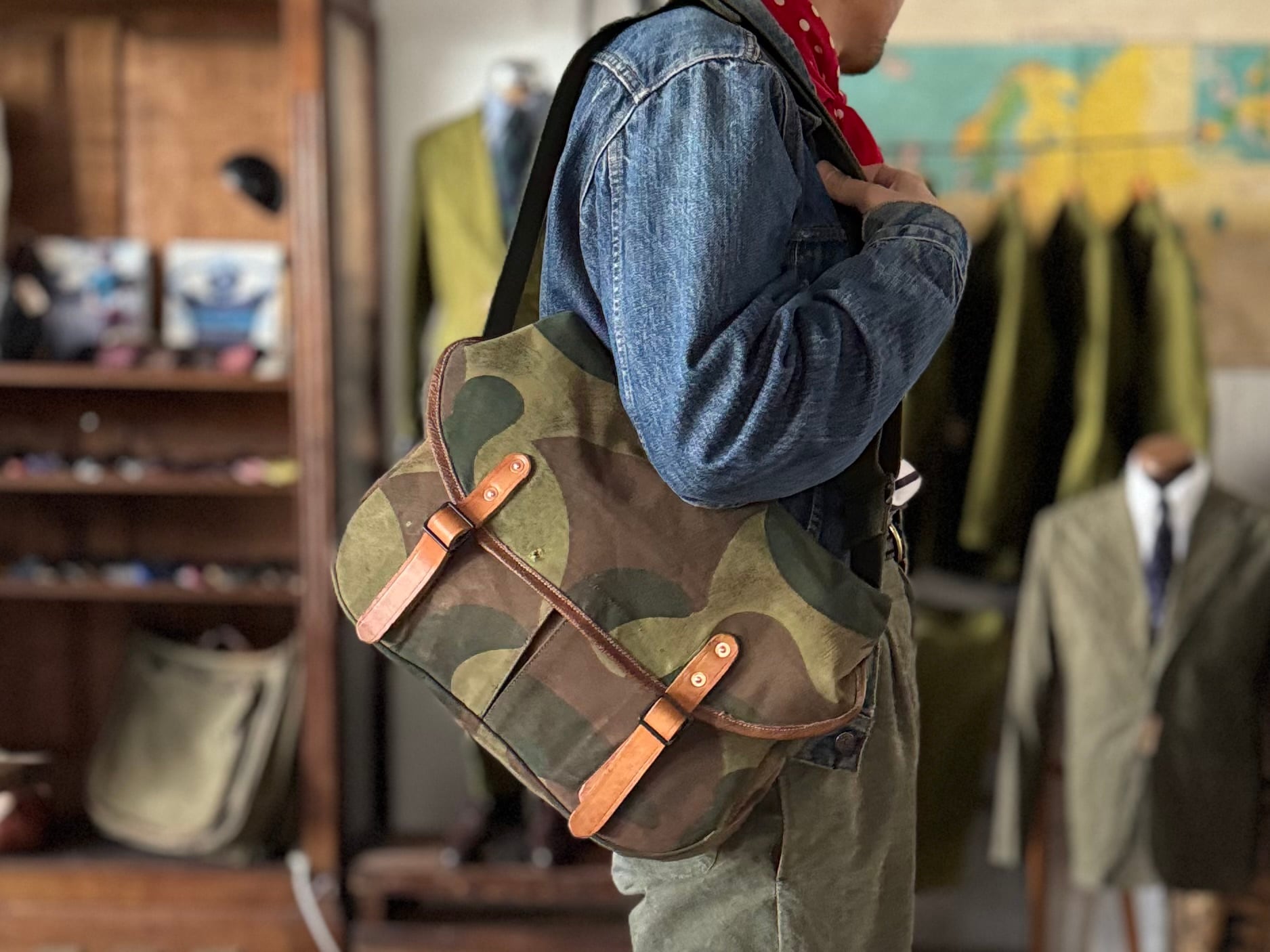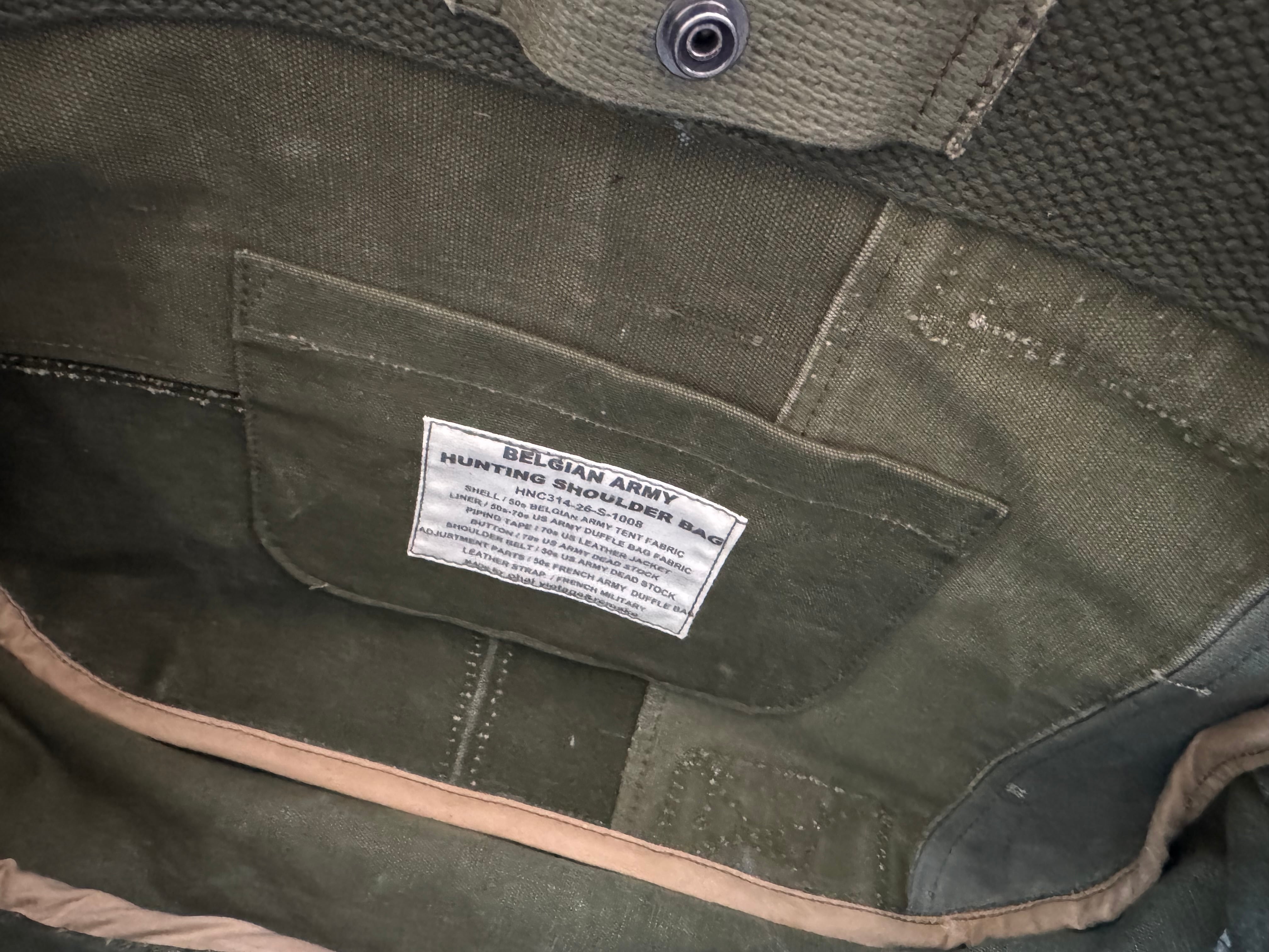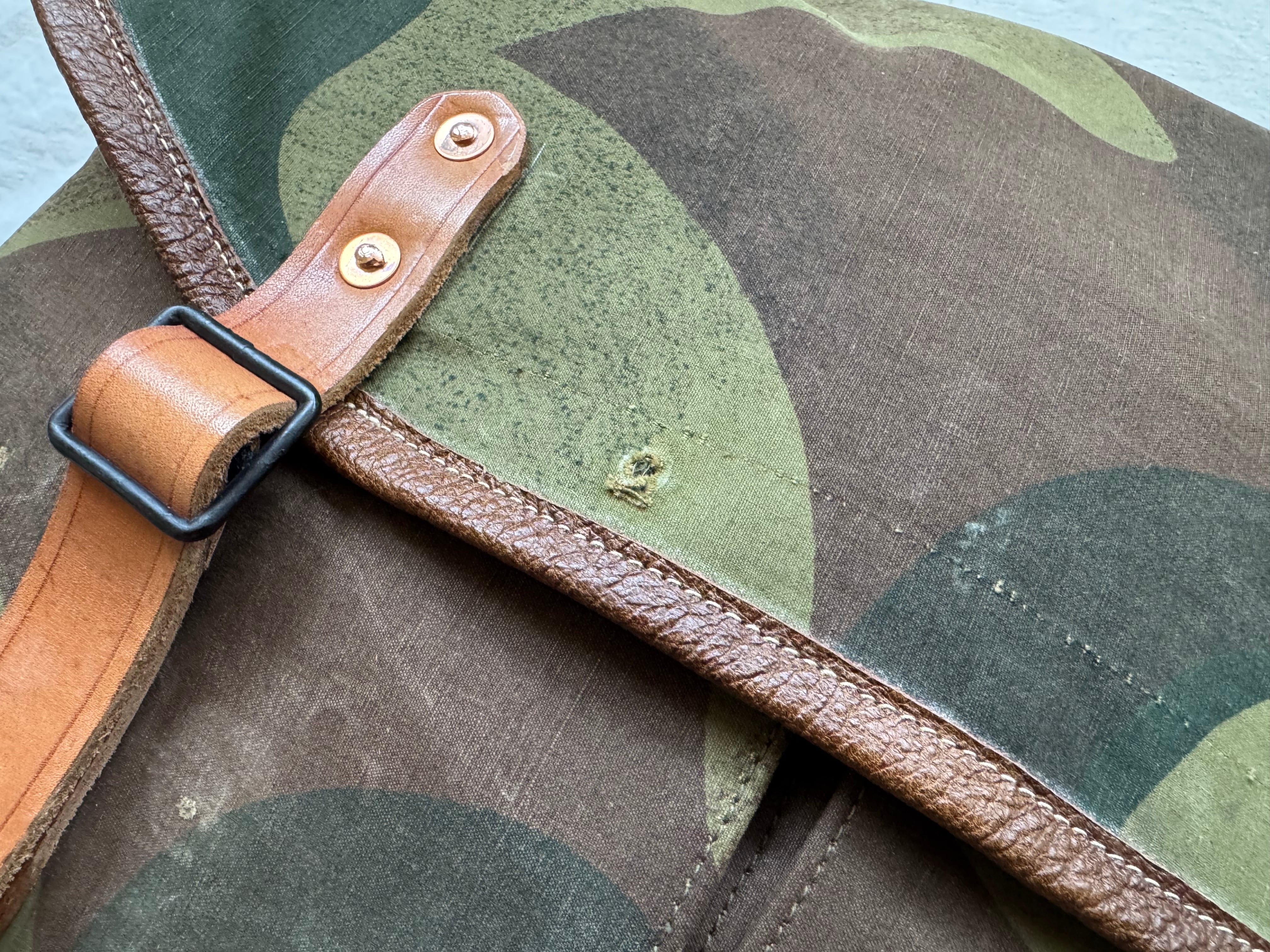 1950年代にベルギー軍で使用されていた、ブラッシュストロークカモ柄のテント生地。筆の刷毛跡(ブラッシュストローク)のような迷彩柄が目を惹く生地をハンティングバッグとして再構築しました。