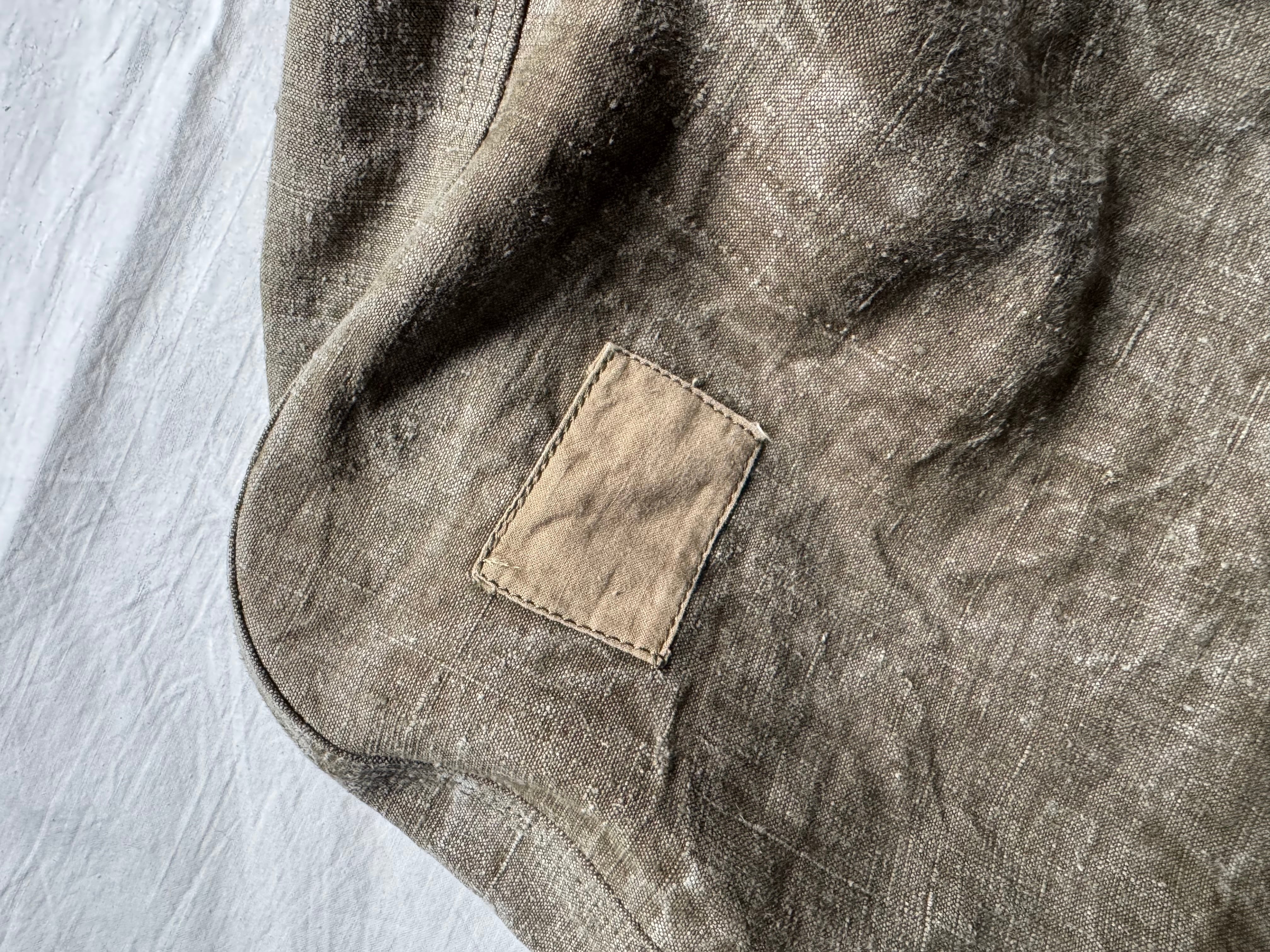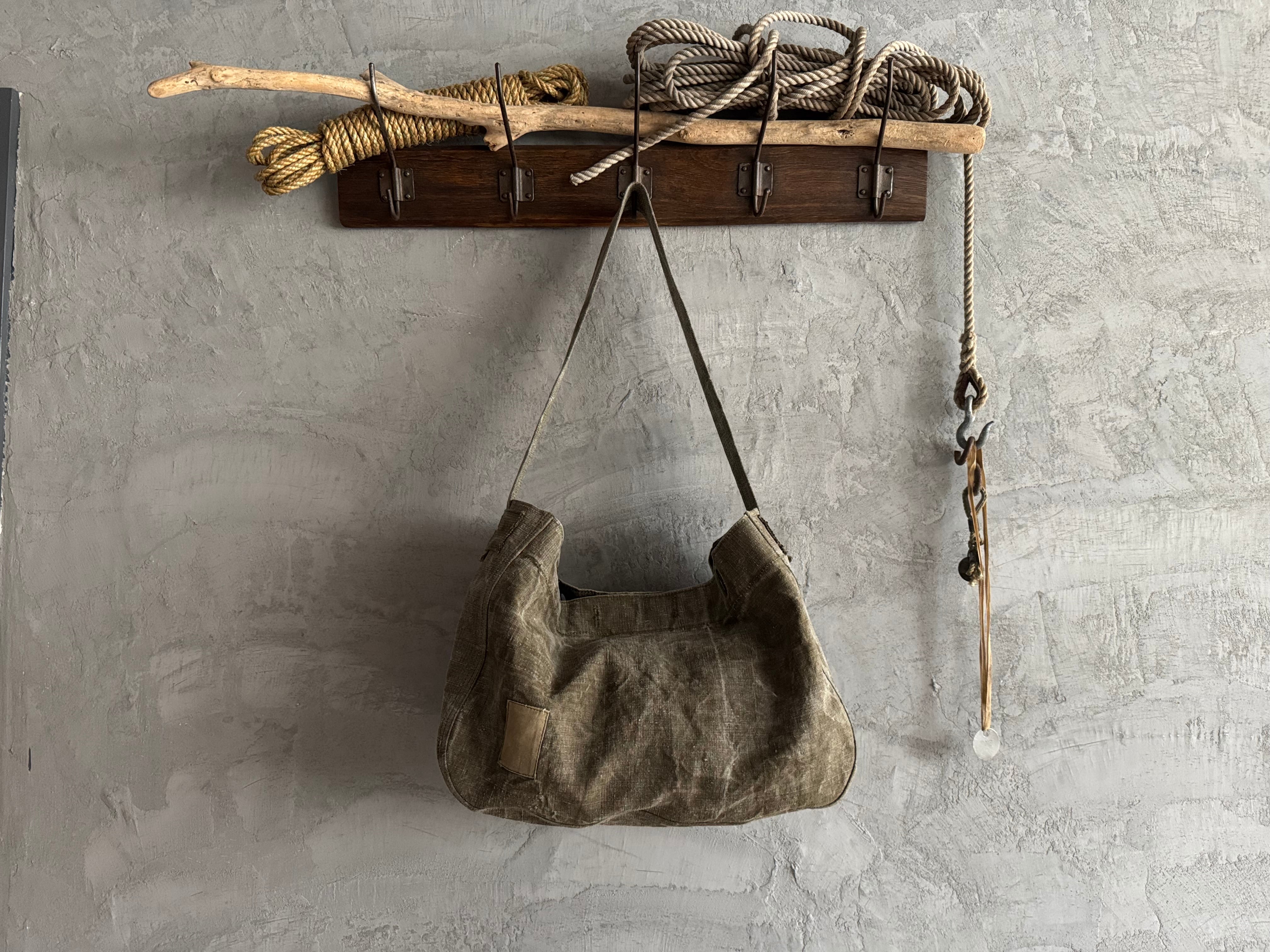 リネン特有のくったりとした質感、そして開口部に残る 楕円形のハトメ が、長い年月を旅してきたヴィンテージならではの佇まいを感じさせてくれます。