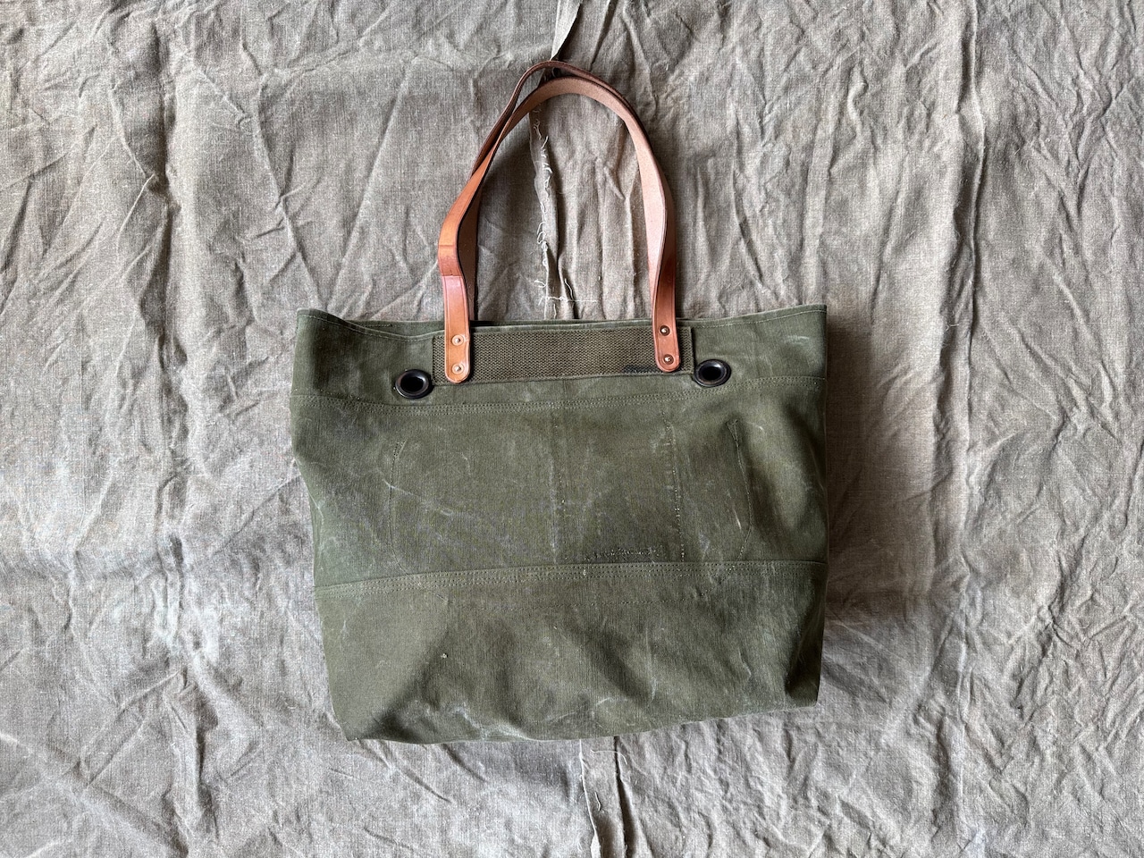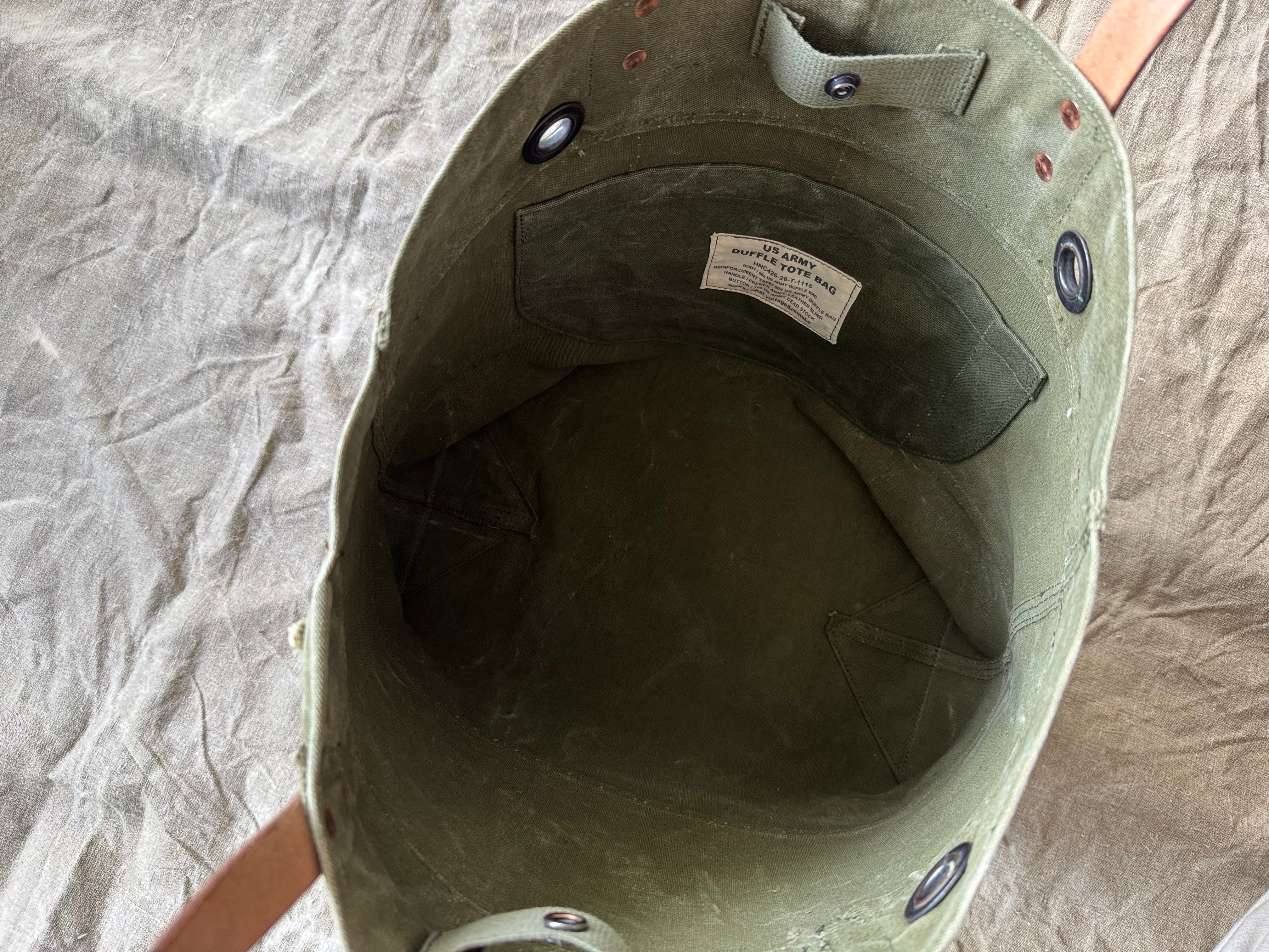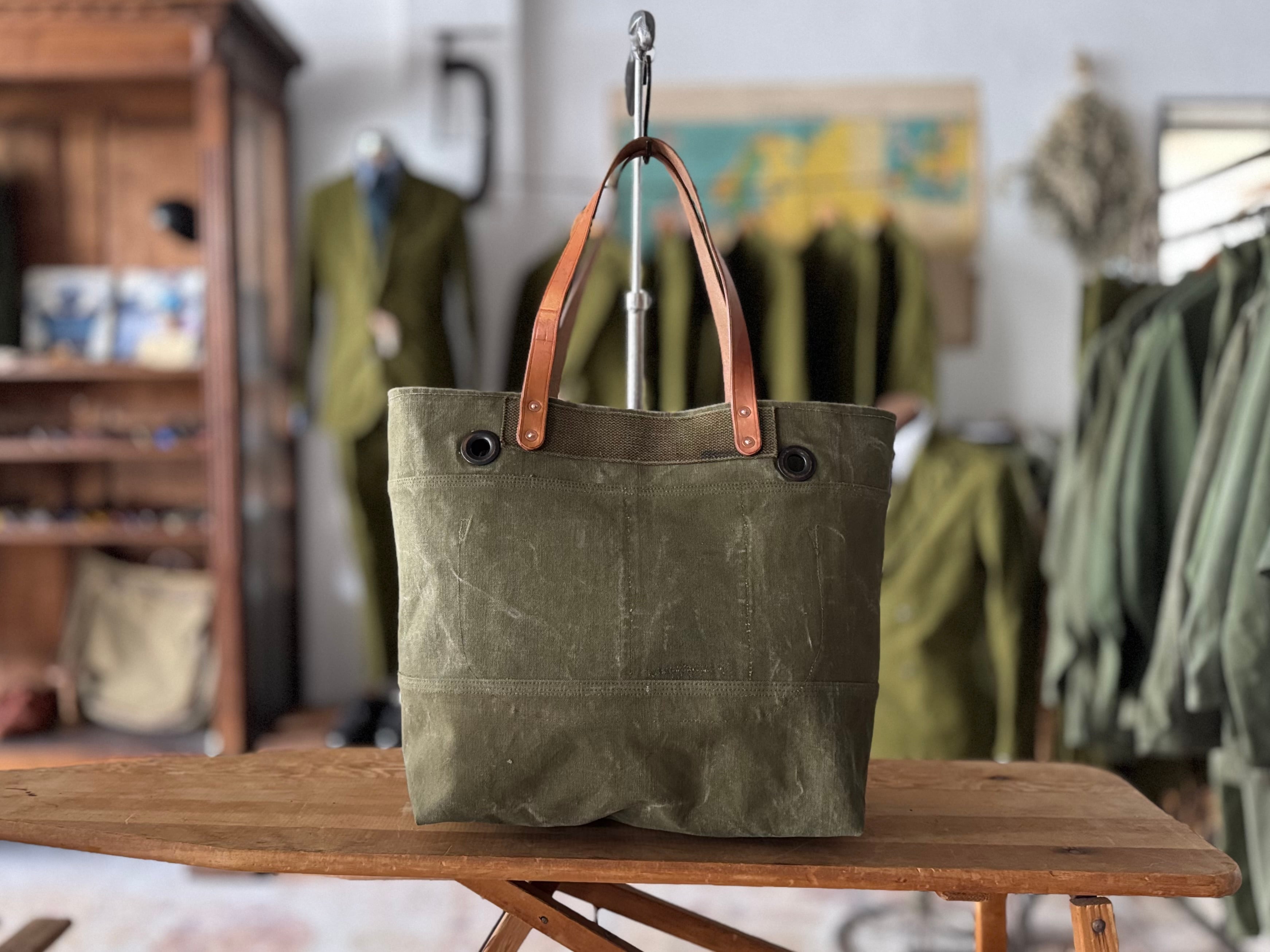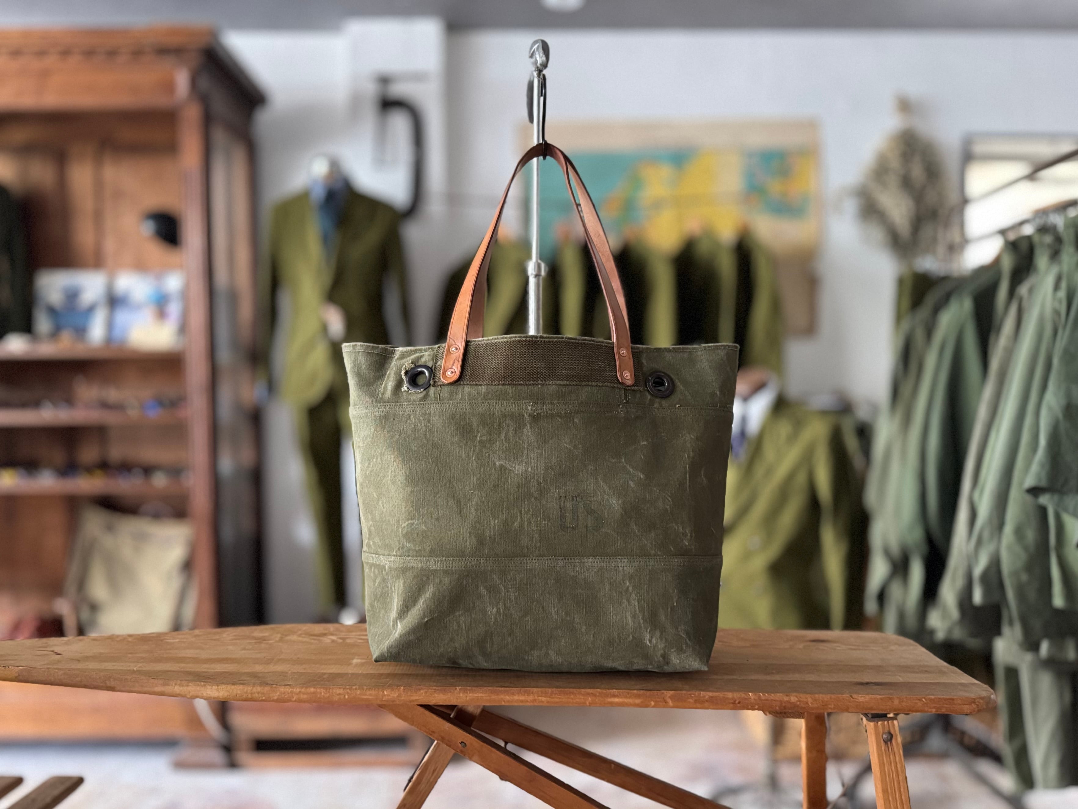 ボディーは60年代のアメリカ軍で使用されていたダッフルバッグ。ダッフルバッグの名残りを残した武骨なハトメ、前面に入った『US』ステンシル、開口部裏側に印字されたミルスペックなど、ヴィンテージ感満載です。