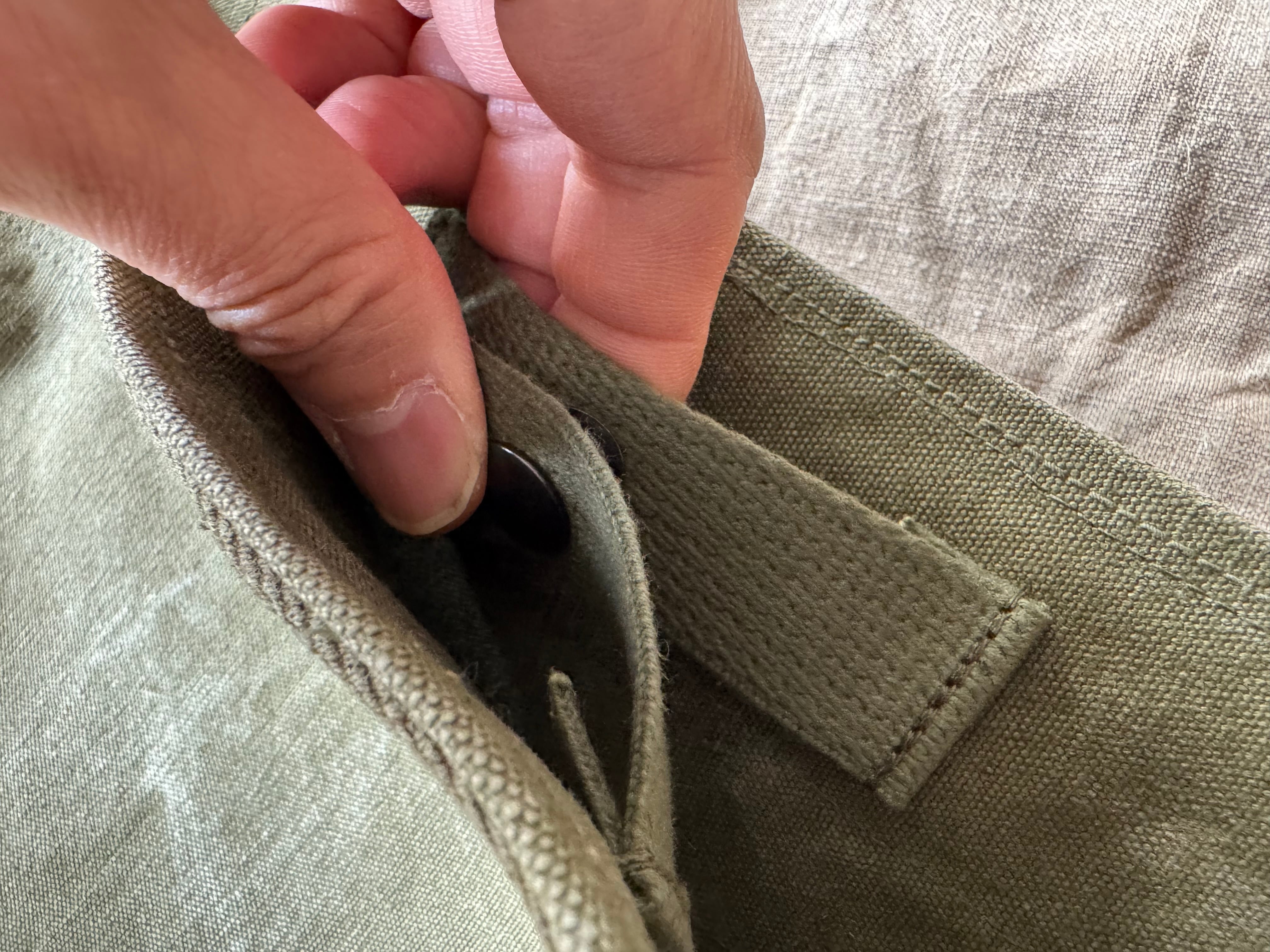 開口部のスナップボタンには、70年代にスコービル社が米軍に納入したデッドストック「DOT」刻印入りボタンを使用し、細部までこだわった仕上がりに。