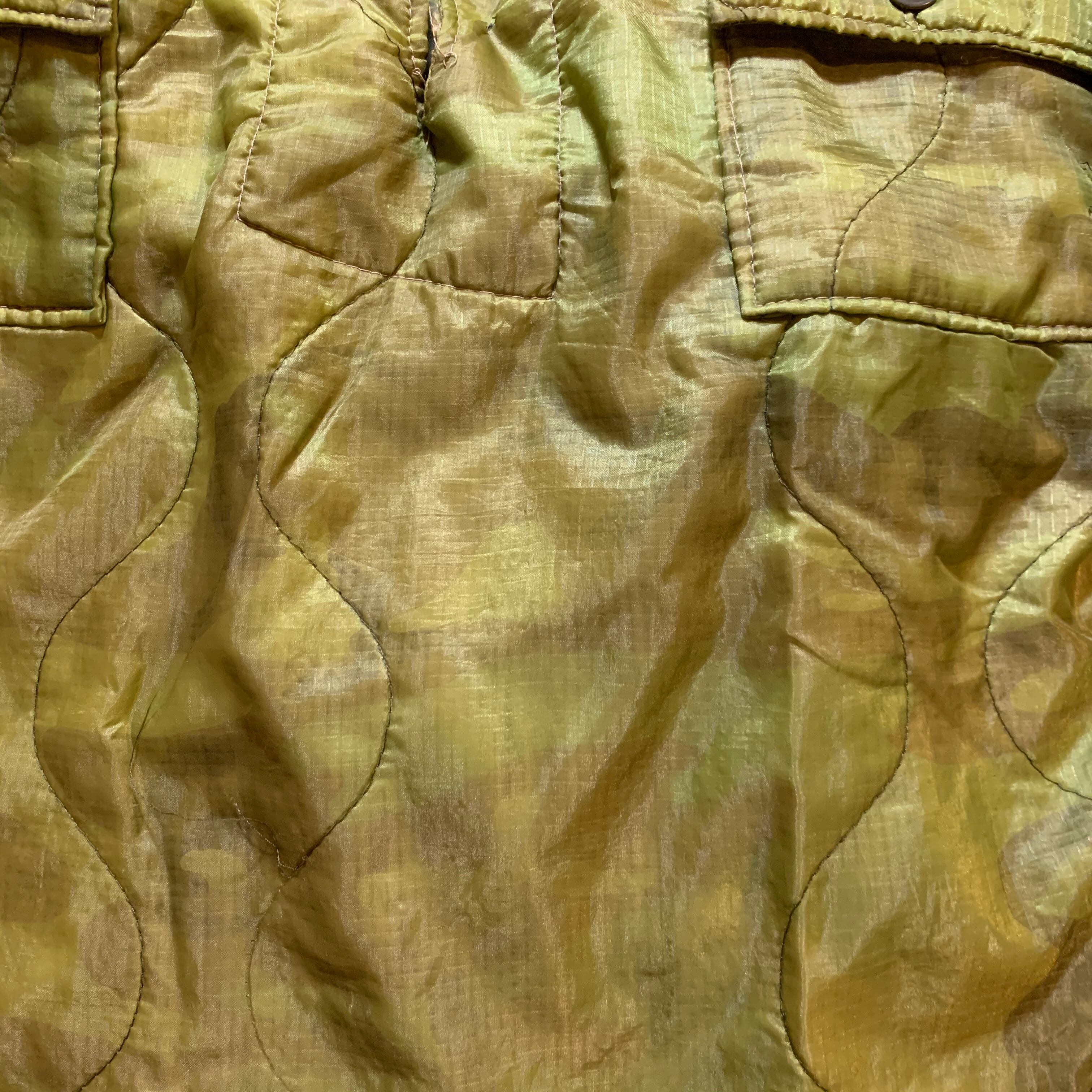 うっすらとしたカモフラージュ柄が入ったプルオーバーのキルティングジャケット。