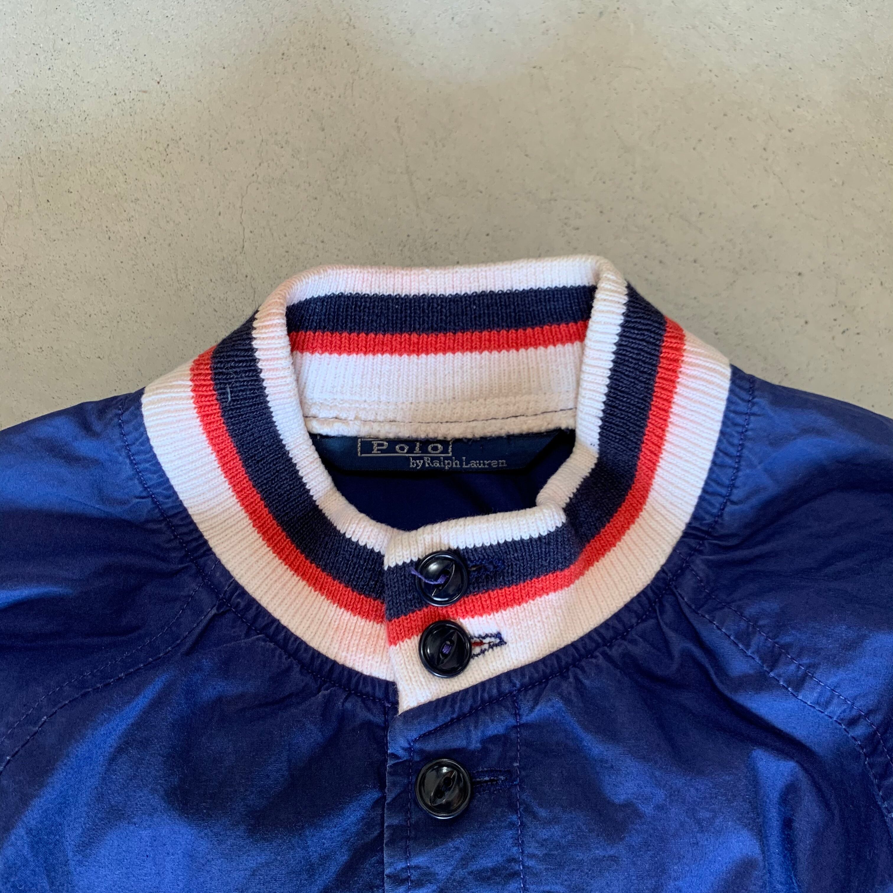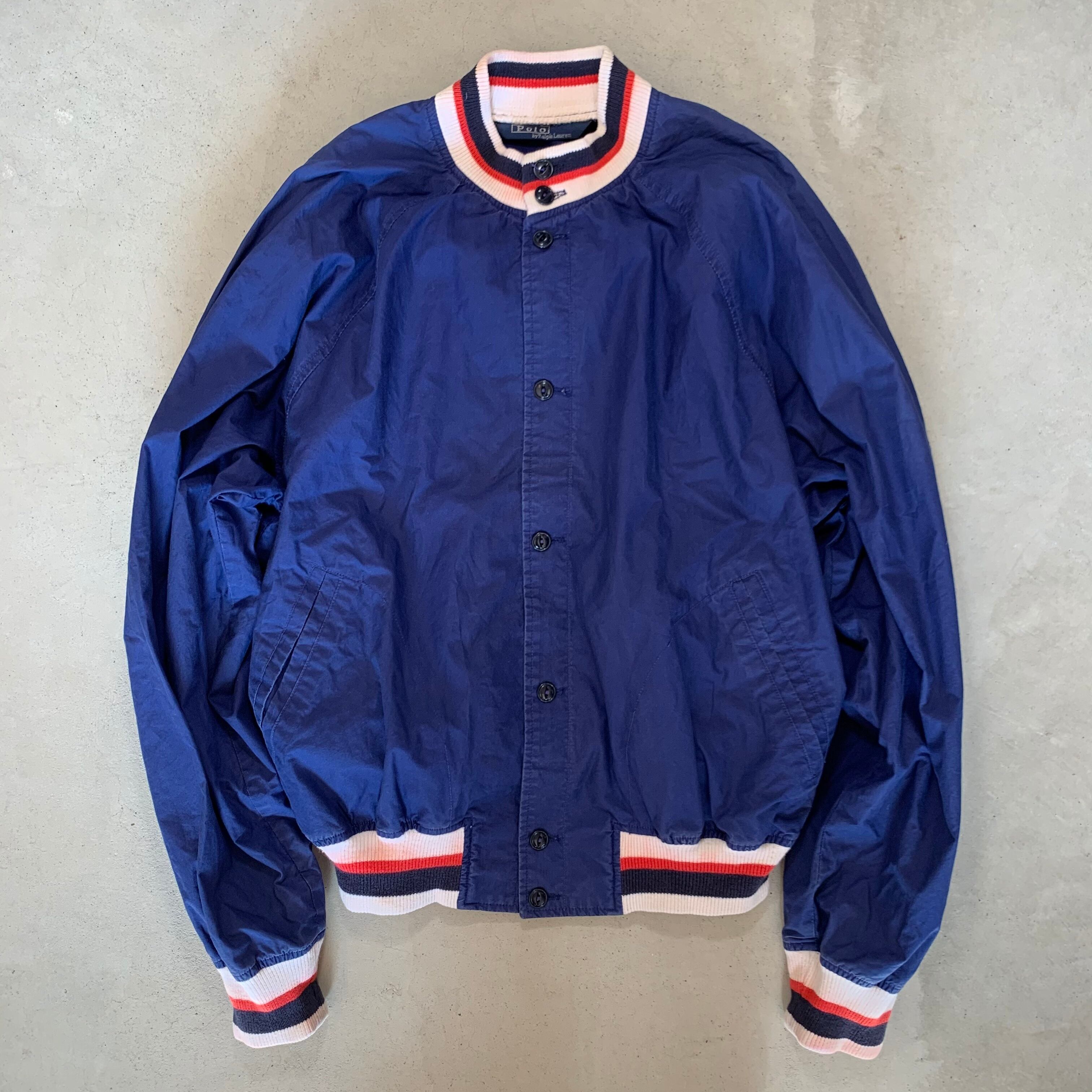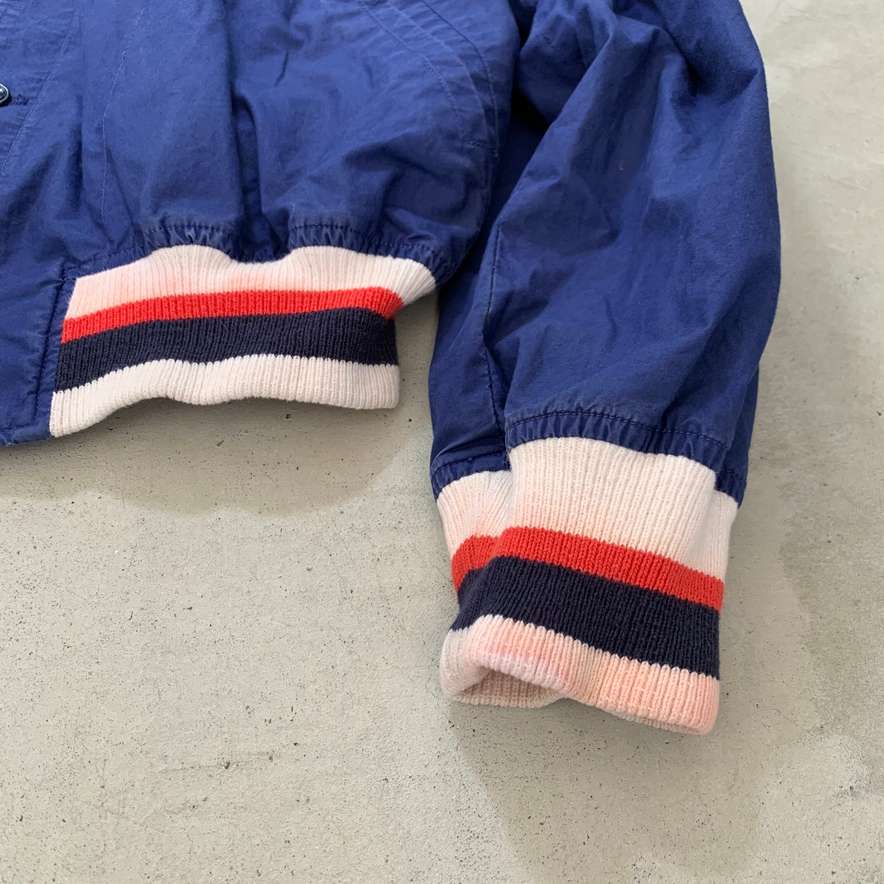 張りのあるコットン生地に鮮やかなブルーに白と赤のリブが映えます。