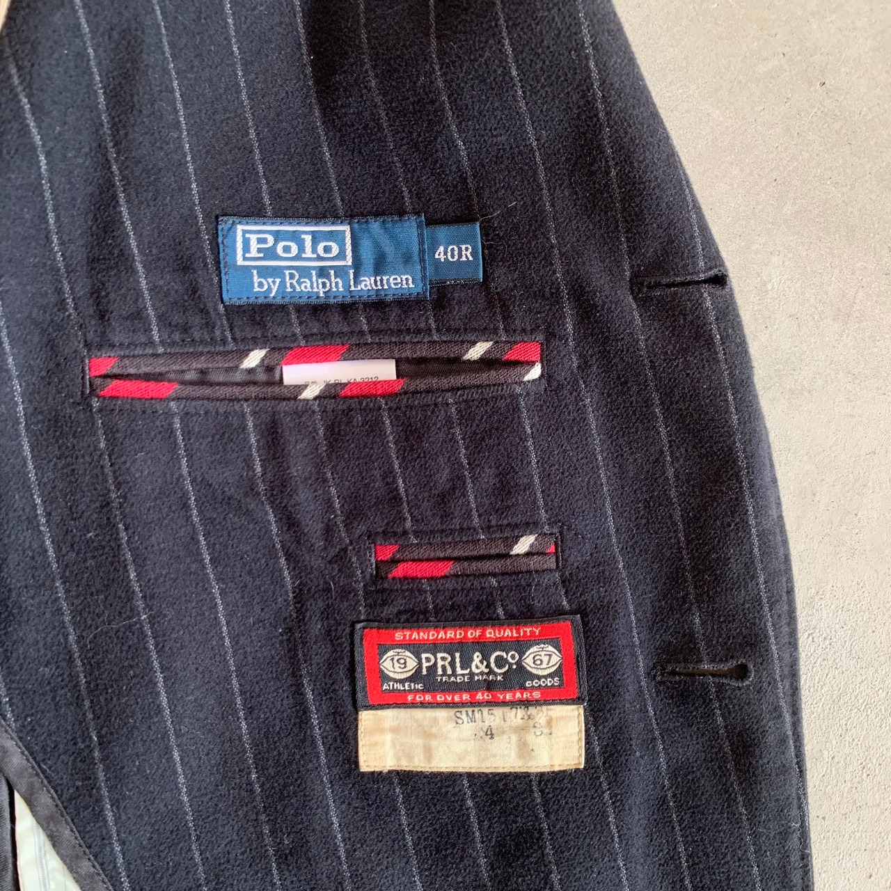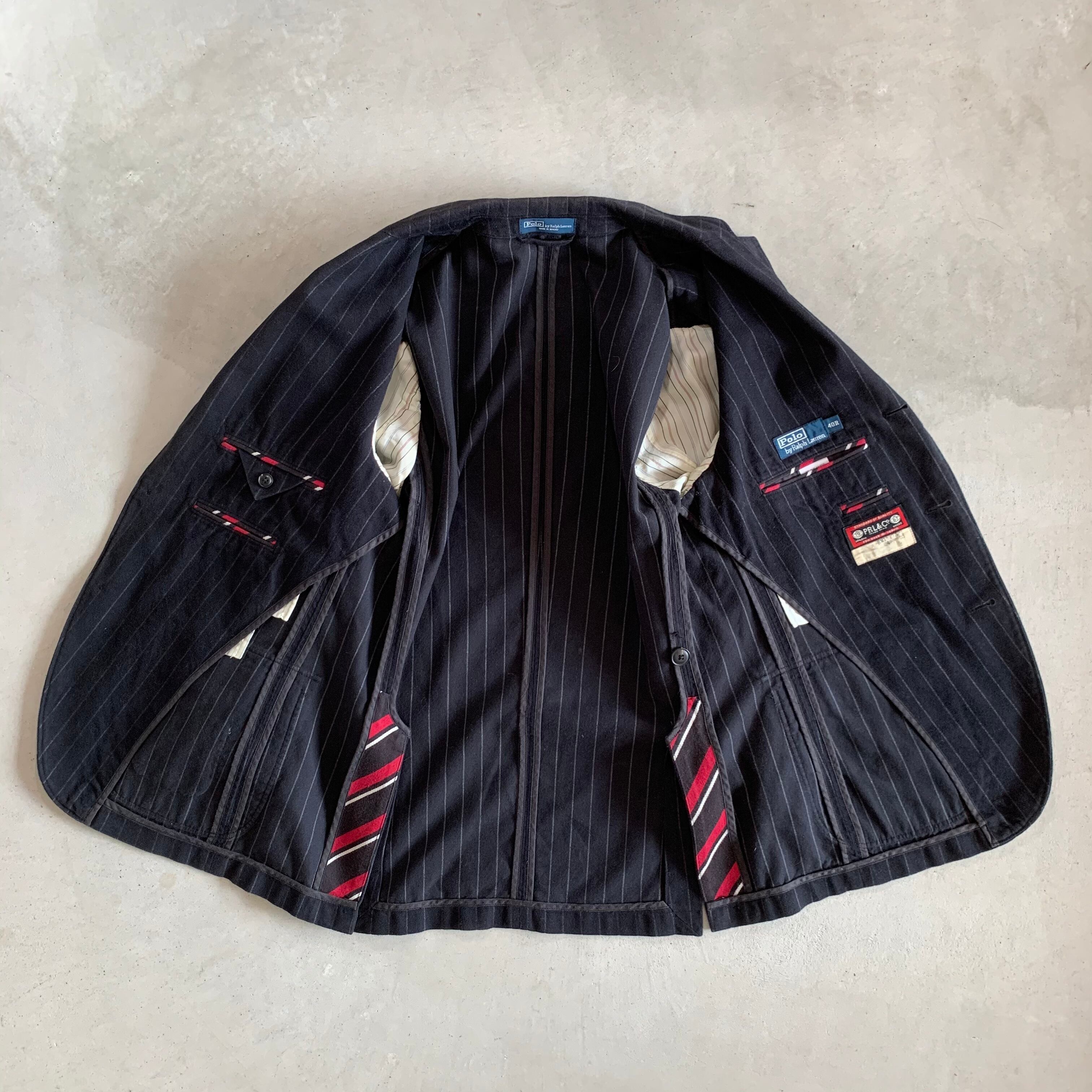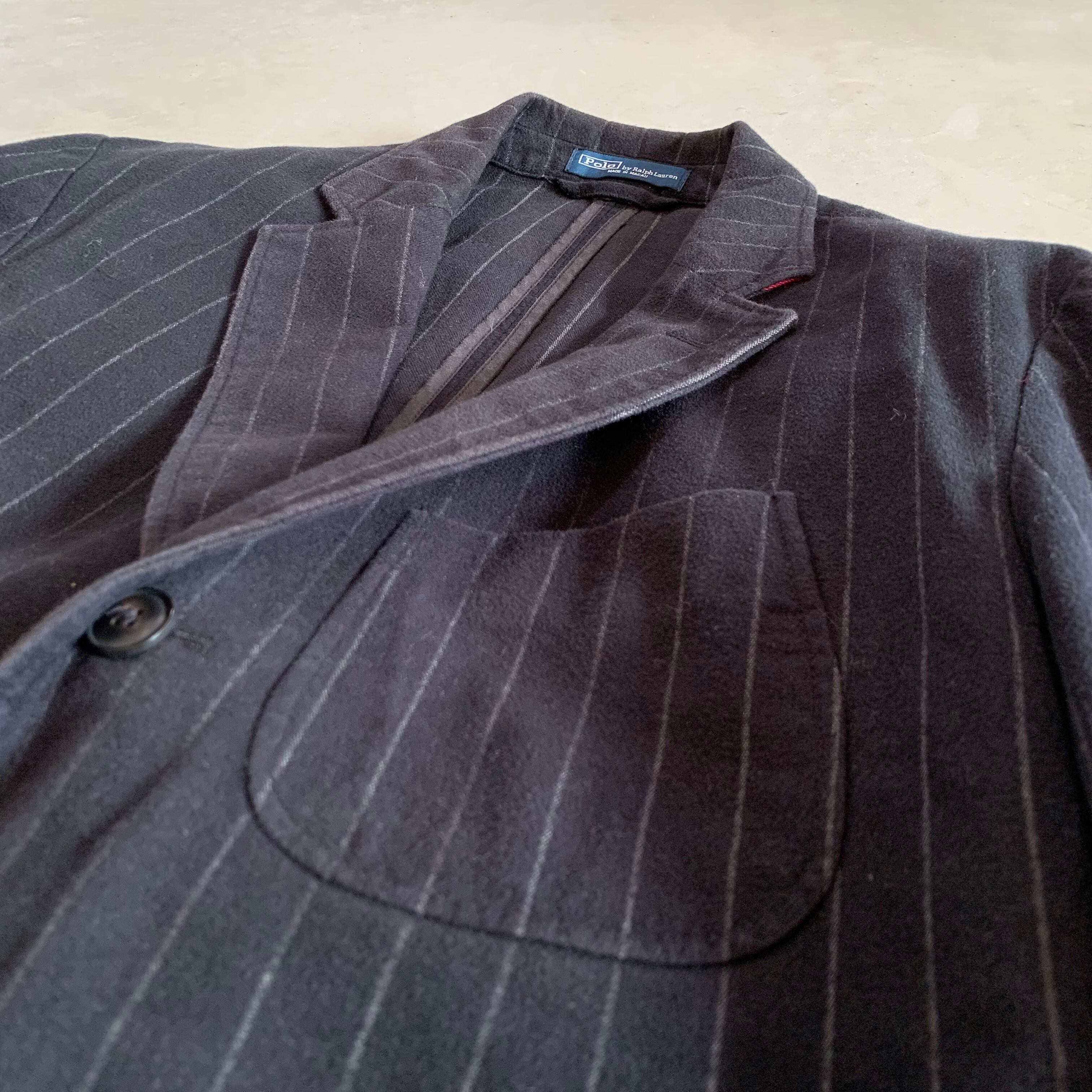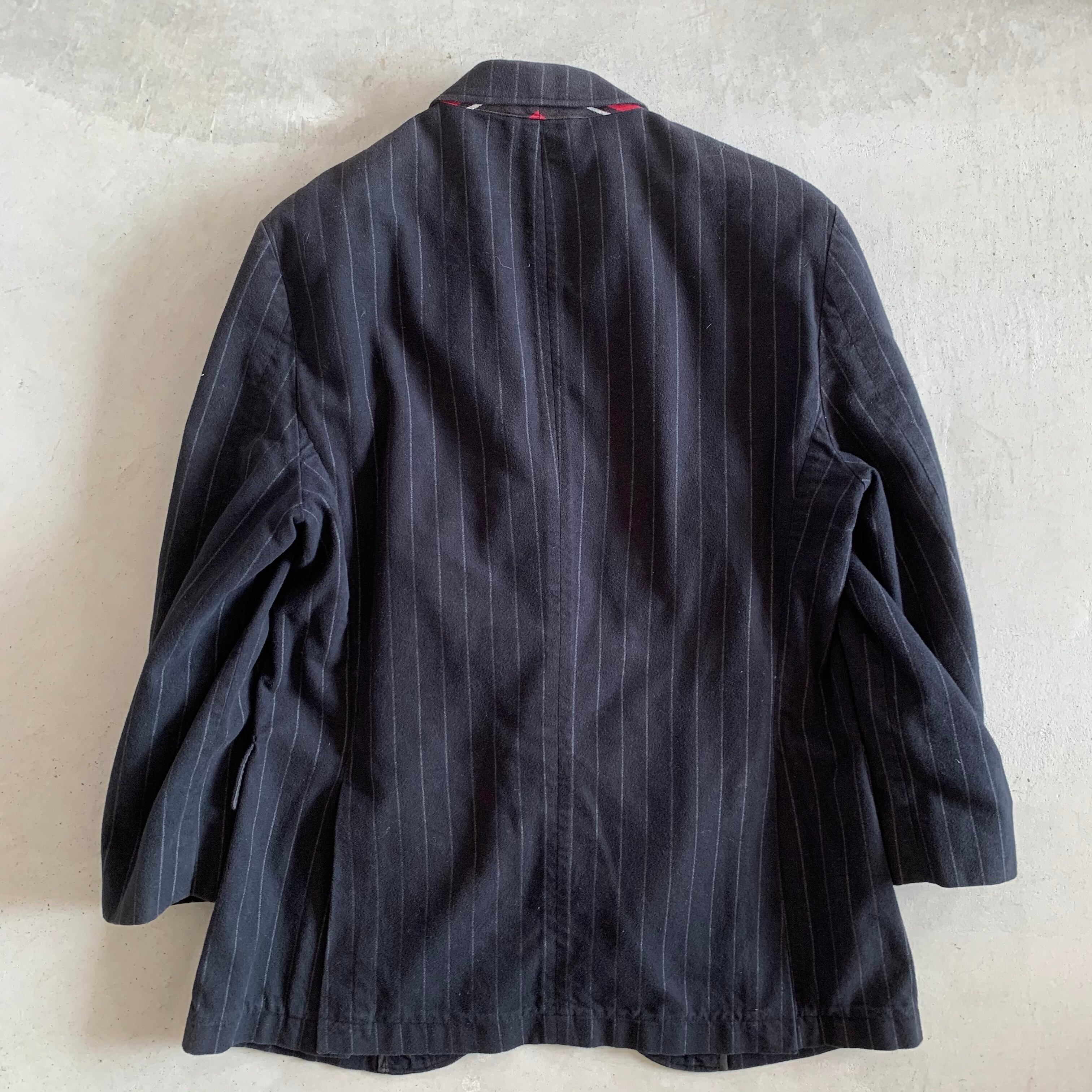 カジュアルなつくり。黒にチャコールのピンストライプ柄のテーラードです。