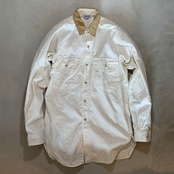 こちらのシャツは、普通の生地感とは違いかなり固めの生地です。春先にはライトアウターがわりできていただけるかと思います。襟とカフスがコーデュロイ素材にされており、ゴワゴワとした男臭い生地感が相まって、ワーク感がすごいです。