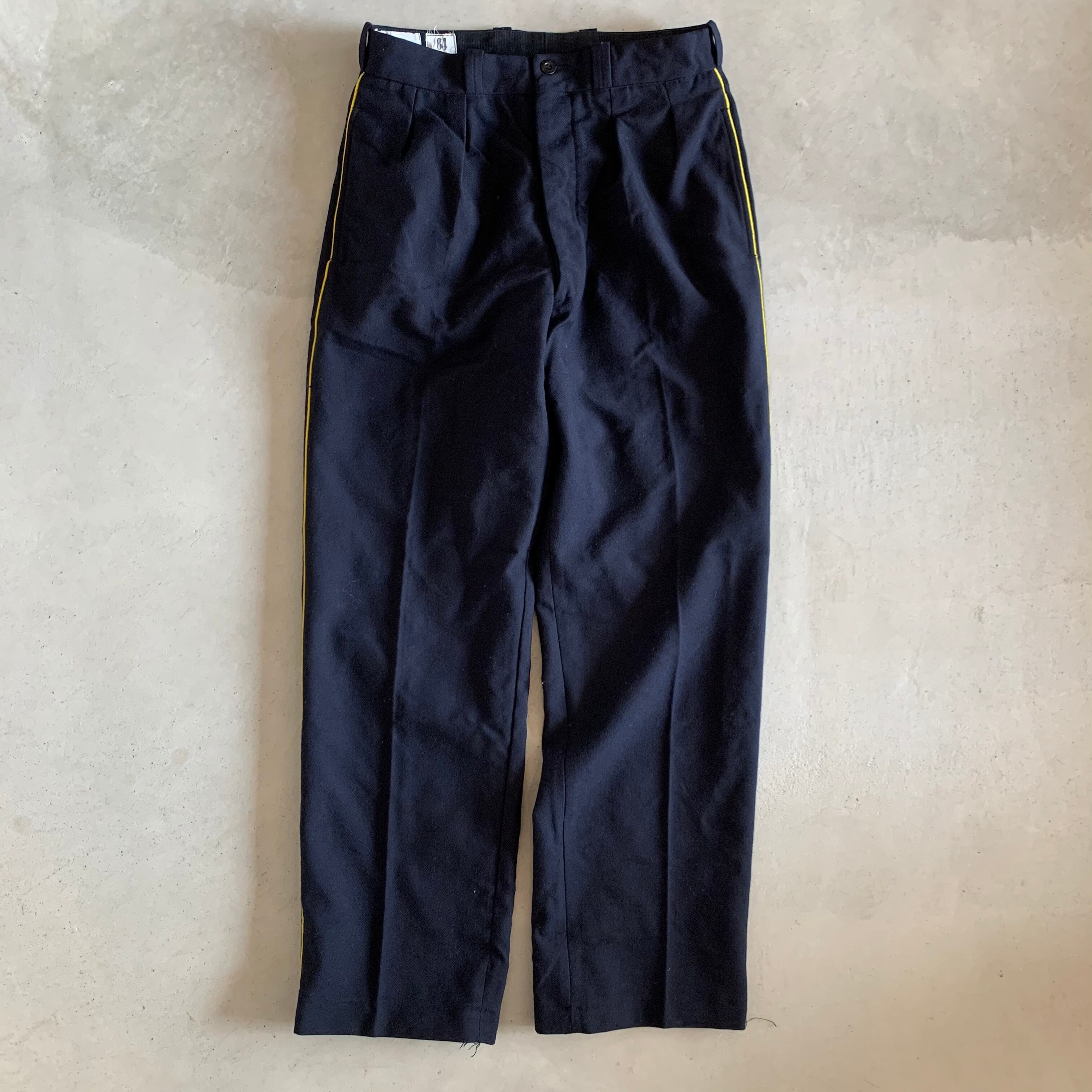 調べましたところ、国境警備隊に支給されているパンツみたいです。主張しすぎない、細いイエローラインが、濃紺のウール生地に映えます。