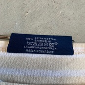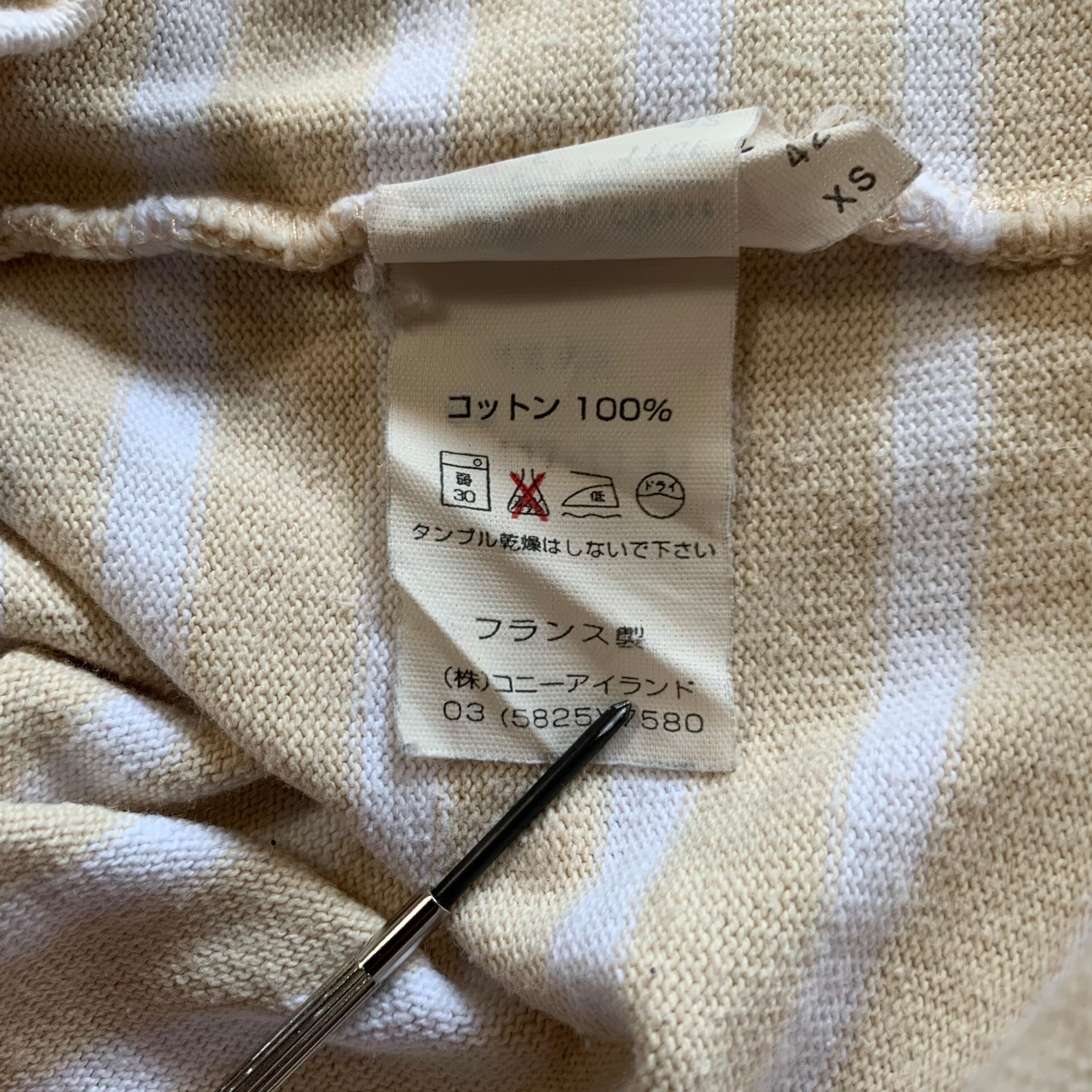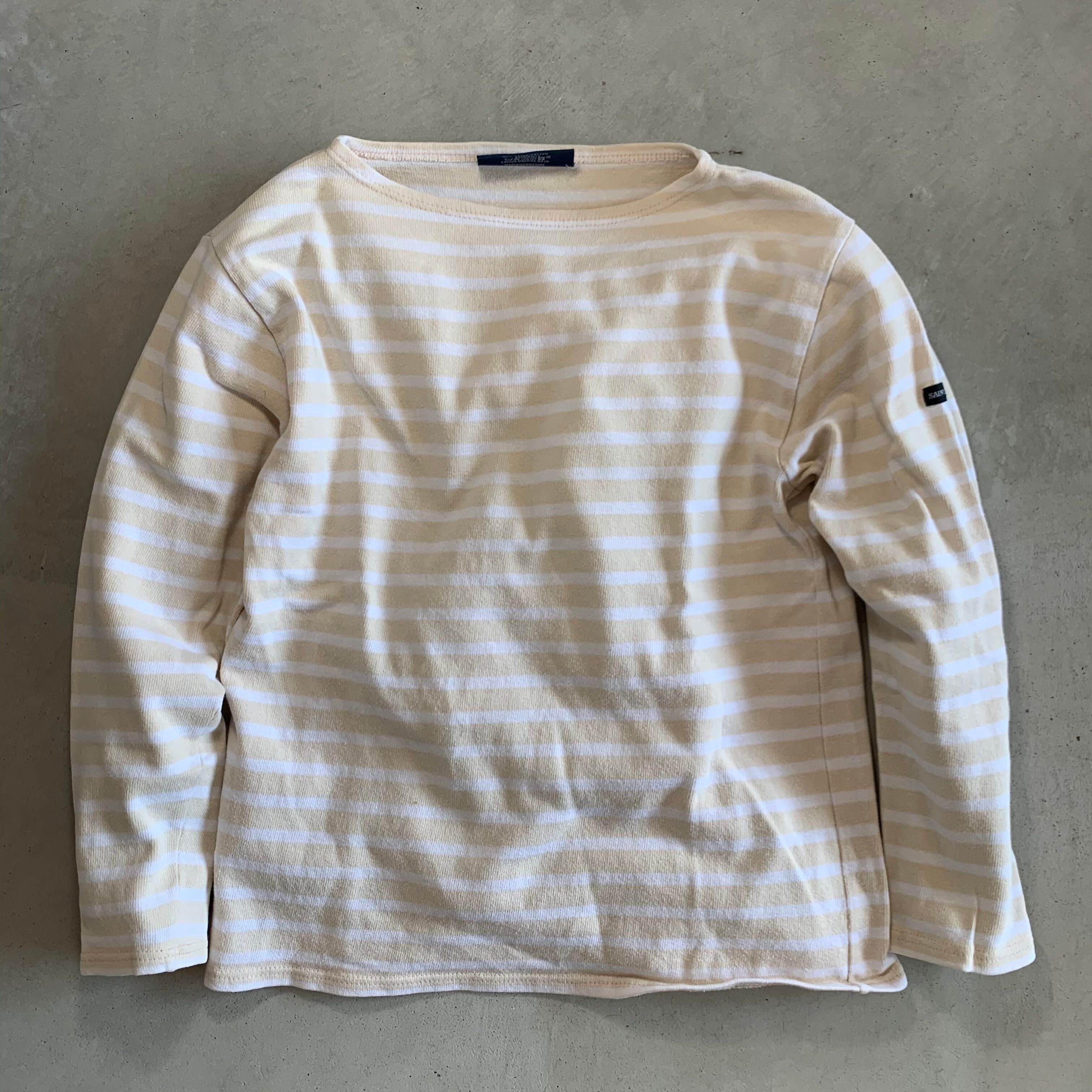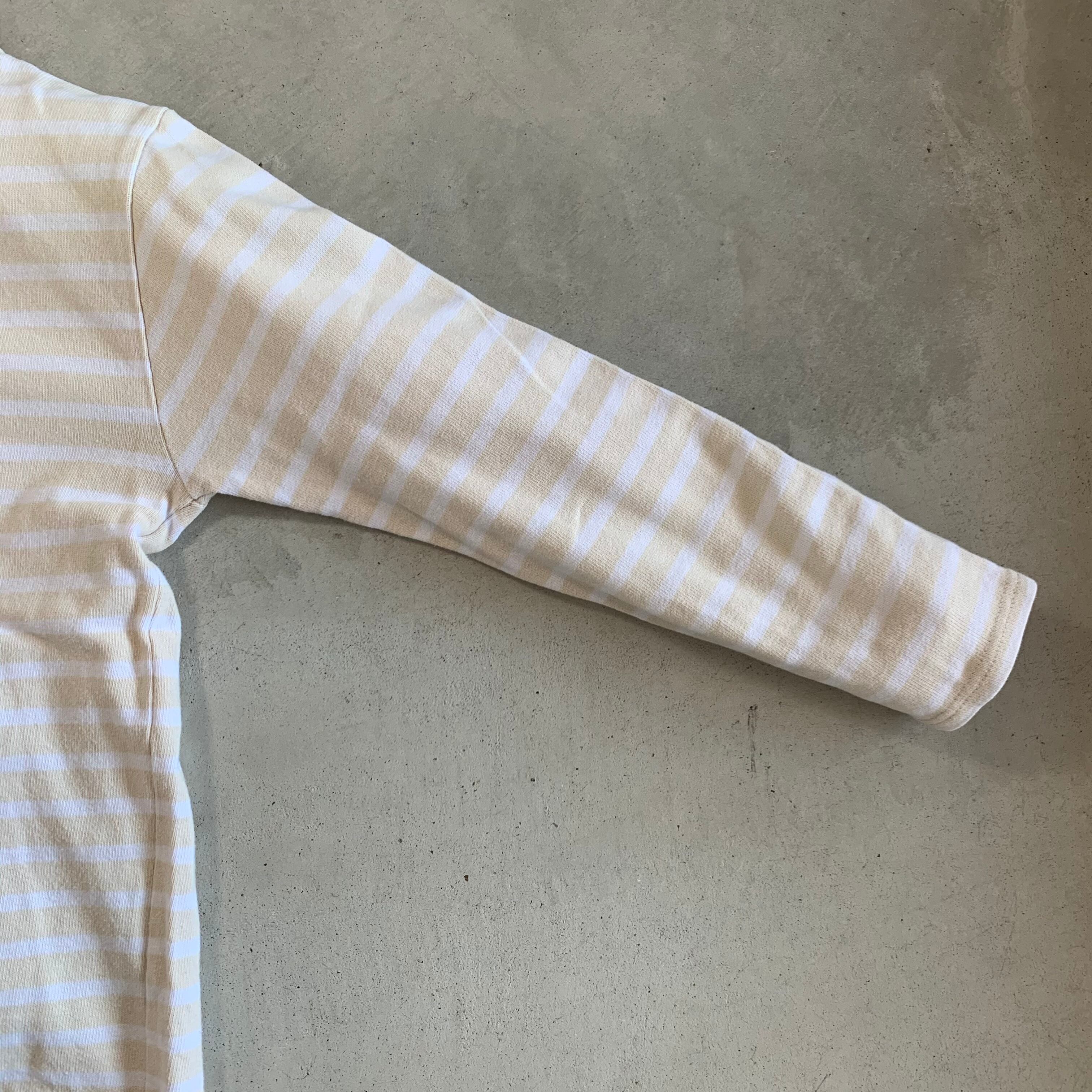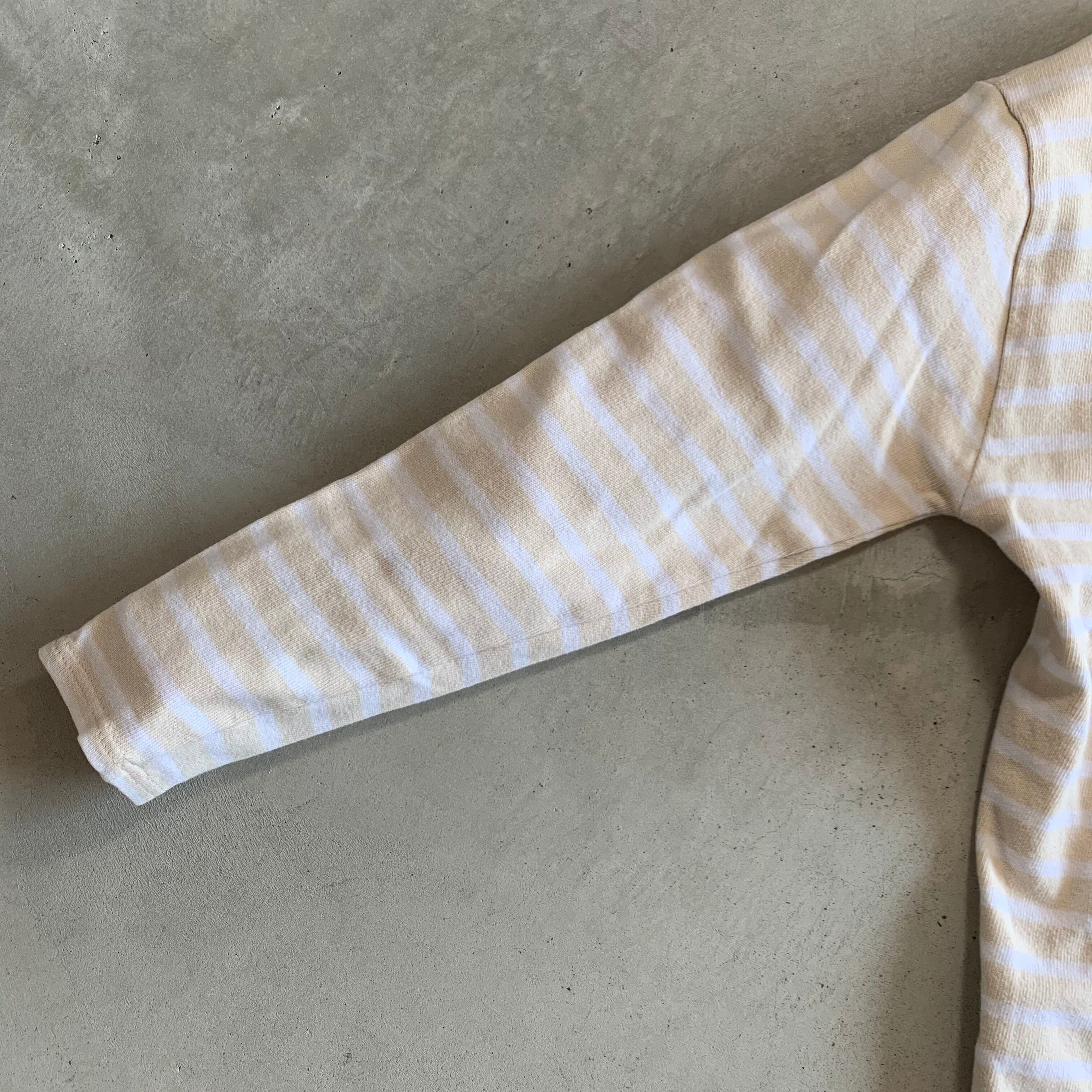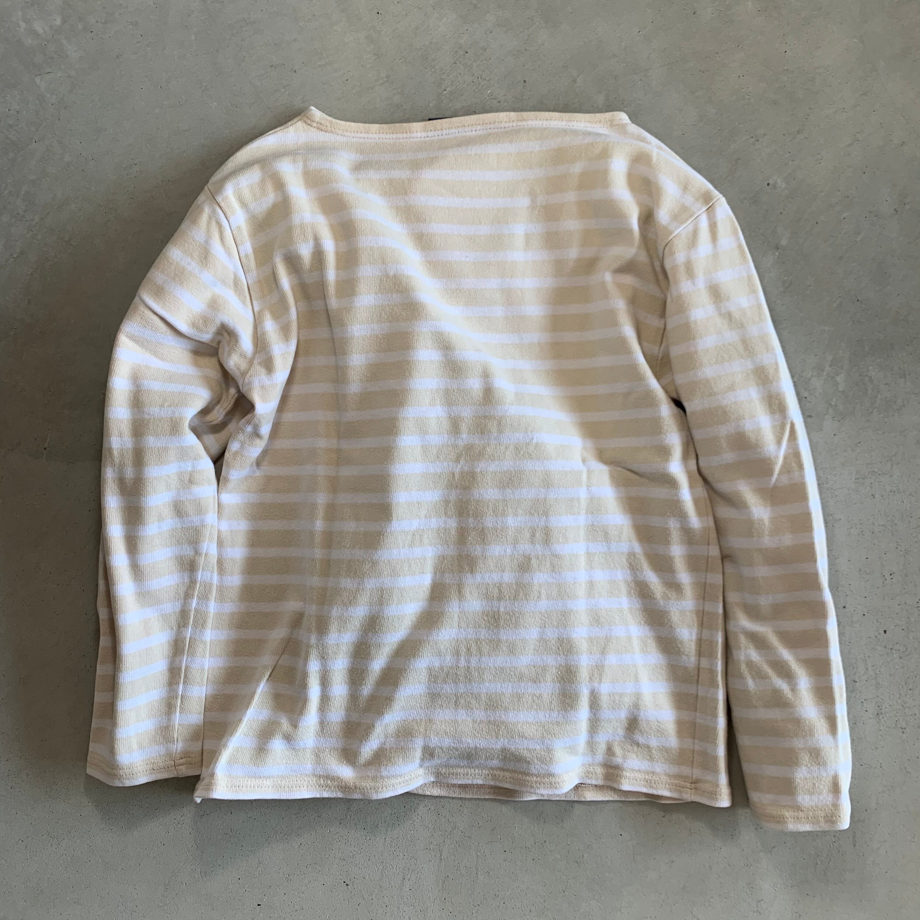 ベージュと白のナチュラルな印象のボーダーカットソー。