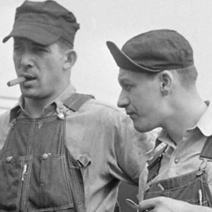 あと、昔の着用写真とかを見るとツバをクリッと上にあげて被ってます。これ、ツバを上にあげて被ることで、作業がしやすくなるんです!ミリタリーアイテムの細かなディテールには全て意味があり、それがカッコいいですね。