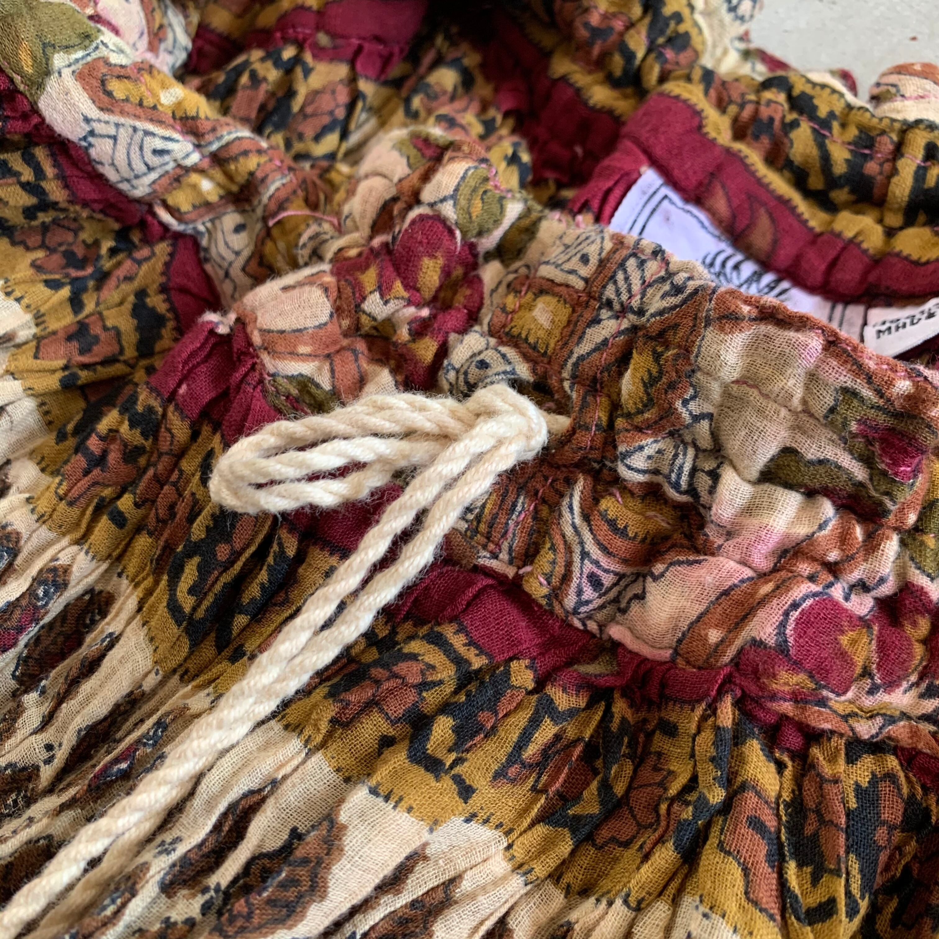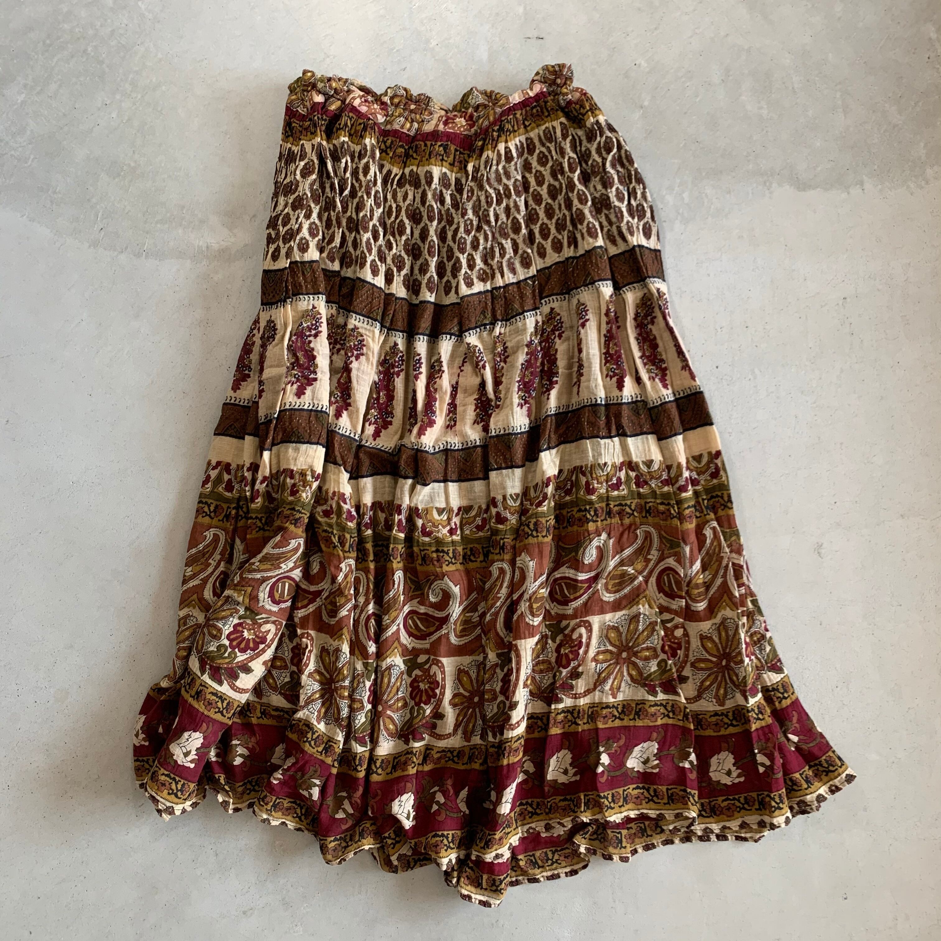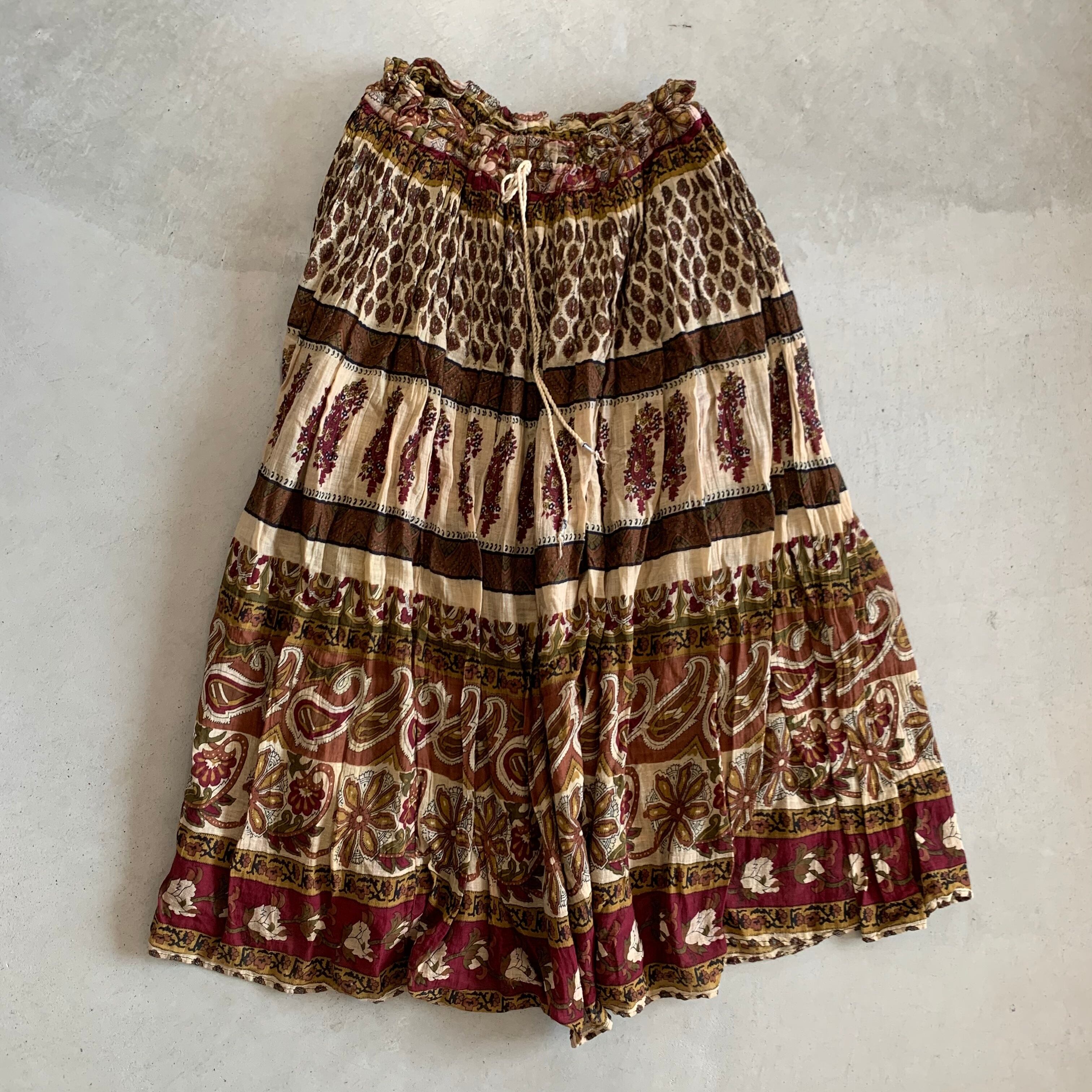 インド綿のエスニックスカートになります。おそらく70年代頃からのものになります。ウエストは紐で縛るタイプになります。所々に色うつりしてる箇所がございます。破れや穴などは無いので、この年代の物としてはとてもいい状態かと思います。