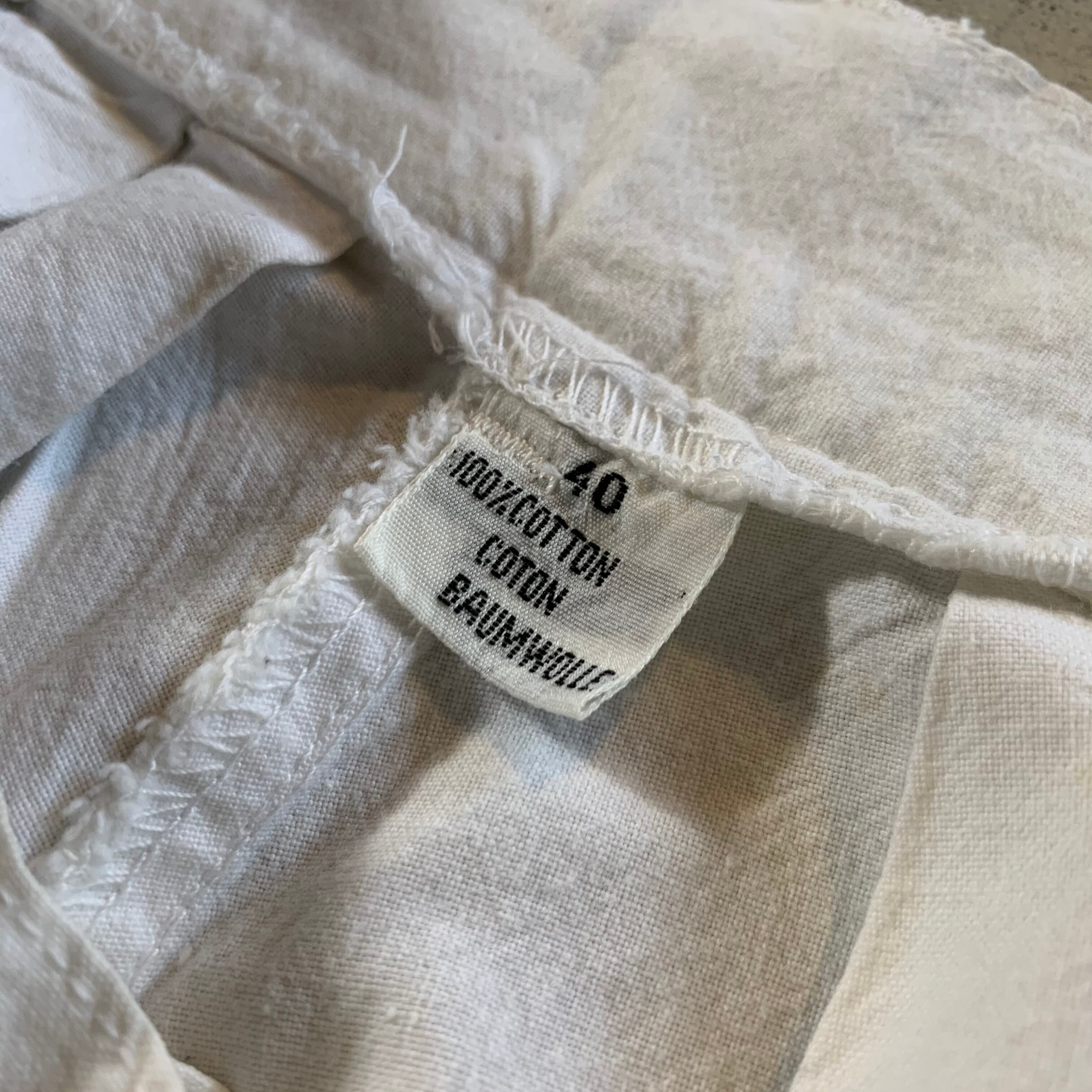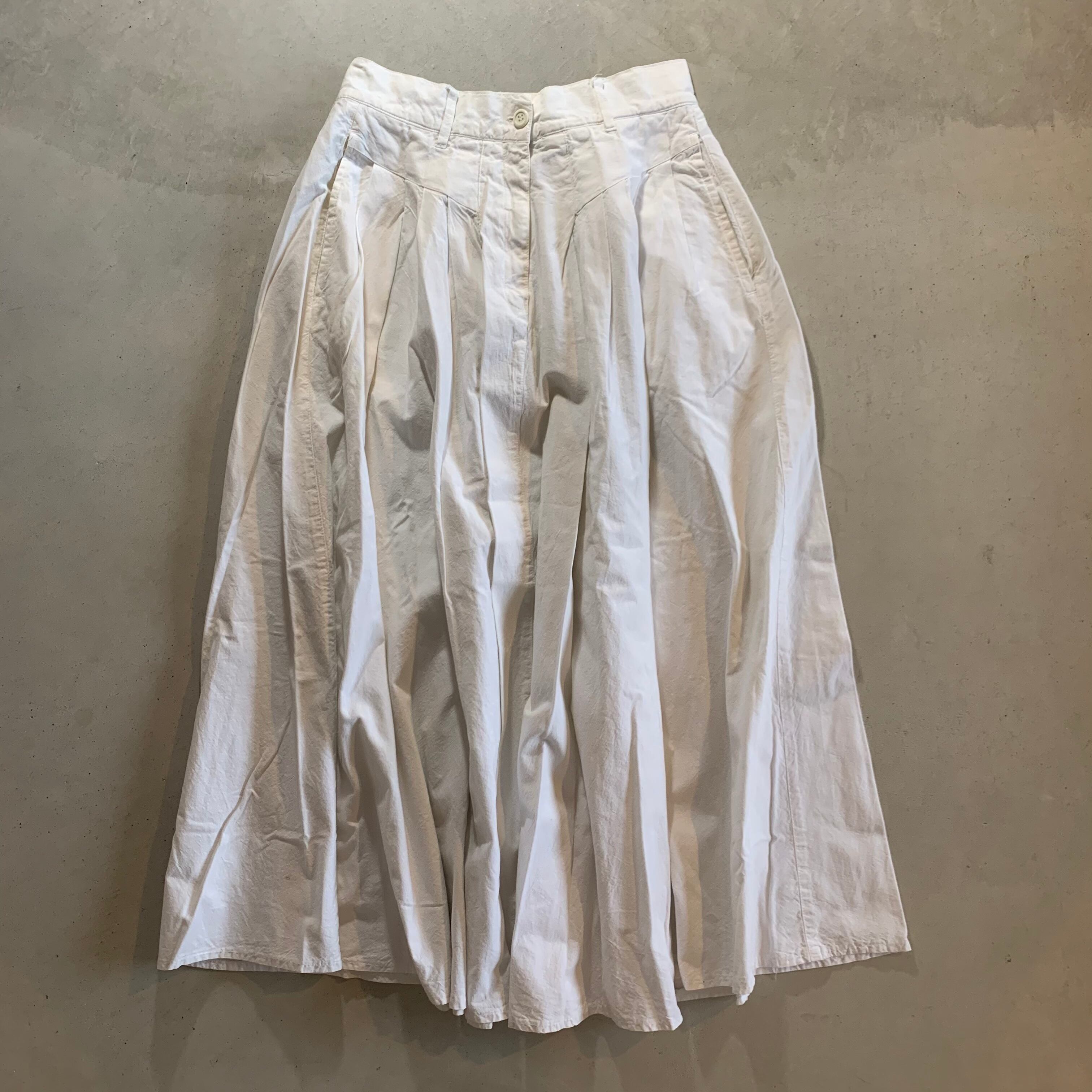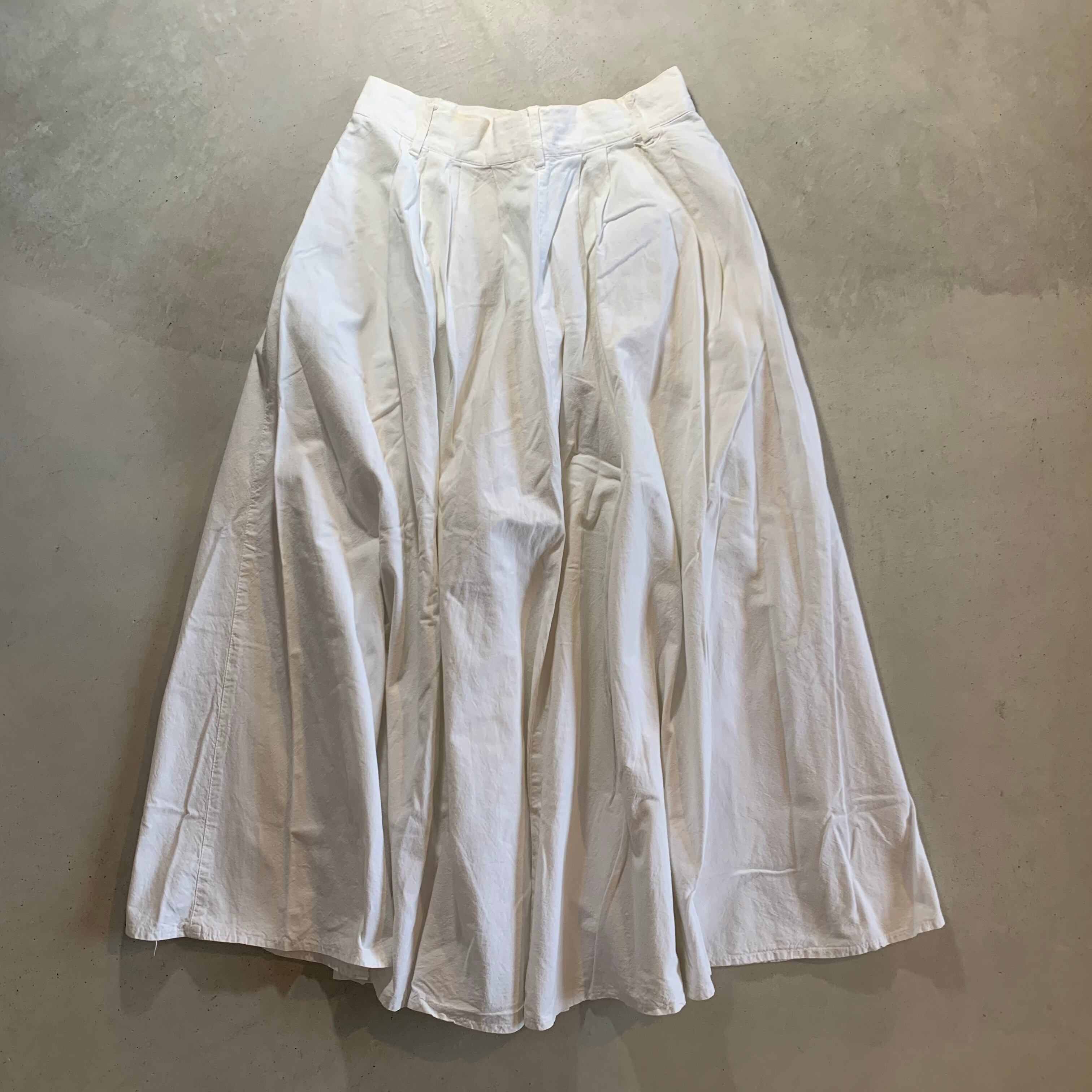 コットン100%の白いロングスカート。ゴワゴワした質感の生地を使用しているので、透ける心配はありません。用尺も多く使ってるのでフワッとボリューム感のあるシルエットになります。