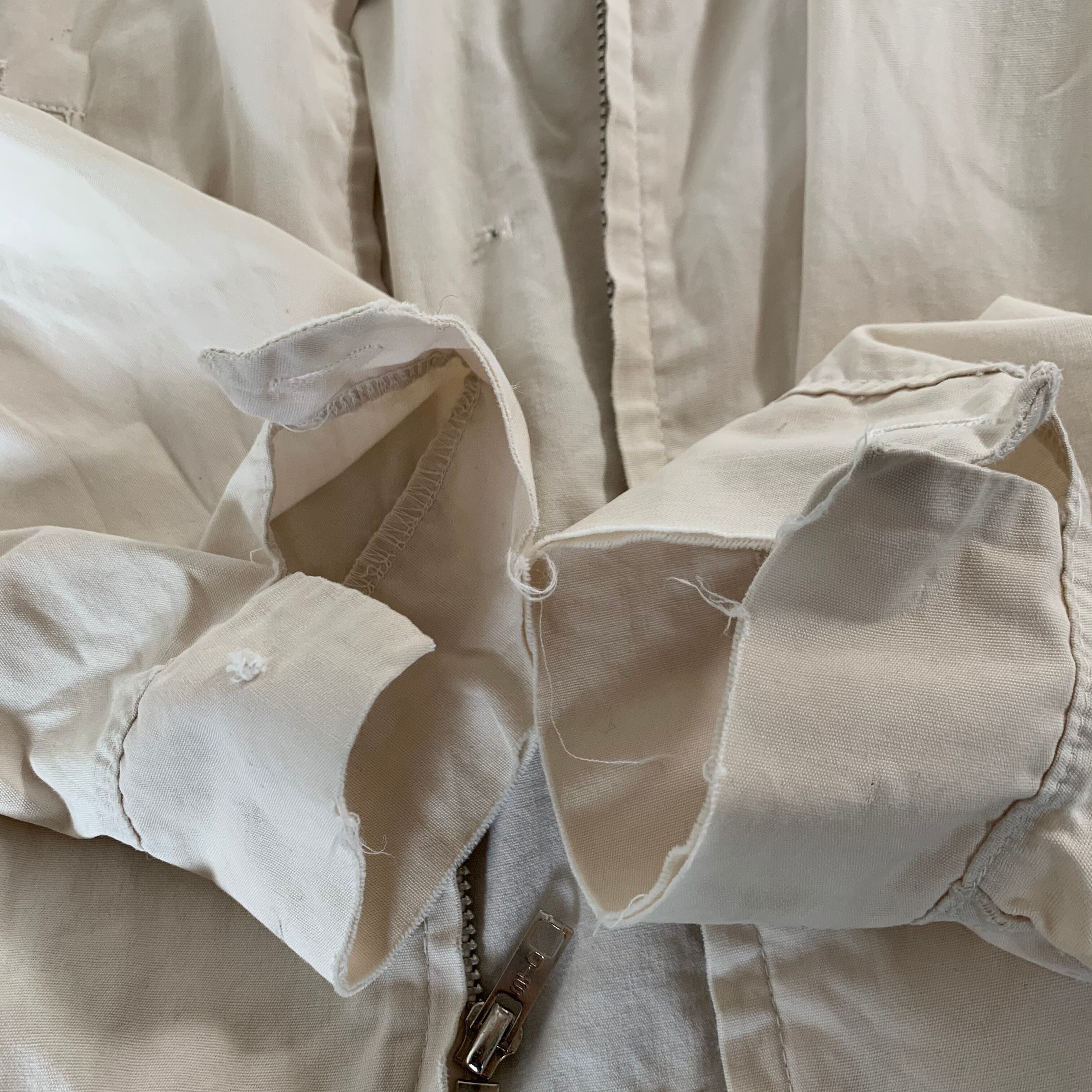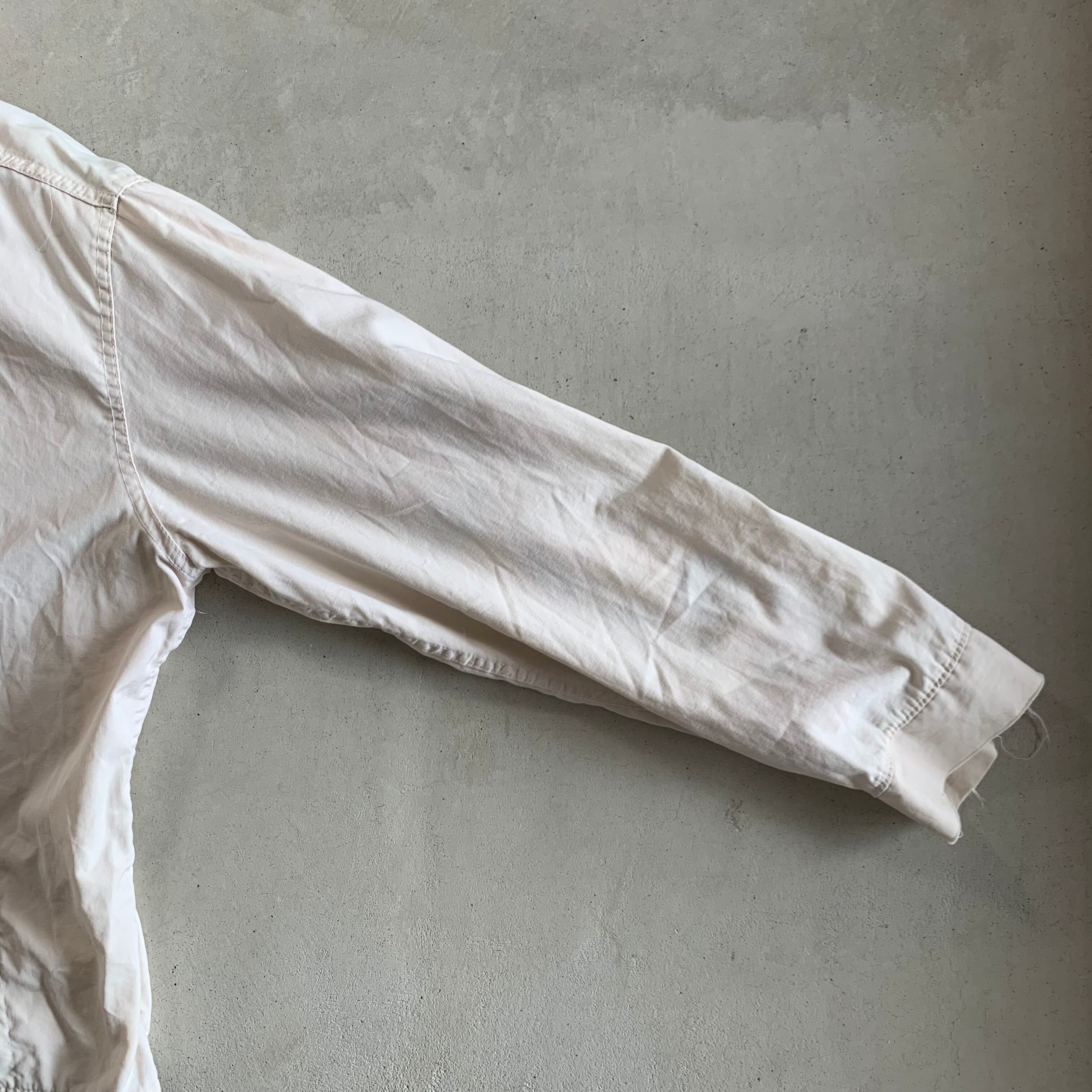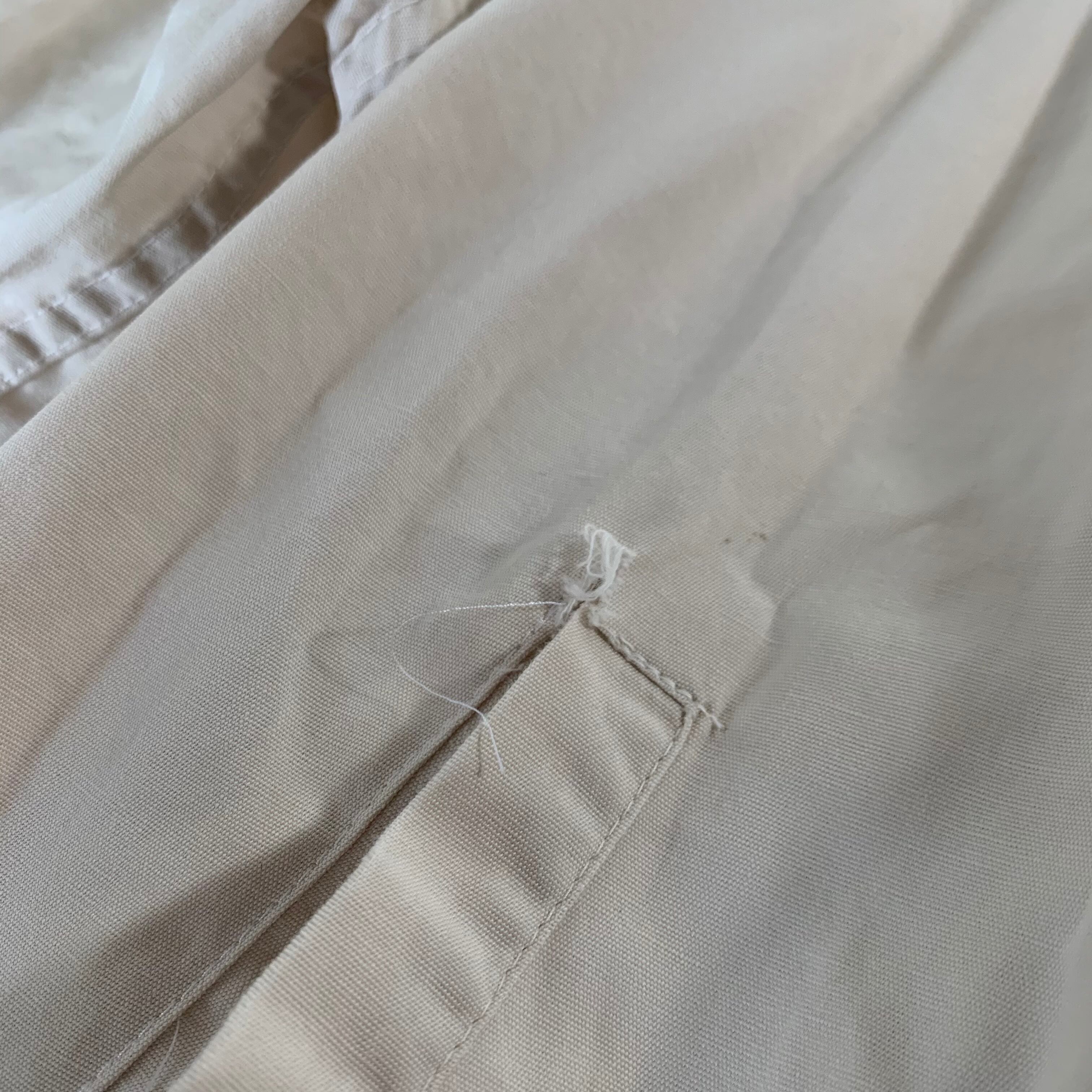 両袖がほつれています。襟周りにダメージがあります。背面の真ん中下あたりに小穴があります。右ポケット上が少し裂けています。画像でご確認ください。