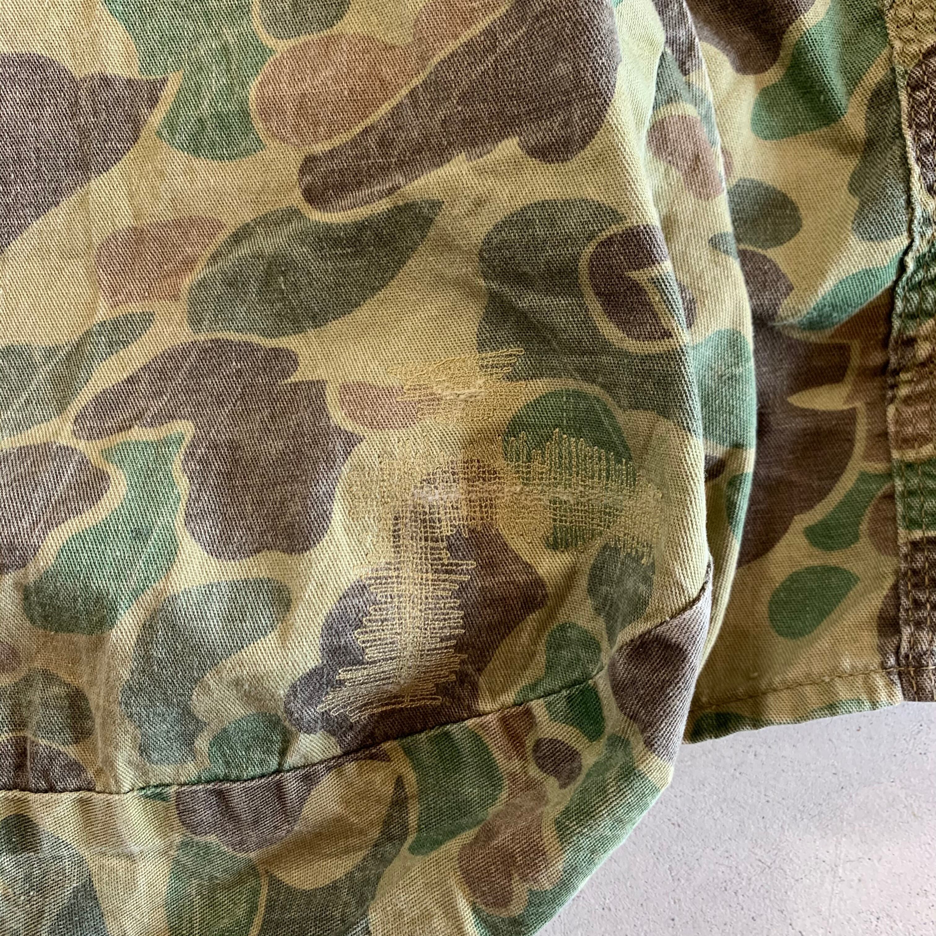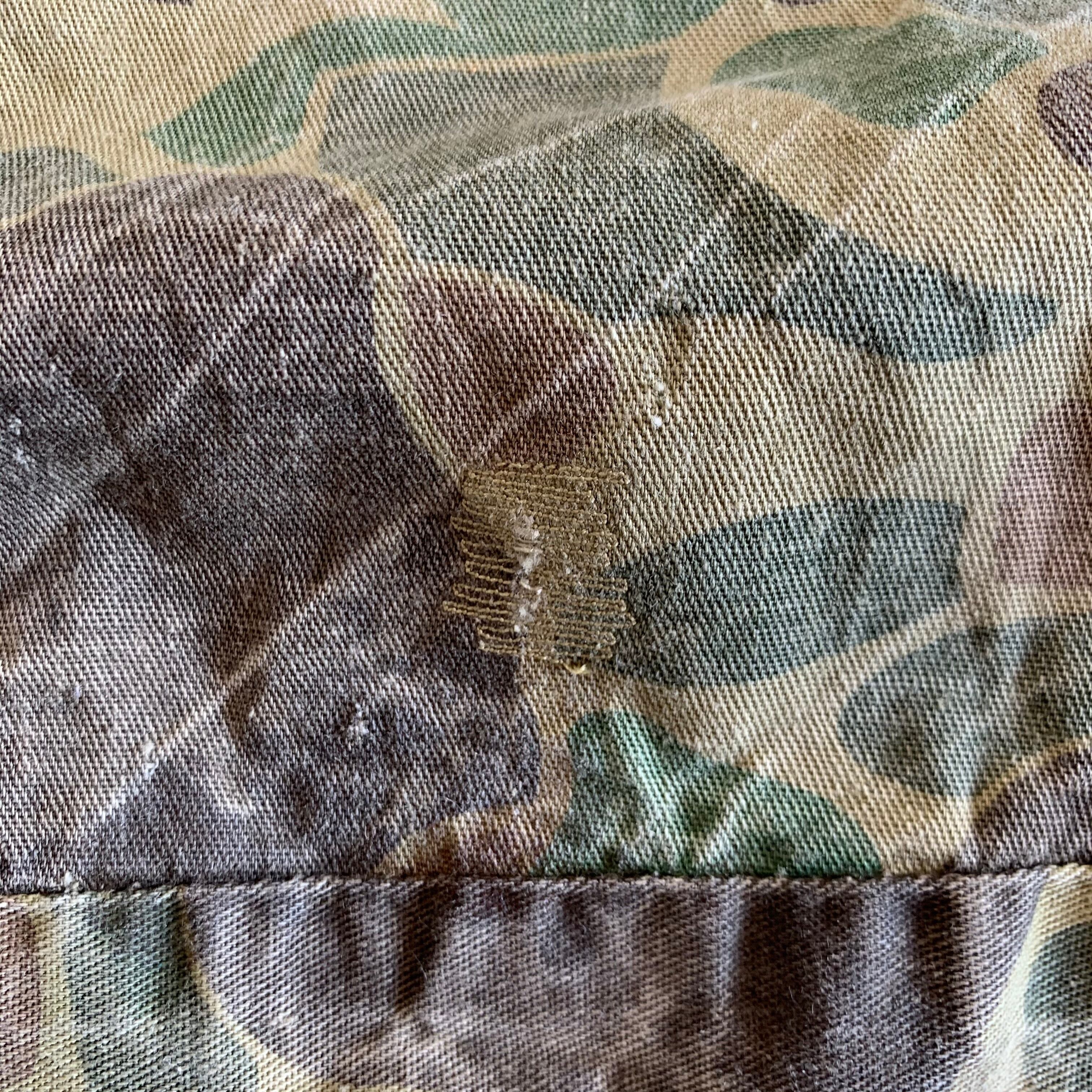 70年代頃のブラックシープのハンターカモ柄のハンティングベスト。背面のハンティングポケットに補修箇所があります。ご確認ください。その他右肩あたりに穴があります。共に画像でご確認ください。