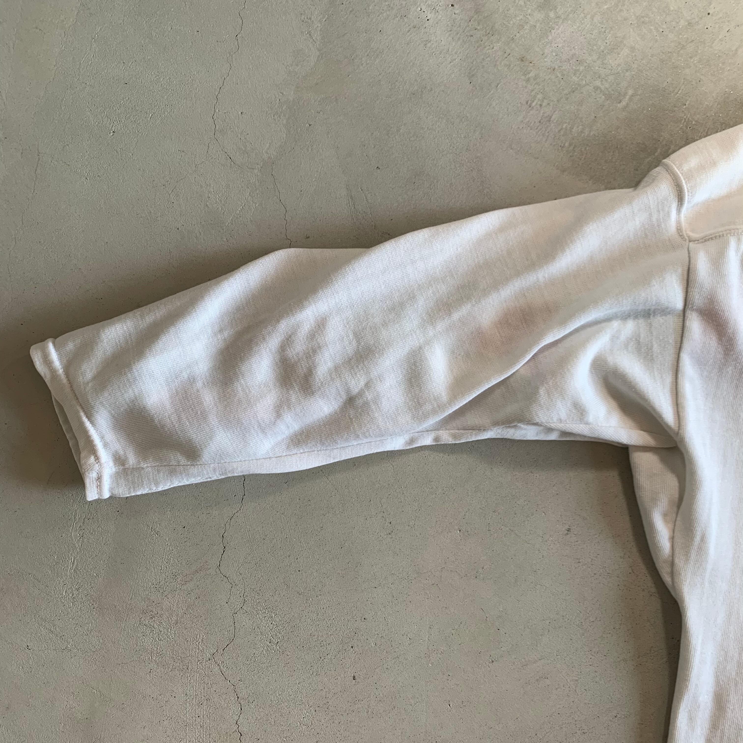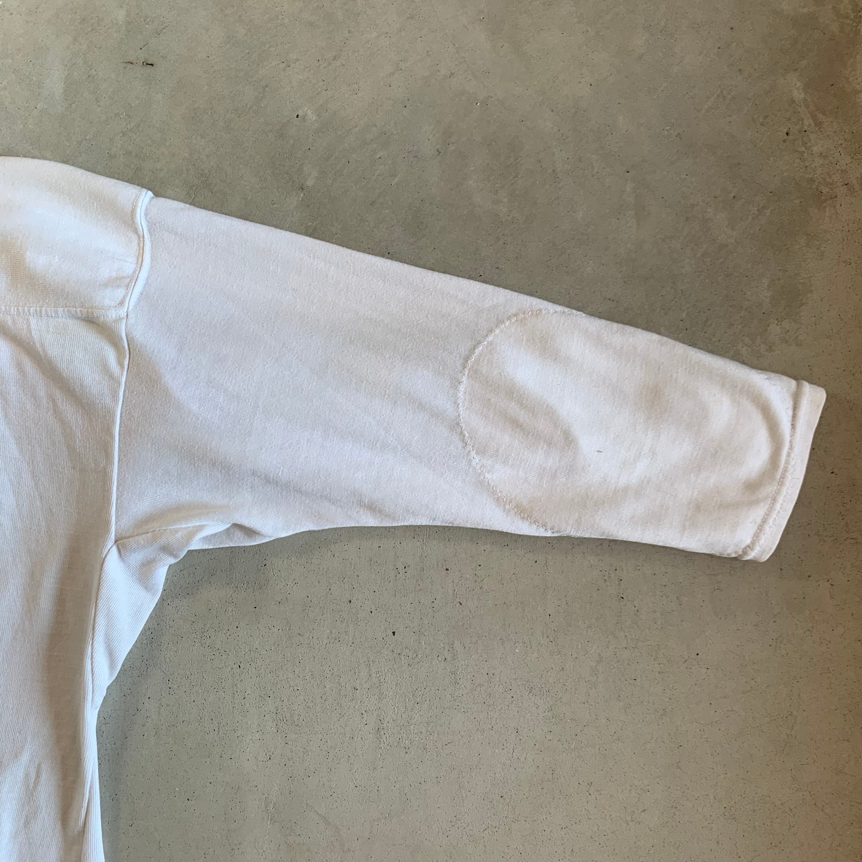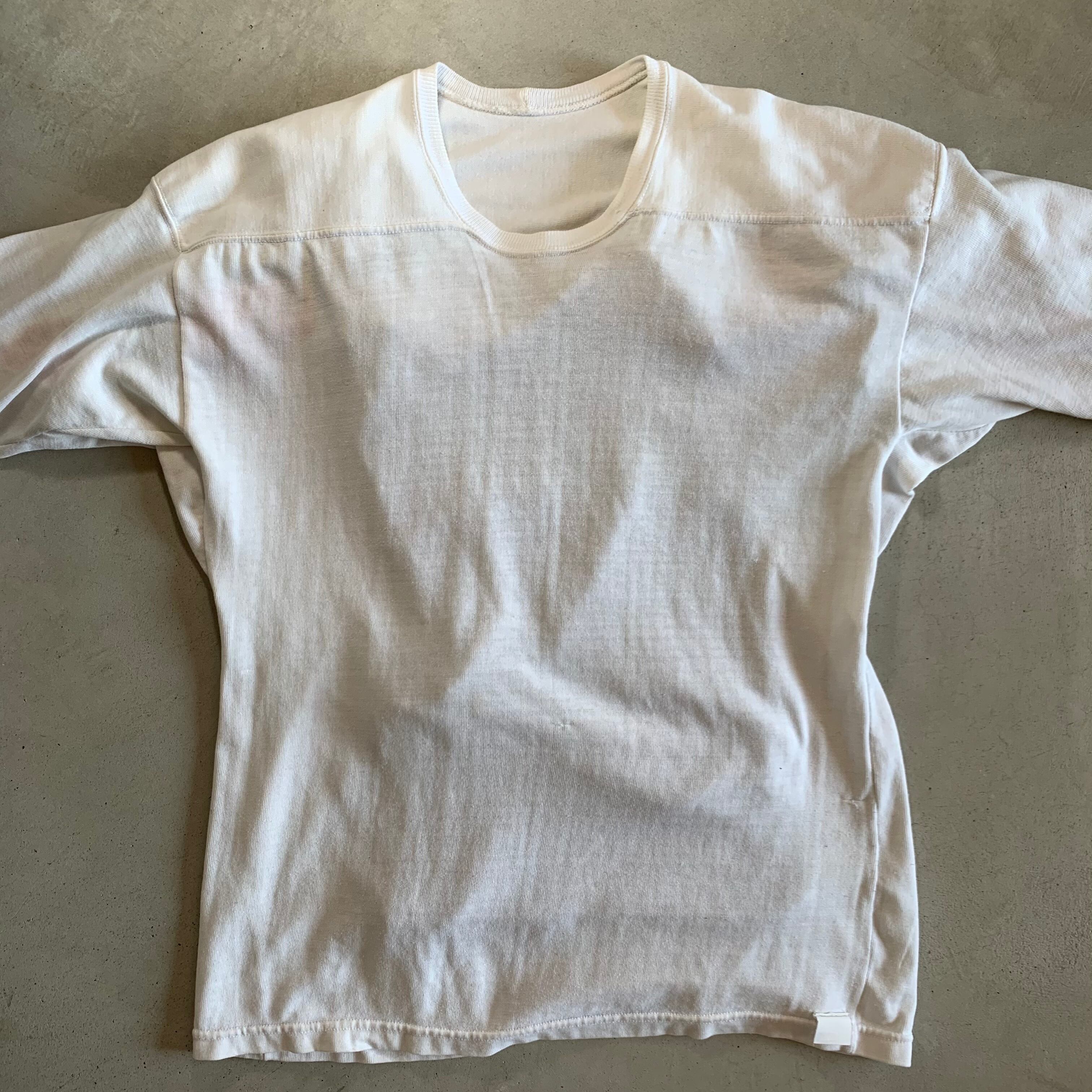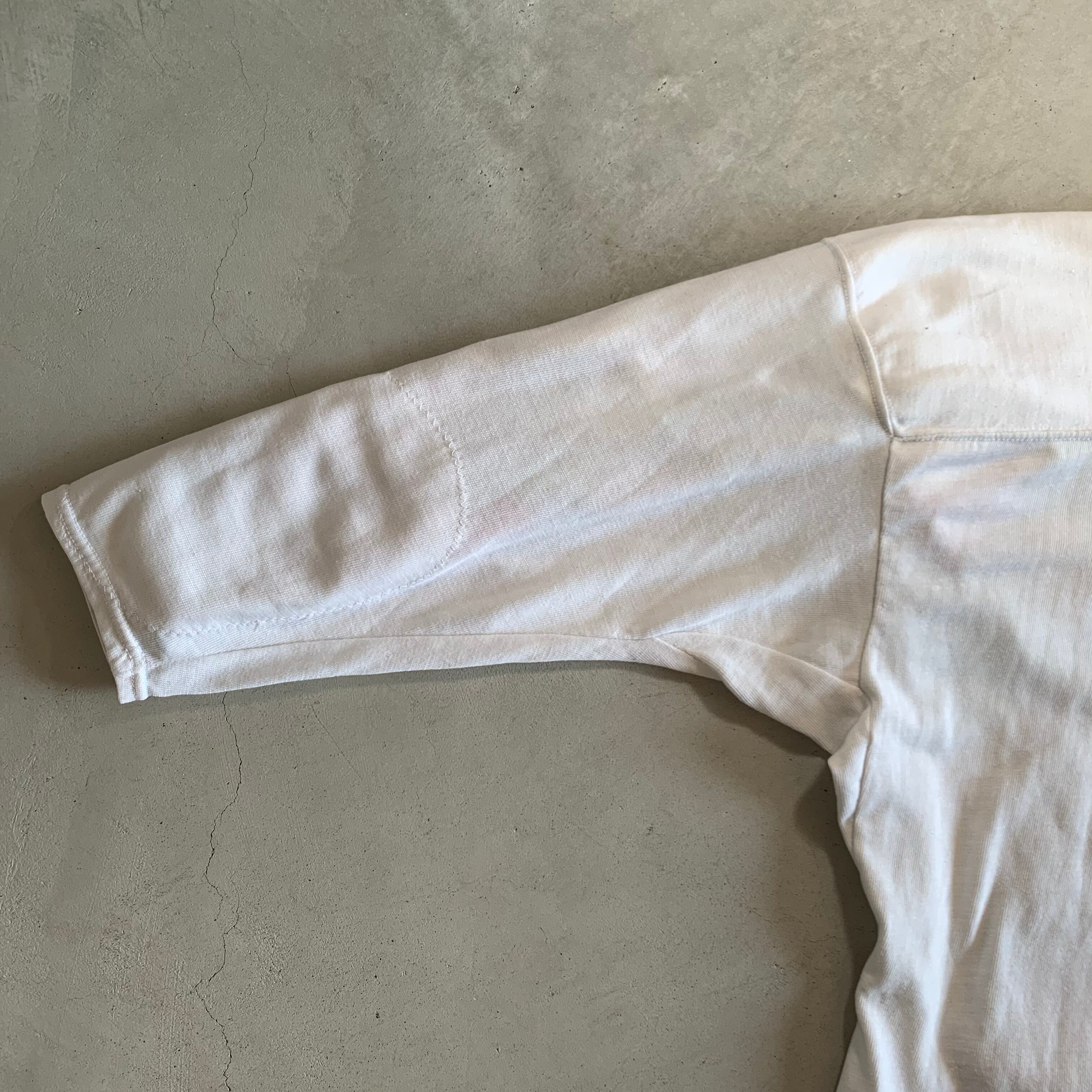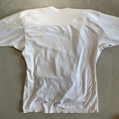 ヴィンテージのフットボールTシャツはほとんどがロゴかナンバリングが入っておりますが、こちらは珍しい無地のフットボールTシャツです。無地ですので色々なコーデに取り入れやすいです。サイズ感は大きめなので、昨今のトレンドにも取り入れやすいデザインです。素材はポリ100%かと思います。タグはありますが文字が消えてしまい判読できません。