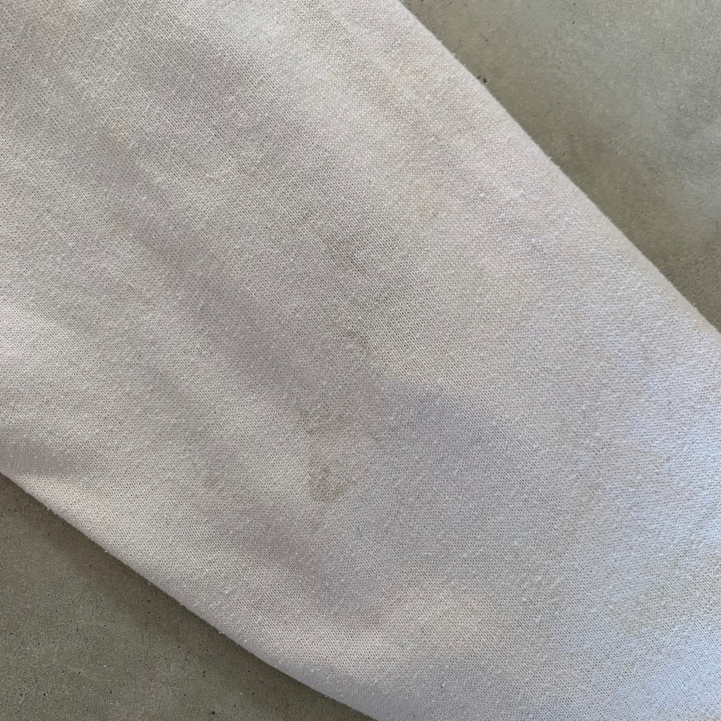 ロゴのプリントから色が滲んでます。あと、所々にシミ汚れもございます。画像でご確認ください。