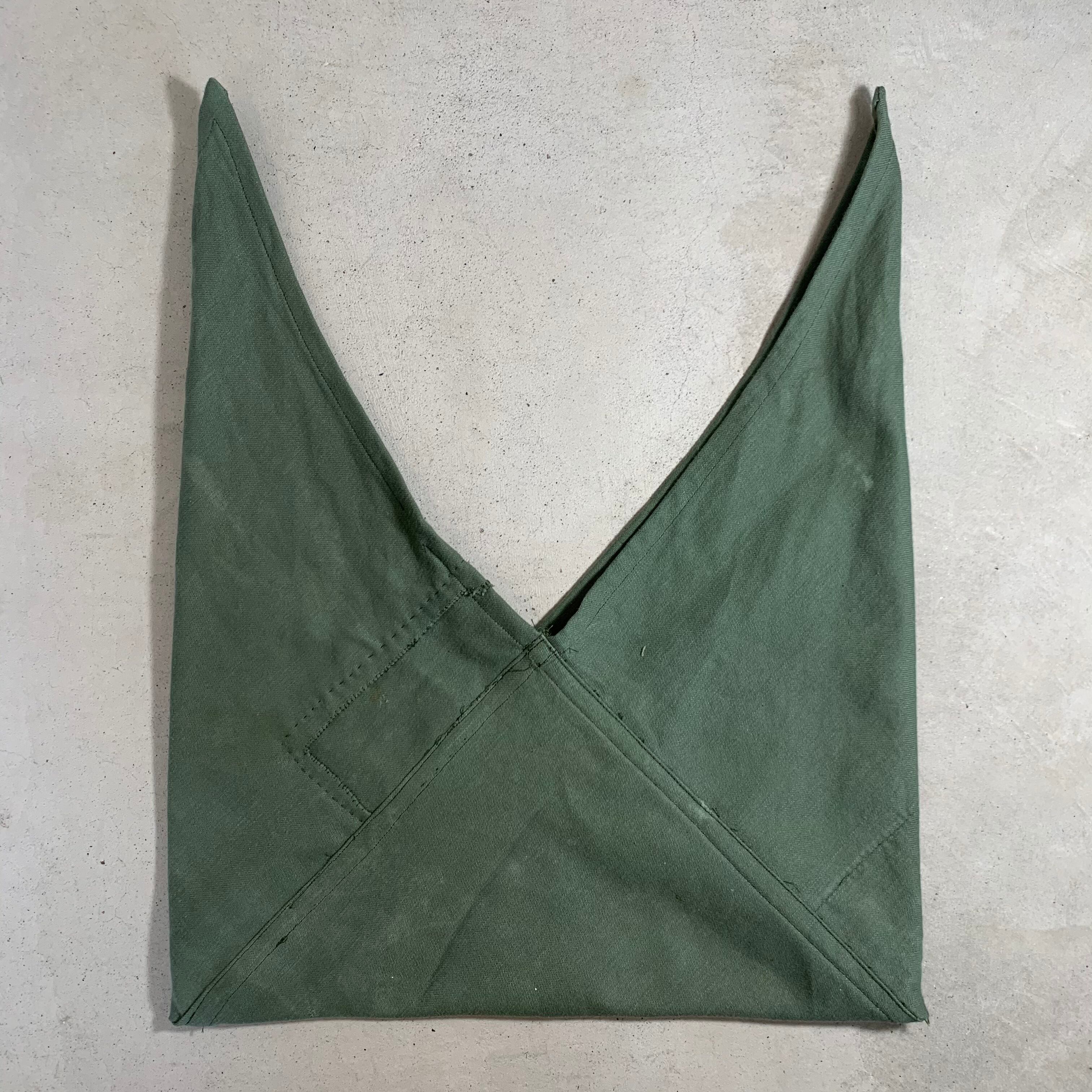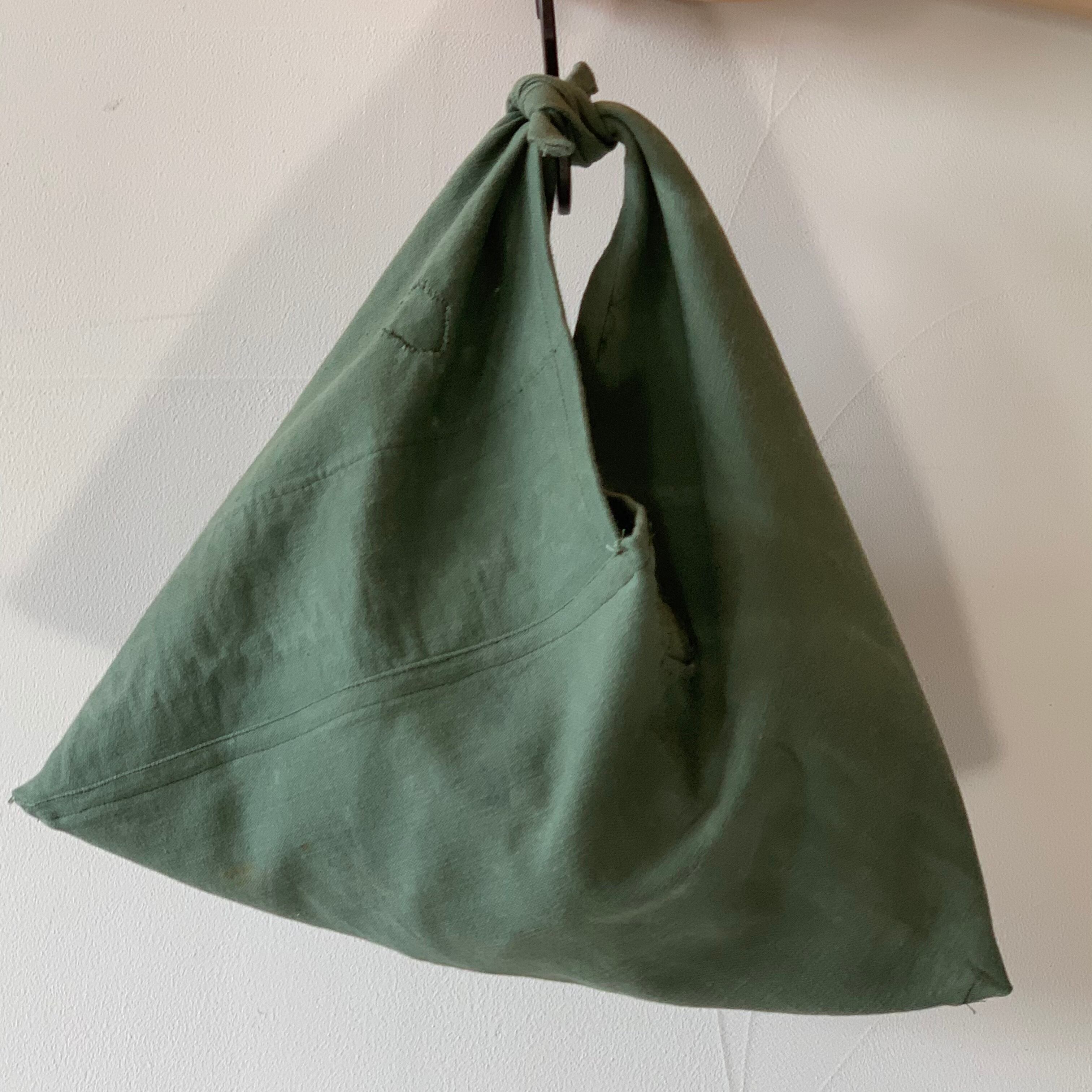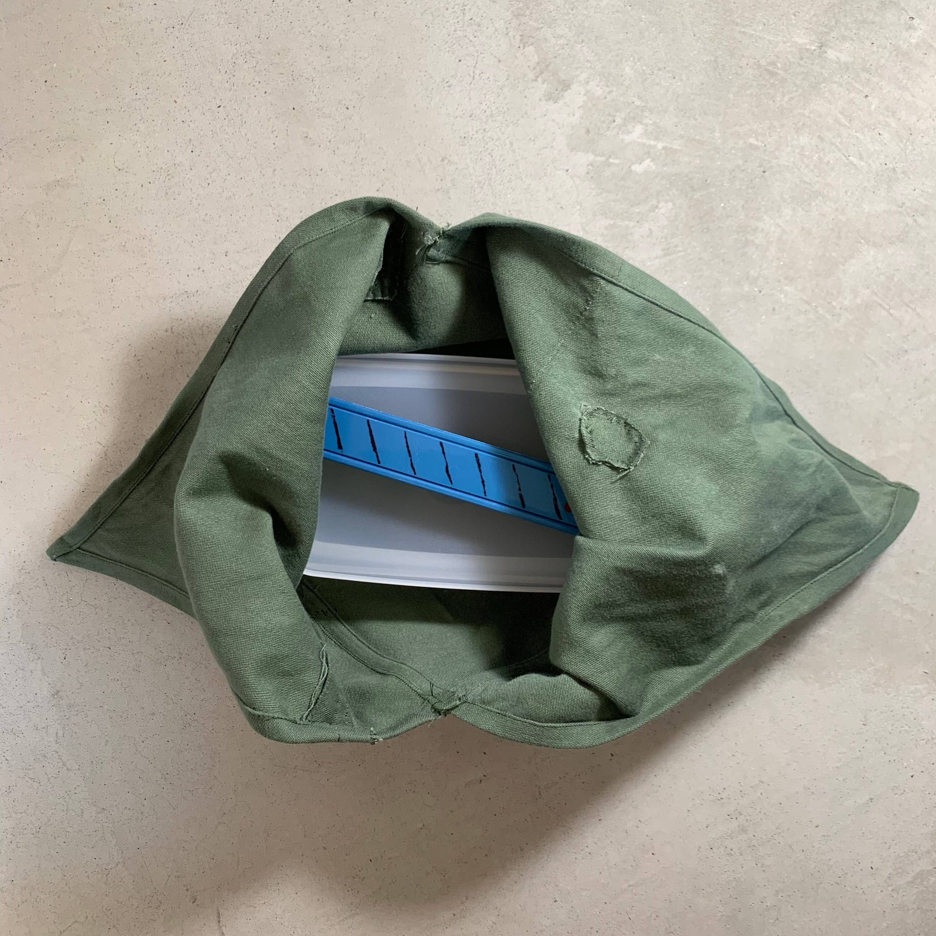 米軍の70年代のランドリーバッグを解体して作った、吾妻袋です。ダメージがあった箇所はパッチワークでツギハギをしてリペアしております。