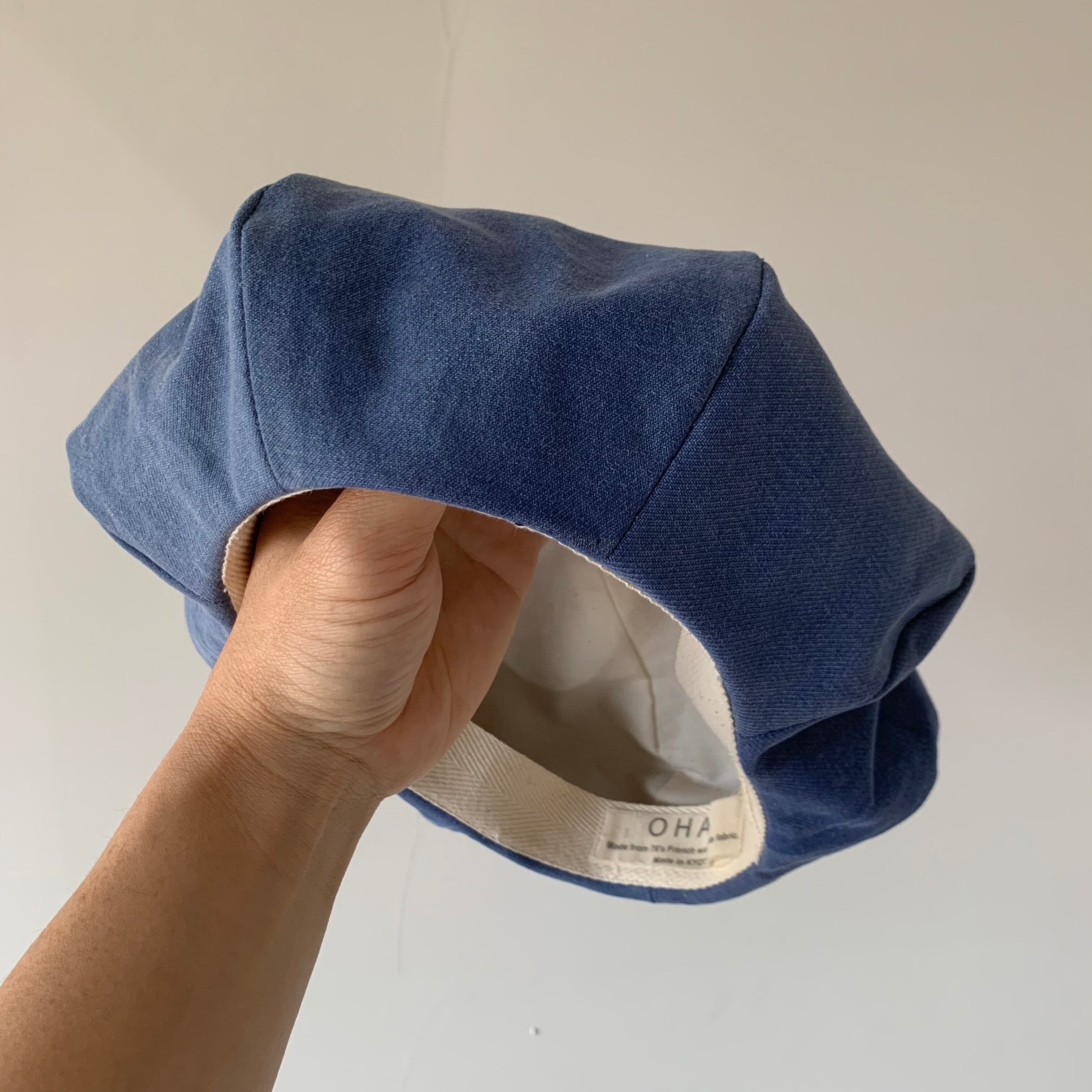 70年代のフレンチワークの生地を使用して8パネルのベレー帽をつくりました。フレンチワーク特有の色褪せたブルーがポイントです。大きめのデザインなので色々な被り方を楽しめます、
