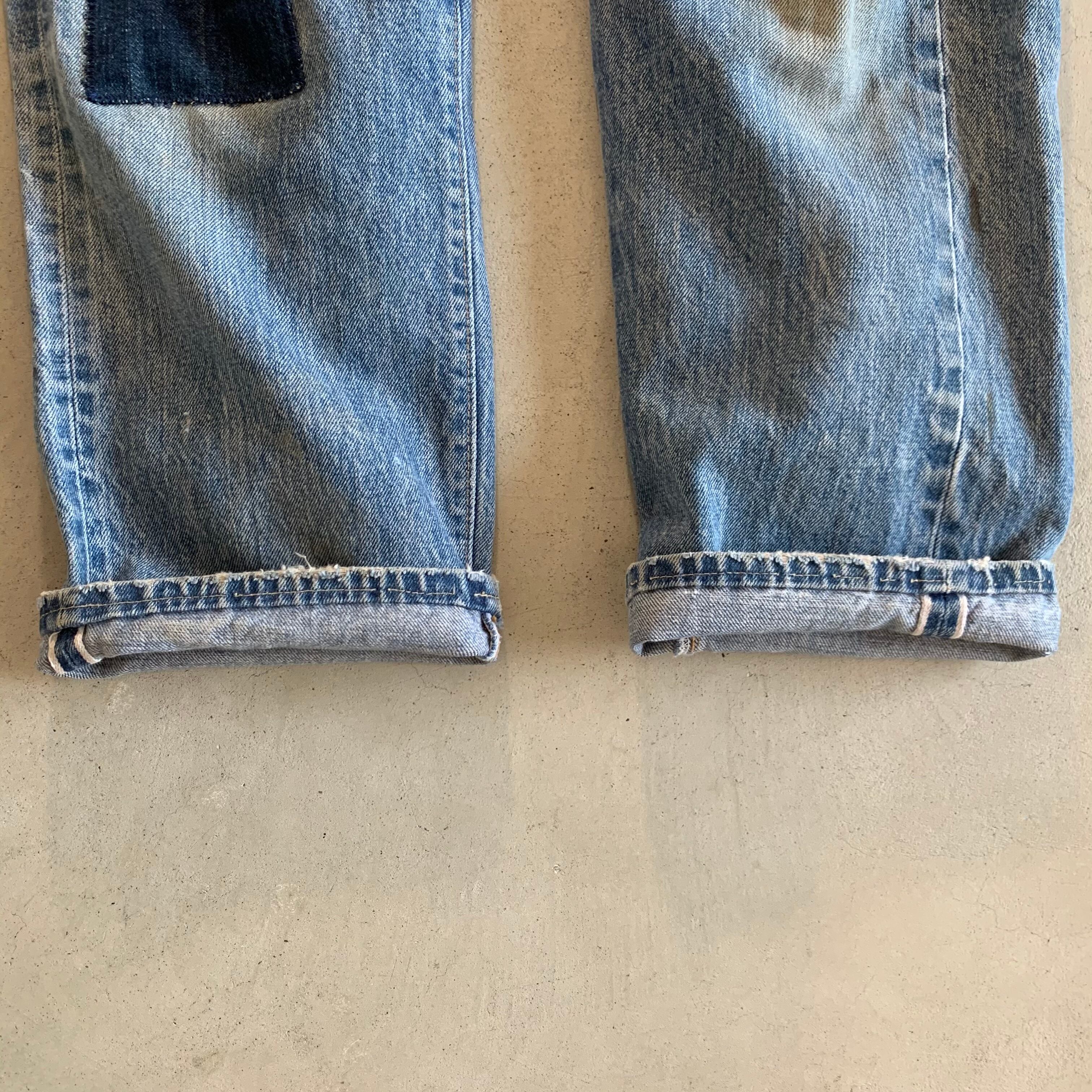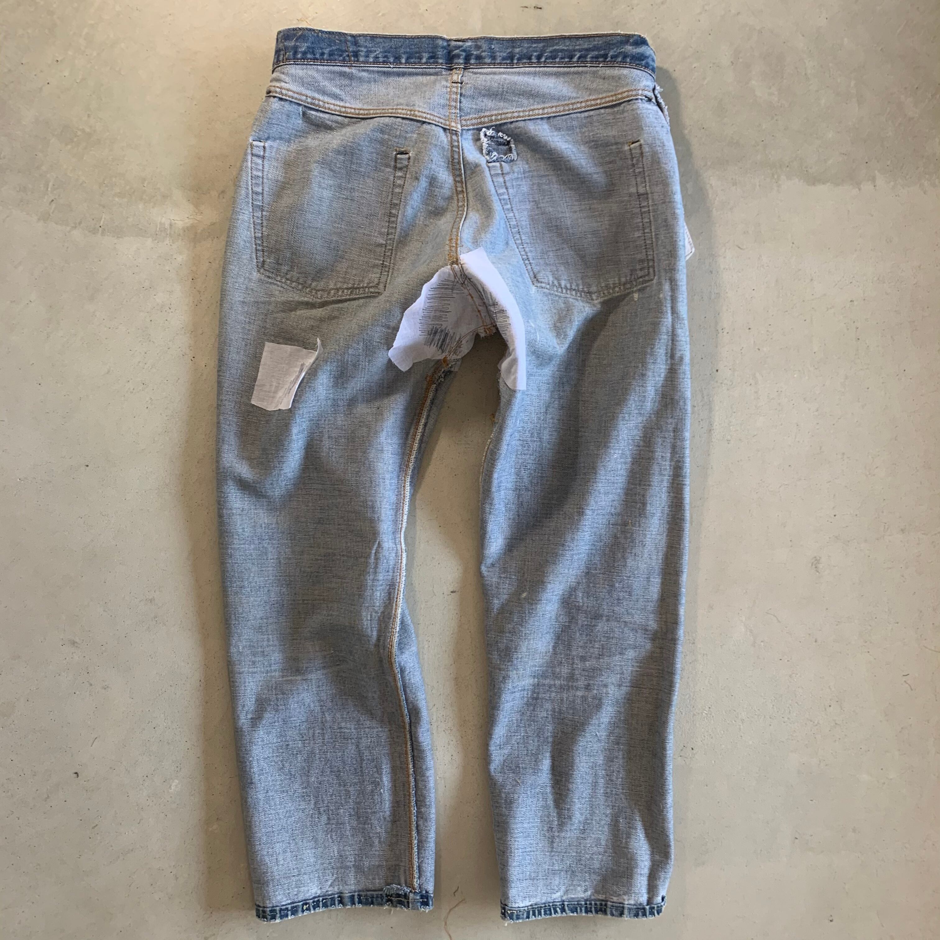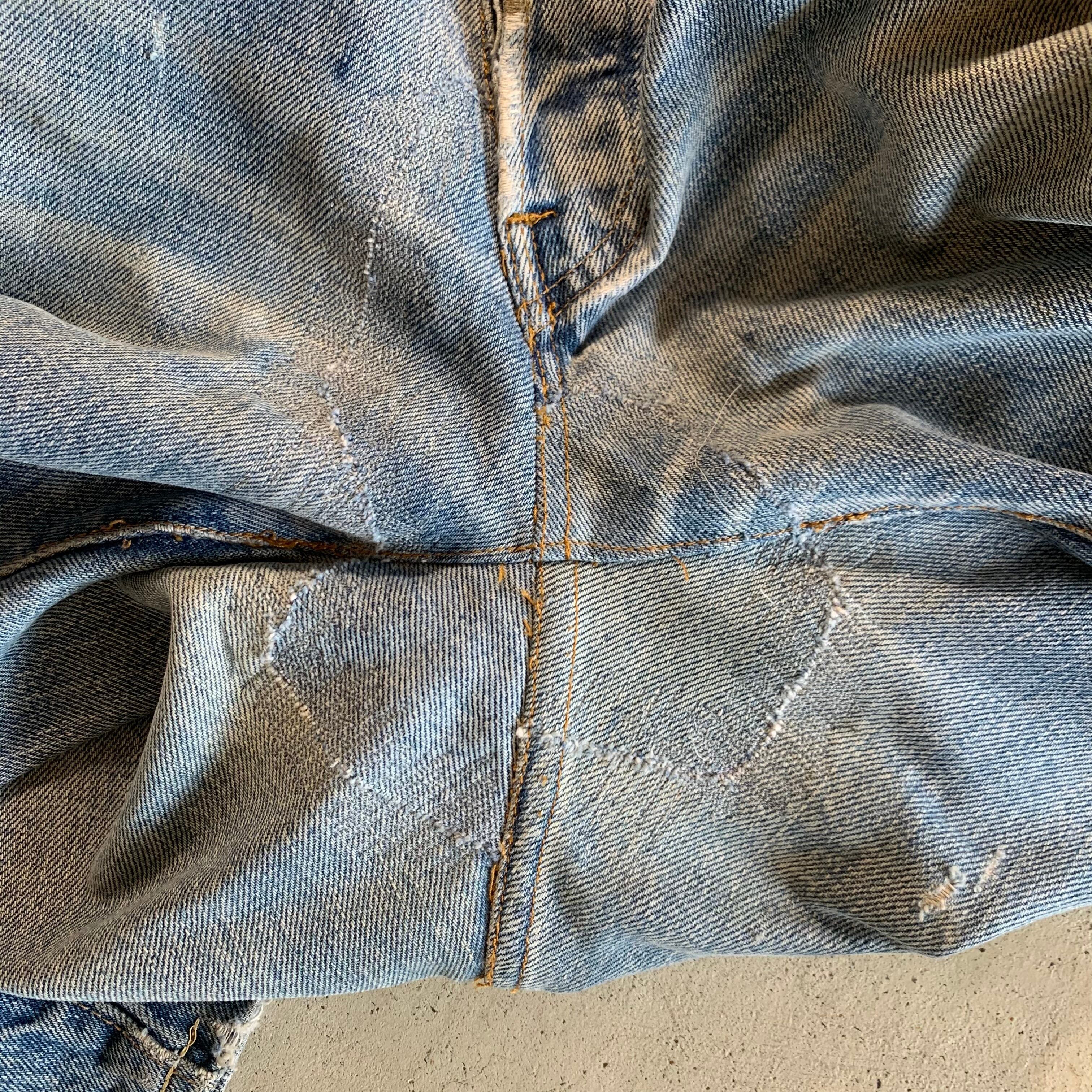 股のダメージが酷かったため別の501のデニムパンツから生地を移植してたたいて修繕(メンディング)しております。